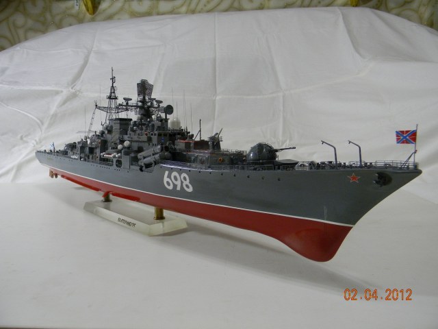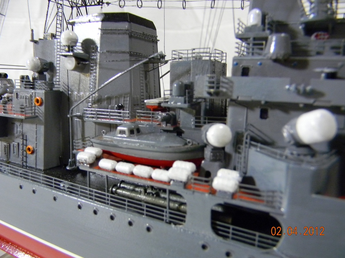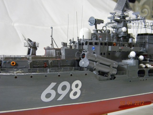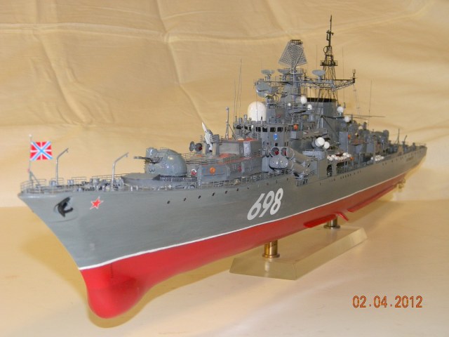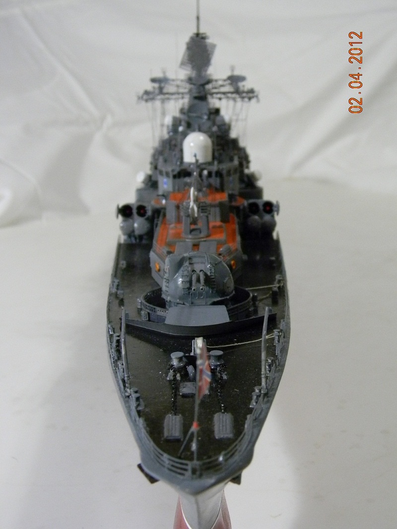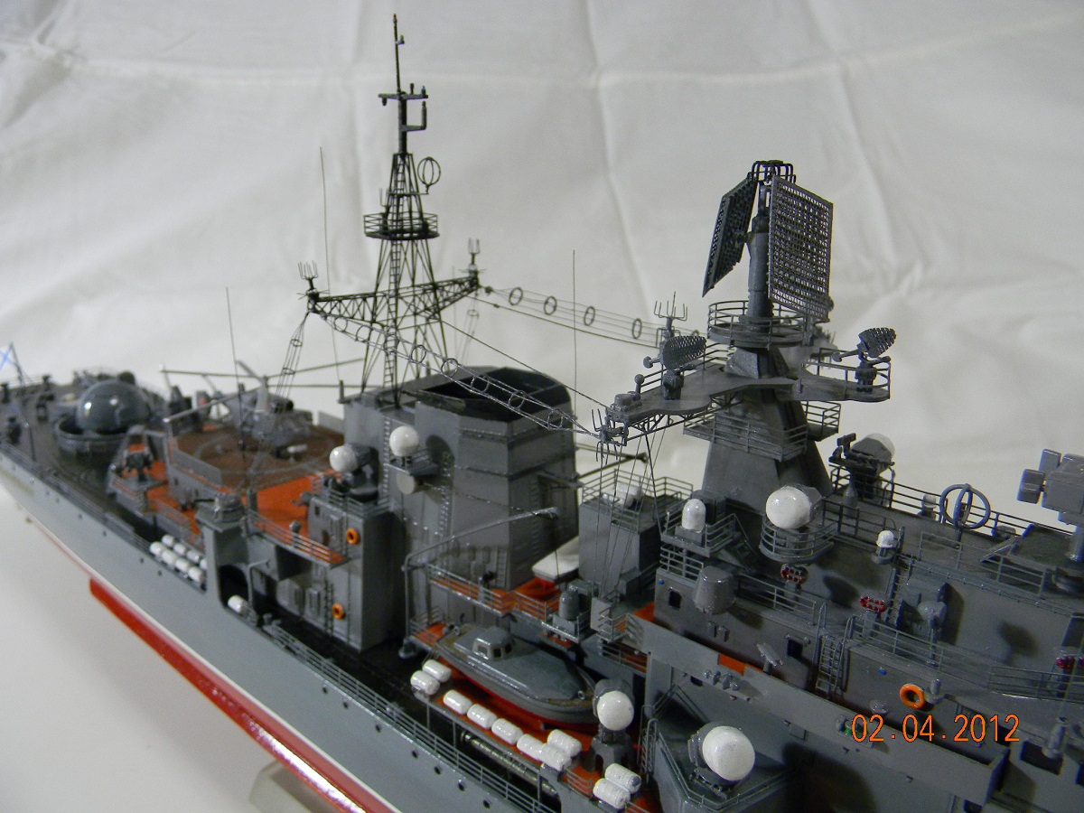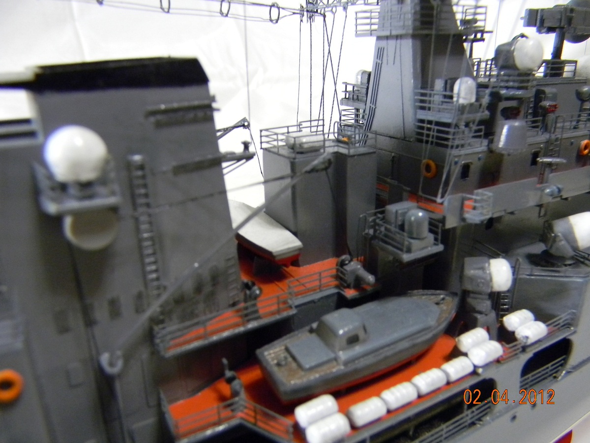 Коллеги,переходите на спреи.Баллончика хватит на пяток таких моделей.Да и краски сейчас есть и мат и сатин и номера РАЛовские...Очень обидно,хорошо собранная модель и покраска снижает качество.Такой черной палубы на 956-х не было.Она скорее вороненая.Очень рекомендую посмотреть побольше реальных фото.Их сейчас много.Ну,там типа якорная цепь белая,поручни ступеньки петли чуть-чуть оттонировать.Из замеченного: крышки якорных клюзов на палубе абсолютно не соответствуют.Леера и антенны-очень толстые,катер рабочий можно было бы и доработать.Тоже по фото.Он очень симпатишный в реале.Вообще пройтись с кисточкой и набором серых цветов.И все задуть матовым лаком,опять же из баллончика.Очень помогает.