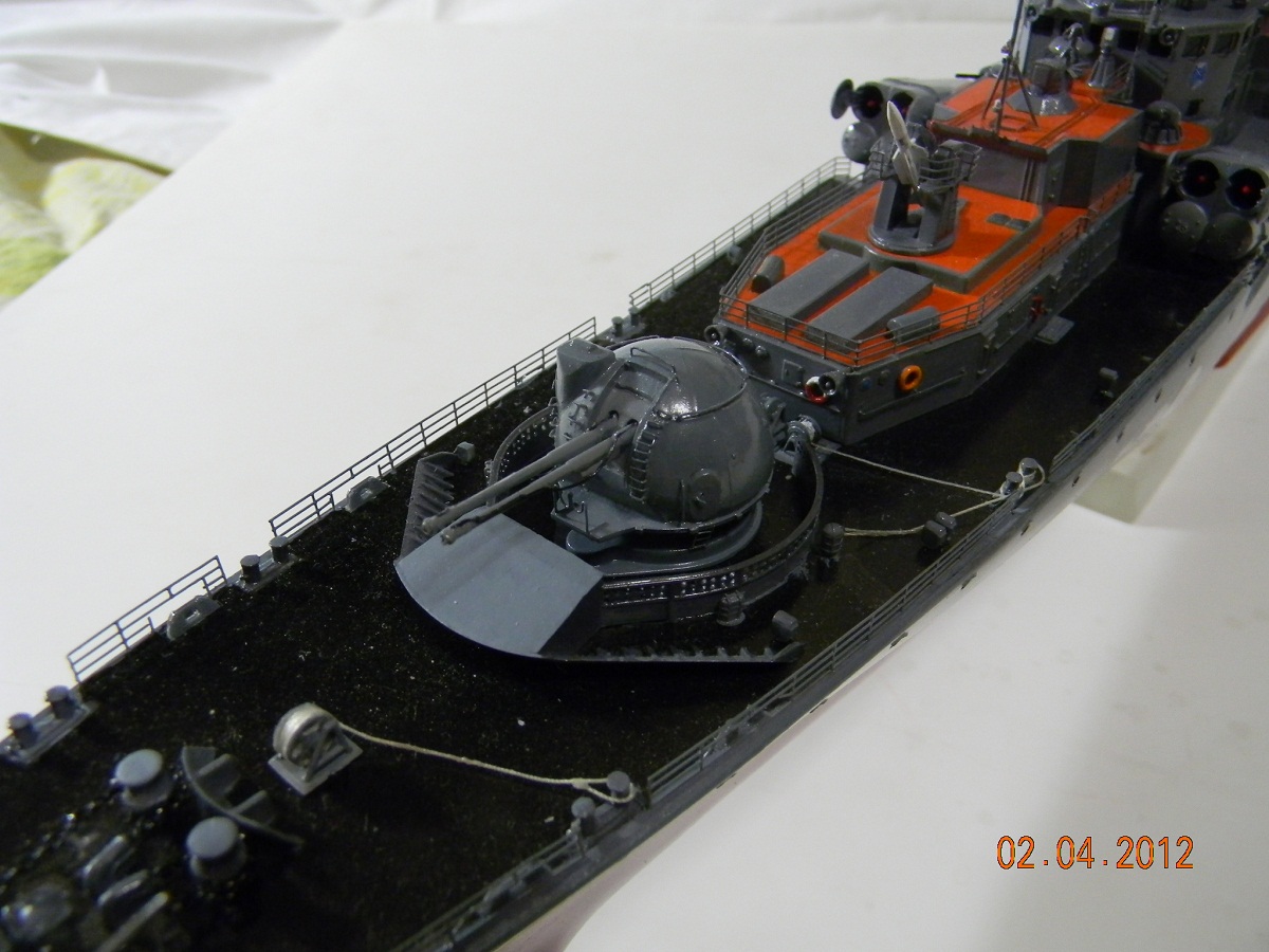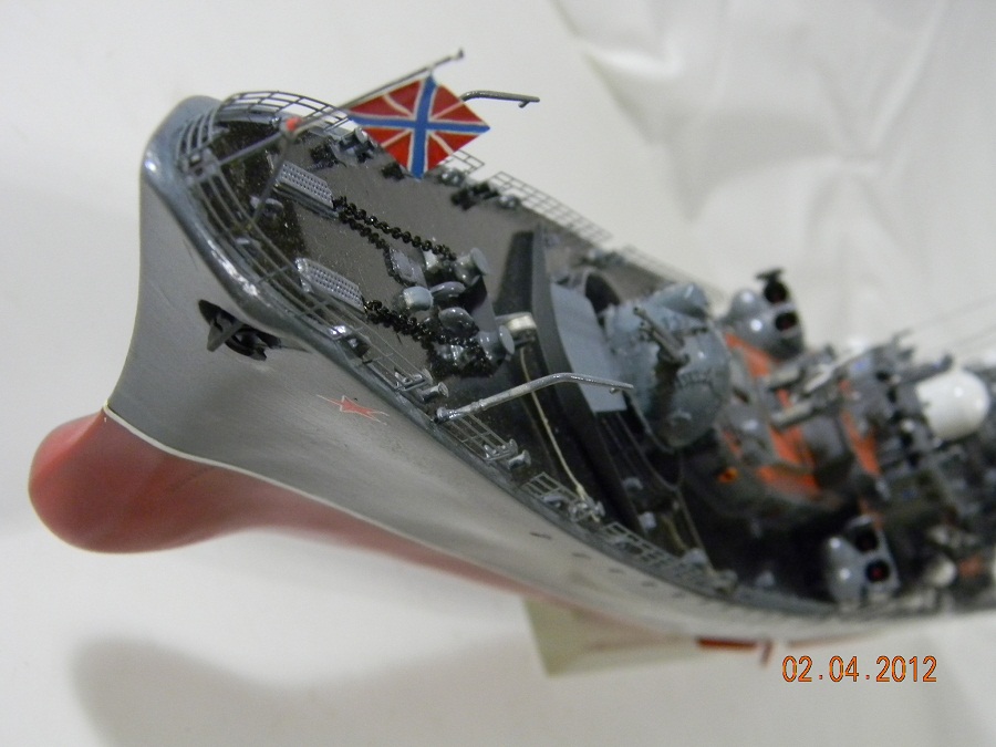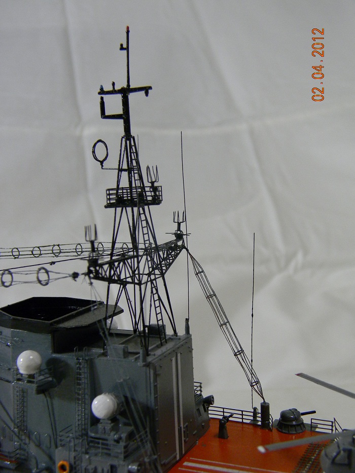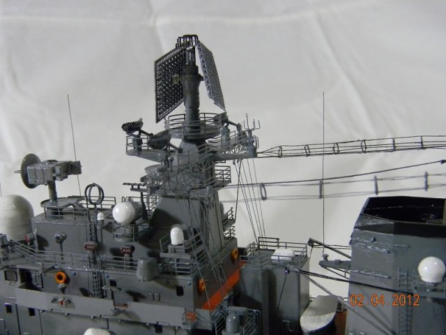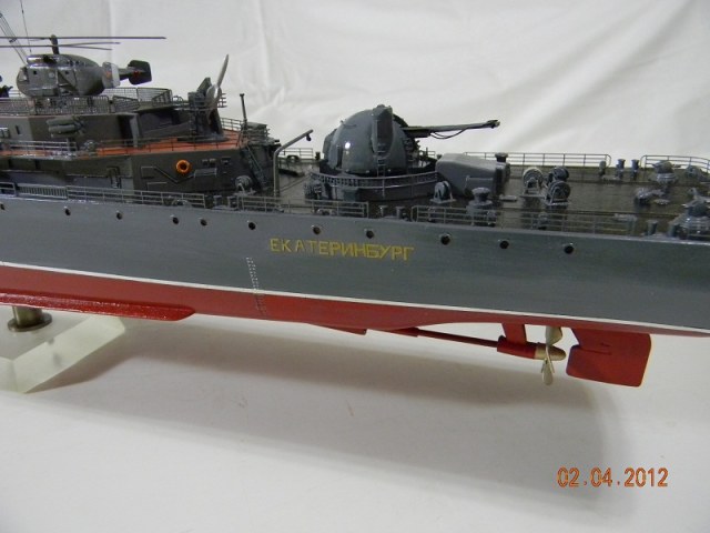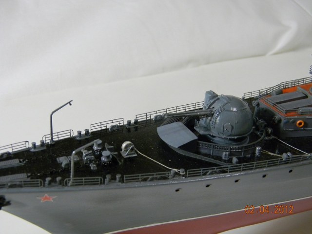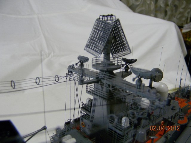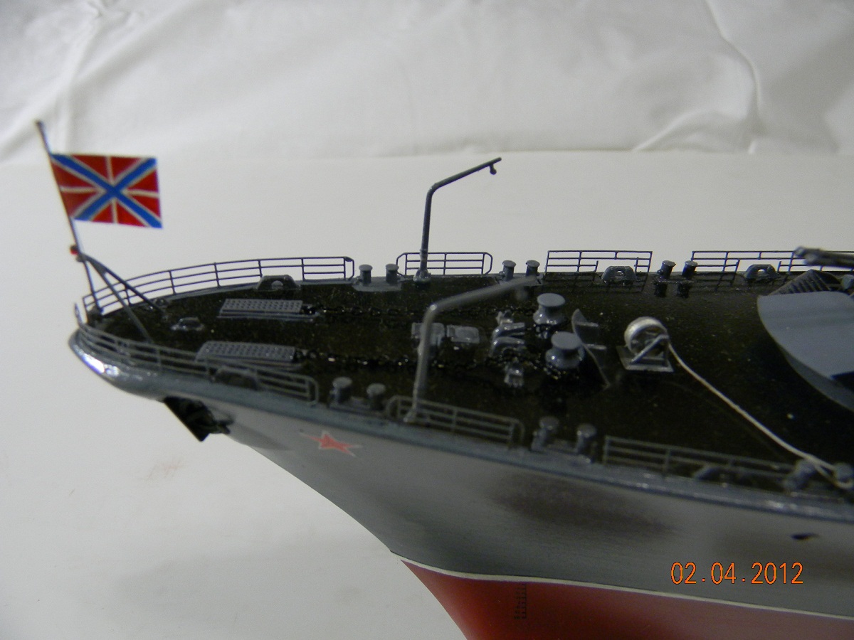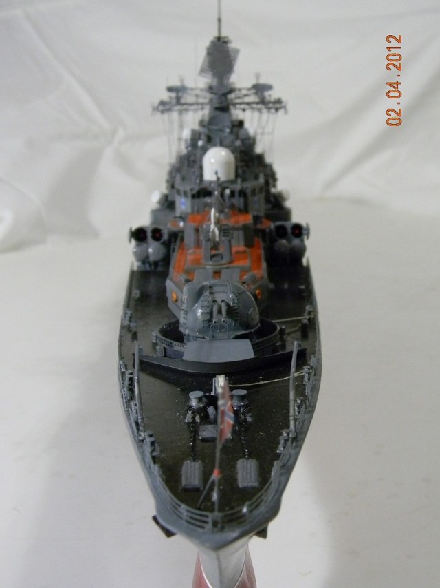 Коллеги,переходите на спреи.Баллончика хватит на пяток таких моделей.Да и краски сейчас есть и мат и сатин и номера РАЛовские...Очень обидно,хорошо собранная модель и покраска снижает качество.Такой черной палубы на 956-х не было.Она скорее вороненая.Очень рекомендую посмотреть побольше реальных фото.Их сейчас много.Ну,там типа якорная цепь белая,поручни ступеньки петли чуть-чуть оттонировать.Из замеченного: крышки якорных клюзов на палубе абсолютно не соответствуют.Леера и антенны-очень толстые,катер рабочий можно было бы и доработать.Тоже по фото.Он очень симпатишный в реале.Вообще пройтись с кисточкой и набором серых цветов.И все задуть матовым лаком,опять же из баллончика.Очень помогает.