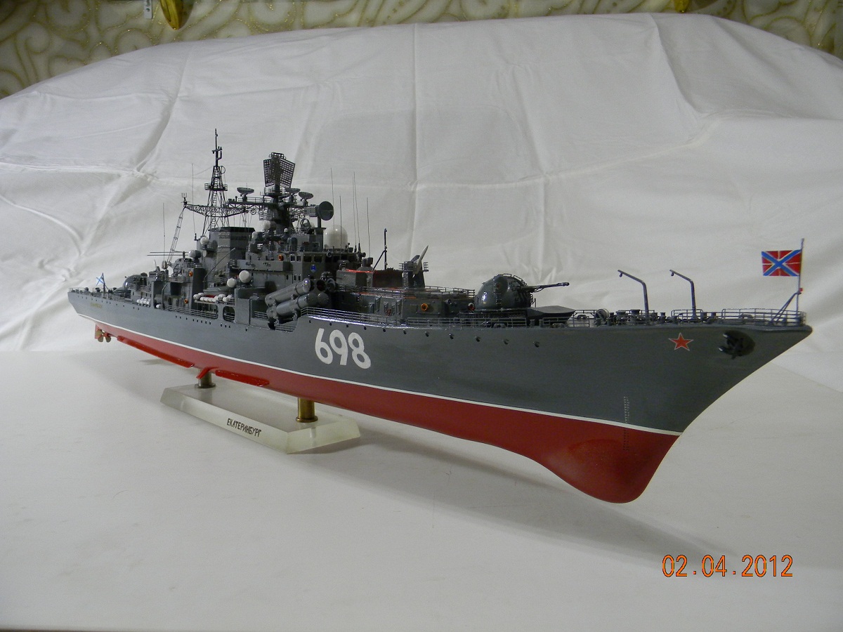 Эсминец при закладке получил имя " Важный ". Впоследствии перед спуском на воду 30.04 1991г. получил имя " Екатеринбург " и достраивался на плаву по проэкту 956-Э для КНР. Введен в строй и передан ВМС КНР где получил название " ХАНЬ-ЧЖОУ " .До китая шел под бортовым номером 698 " Екатеринбург ". затем уже на месте был установлен в сухом доке - перекрашен в цвета ВМС КИТАЯ и получил бортовой № 136. По самий модели : масштаб 1:200 , длина почти 800 мм собирал ЕГО почти 2 года использовал травление что было в коробке (WEM почемуто отказало в заказе )из своего добавил трапы скобовые, поручни и заменил локаторы на сетку , спаял антены, вырезал название из золотистого винила , и также была вырезана ватерлиния из белой самоклеящейся пленки. Приятного просмотра , ( и очень большая просьба - табуретки не сильно кидайте а то из монитора вылетают ! )