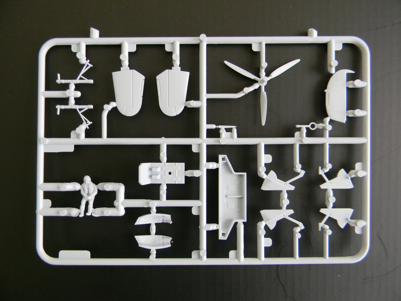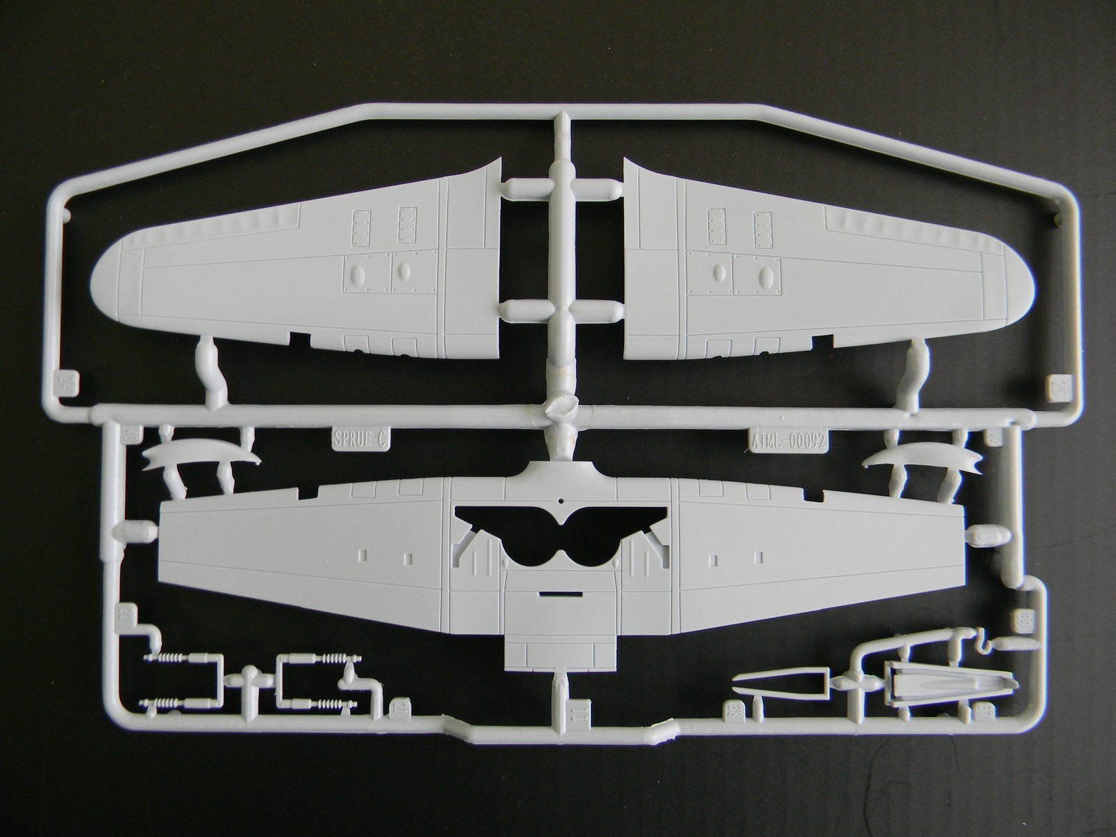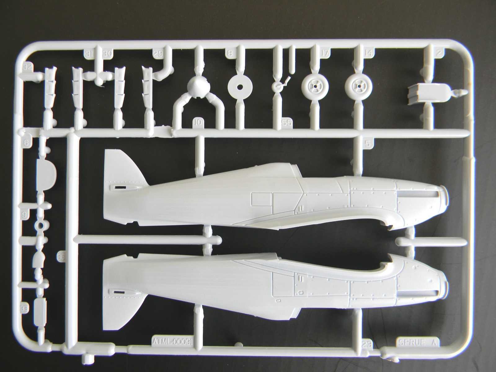 В красной коробке с верхней загрузкой лежат три литника серого пластика и один - прозрачного (фонарь). Облоя, утяжин и пр. нет, пластик относительно мягкий, обрабатывается хорошо. Шикарная декаль на три варианта, без смещения и искажения цветов. Фонарь не то, чтобы совсем тонкий, но и не толстый, как в тех же Спитфайрах. На этом достоинства заканчиваются, и начинаются недостатки.