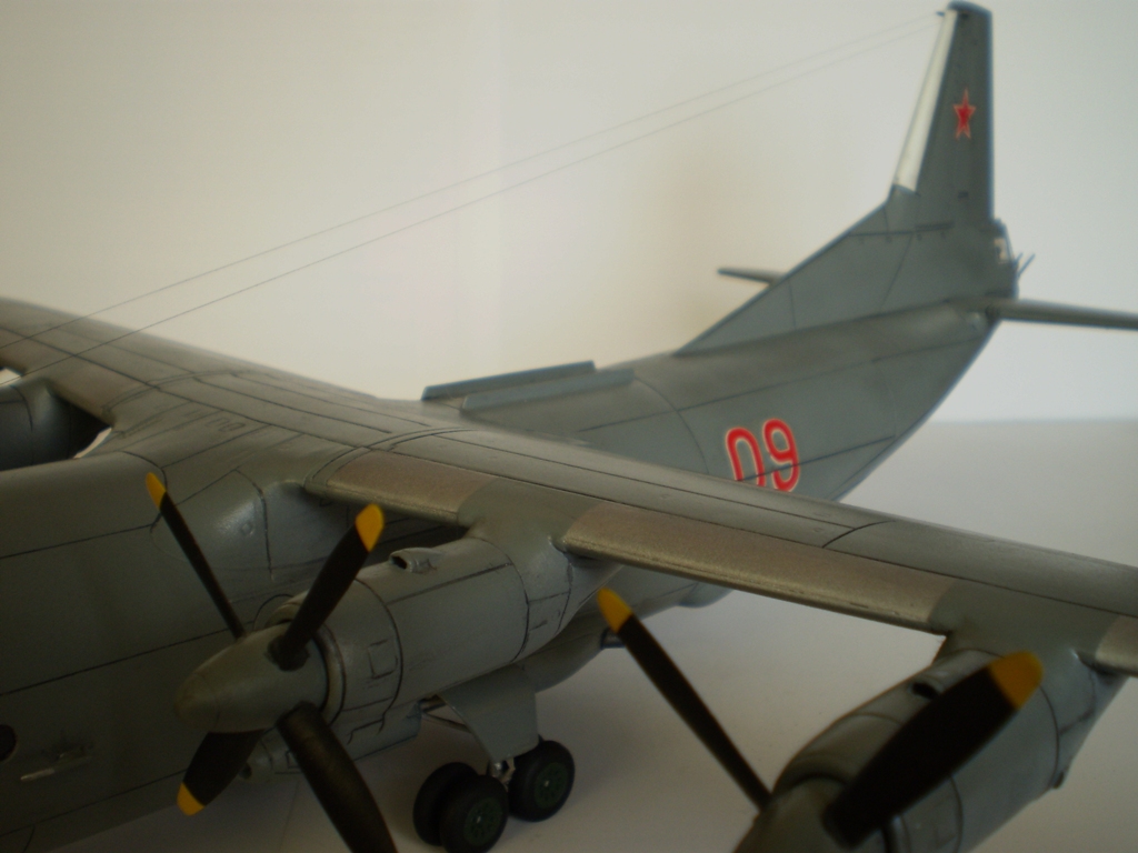 Доброго здоровья, уважаемые коллеги! Не сочтите за наглость... Вы ещё не успели прийти в себя от моего Су-17, а я тут как тут с новым поленом (в плане исполнения его мною)!!! Известная модель от украинского производителя "Роден", досталась мне в подарок от заместителя гл. инженера ГП "Антонов" Гавриленко В.В., за что огромное ему спасибо!!! Я, как резкий парень, очень поверивший в свои силы с головой бросился в работу, и как теперь мне показалось, Я ОЧЕНЬ ПОСПЕШИЛ!!! Подарок был получен мною в августе 2011 года. Навыки в сборке моделей только восстанавливались после более чем двадцатилетнего перерыва. Долбил я свой Ан-12 долго, уже и не вспомню сколько... Благо на работе затишье, период отпусков - и я самый главный. По причине криворукости возникли проблемы со стыковкой как половин так и задней - передней частей фюзеляжа. Без того не мелкую расшивку я сдуру ещё и углубил по - случаю приобретенным скрайбером. Вообщем - капут!!! Были офигенные планы относительно модели, но я довольно быстро "сдулся"... Модель перекрашивалась два раза, запорол все якобы матовым польским лаком. Окрашена аэрографом от компрессора типа "Слоник", краска - акрил "Тамия". За основу брался XF-25 и мешалось туда всего по - немногу... Подложку декалей победить не смог. В конце задул заморским дивом, "Футурой"!!! Из доработок - антенны из старых колготок супруги. Из "горбылей":