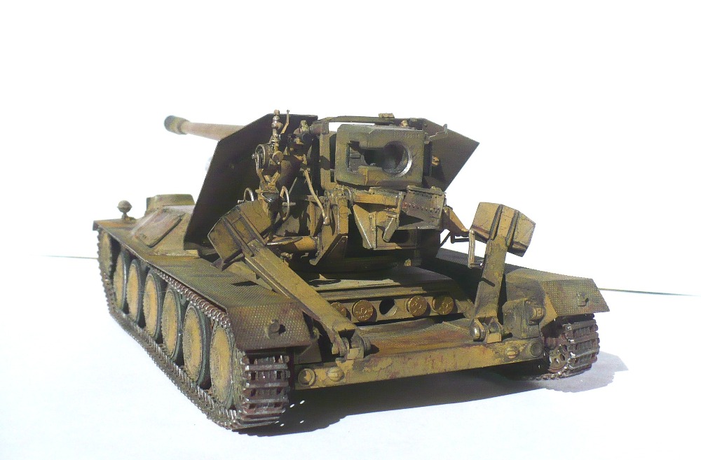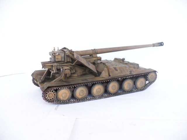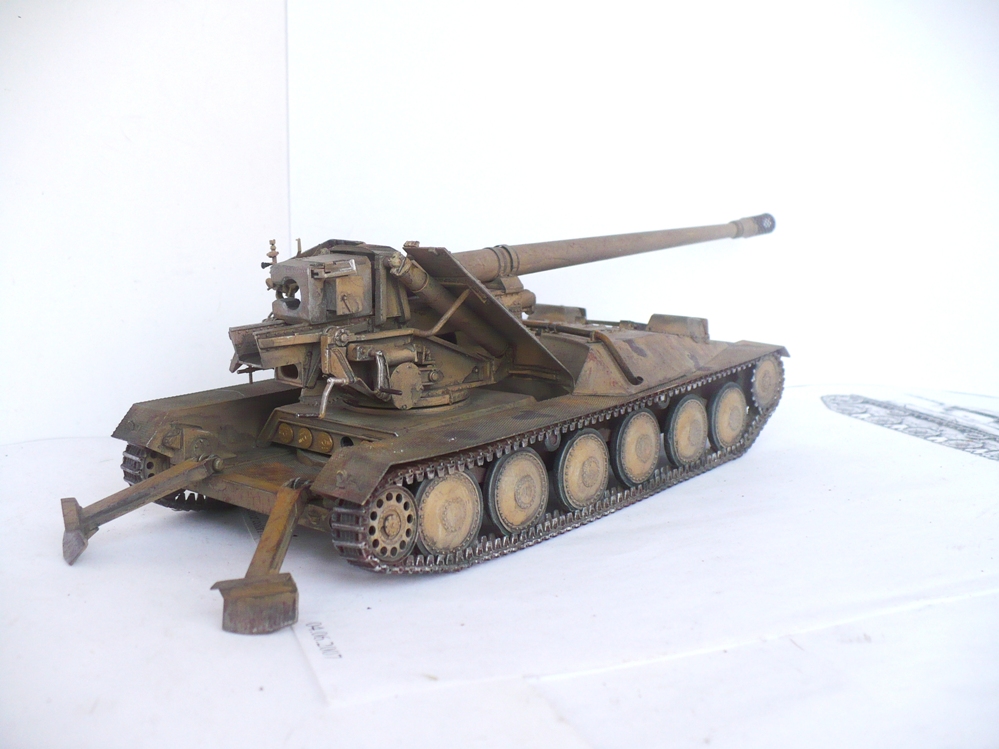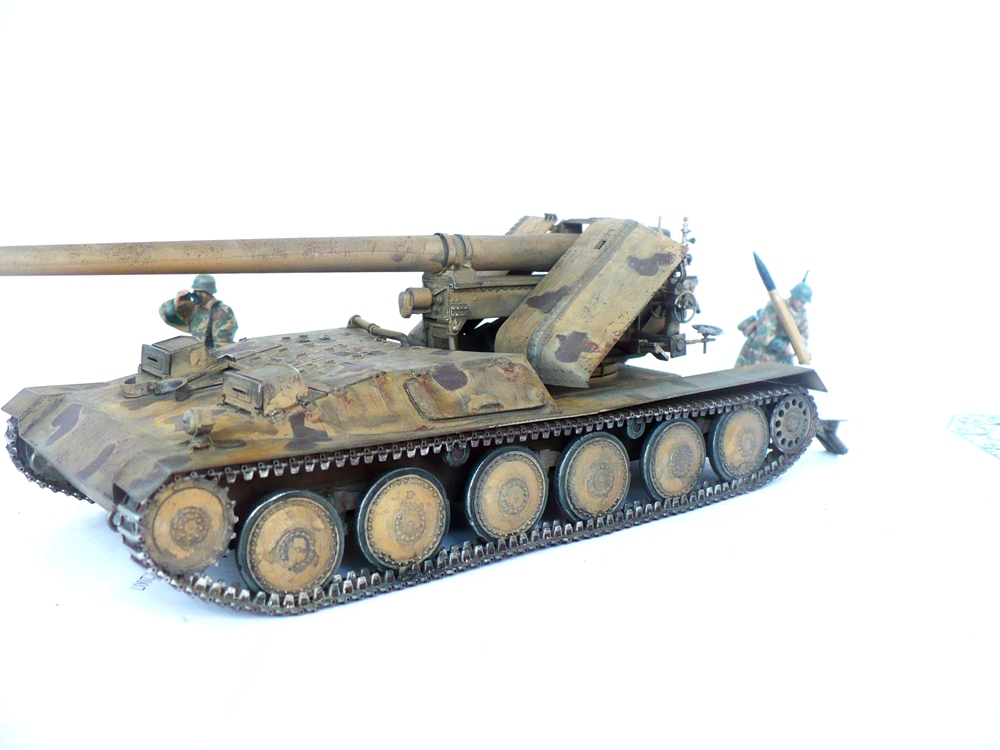 Всем доброго дня. Модель от Трумпетера, собиралась вполне прилично без проблемы. Крашен тамией. Модель из каробки.К концу Второй мировой войны, Германия начала производить 128мм орудия для истребления танков. Орудия устанавливались на базу Hetzer. Всего было выпущено несколько таких танков, но на исход войны они никак не смогли повлиять.(насчёт нескольких танков вопрос спорный)