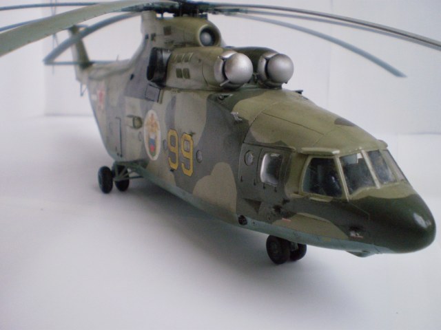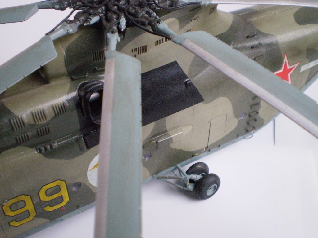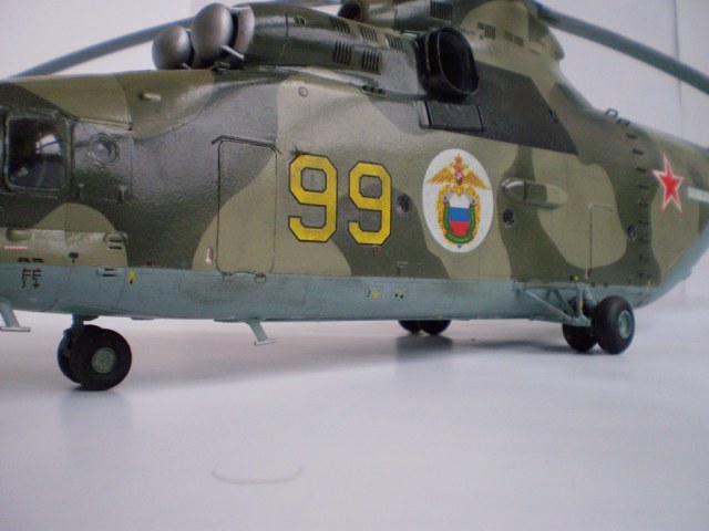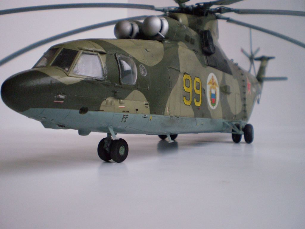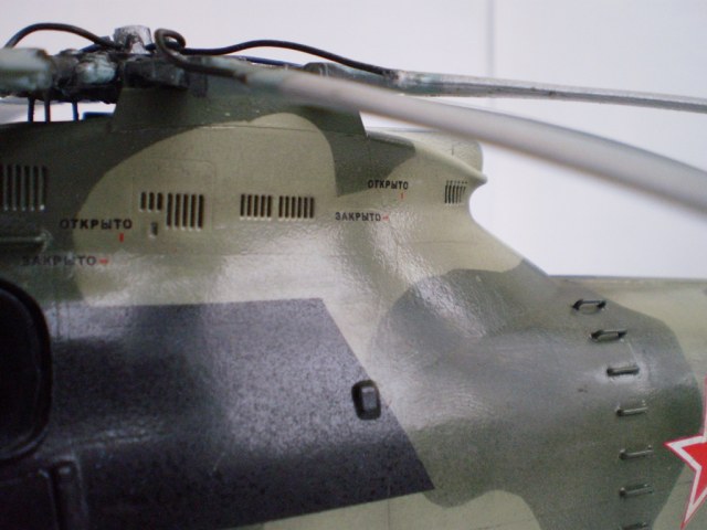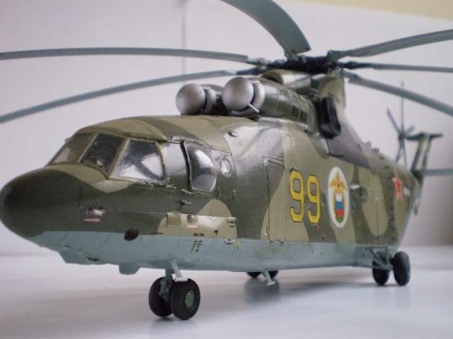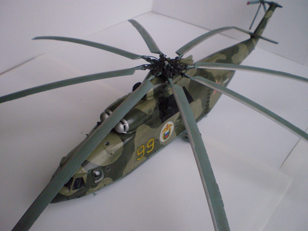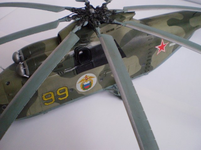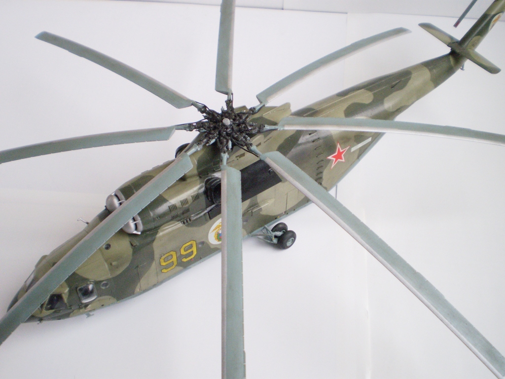 Извините за назойливость! Ми -26 "Звезда" - в студию!!! Модель собиралась в июне-июле 2011 года. Выбрал её, по причине размера, для того что бы было удобнее собирать. При сборке возникли проблемы со стыкуемостью в районе капотов редукторного отсека. Пришлось собирать шов частями, с перерывами на высыхание. Красился вертолёт акрилами "Тамия". Цвета готовые, марок не помню. Краска наносилась при помощи примитивного аэрографа питаемого от компрессор типа "Слоник". Поверху была задута лаком из баллона, который почему - то дал эффект лёгкой потёртости краски (под пятнами камо проступил основной цвет). Декаль - штатная "Звезда". Камо - по мотивам. Сделал смывку на втулках НВ и РВ. На втулке НВ добавлены электрожгуты. Остатки кроя пытался выделить простым карандашом. Готов слушать критику.