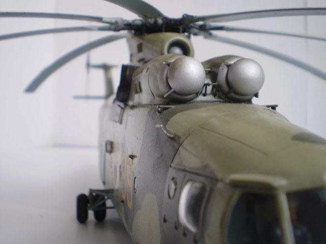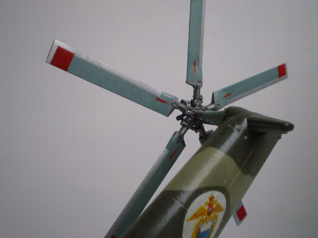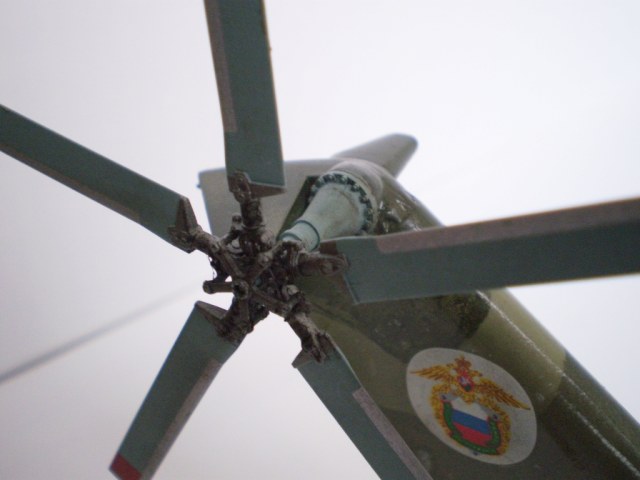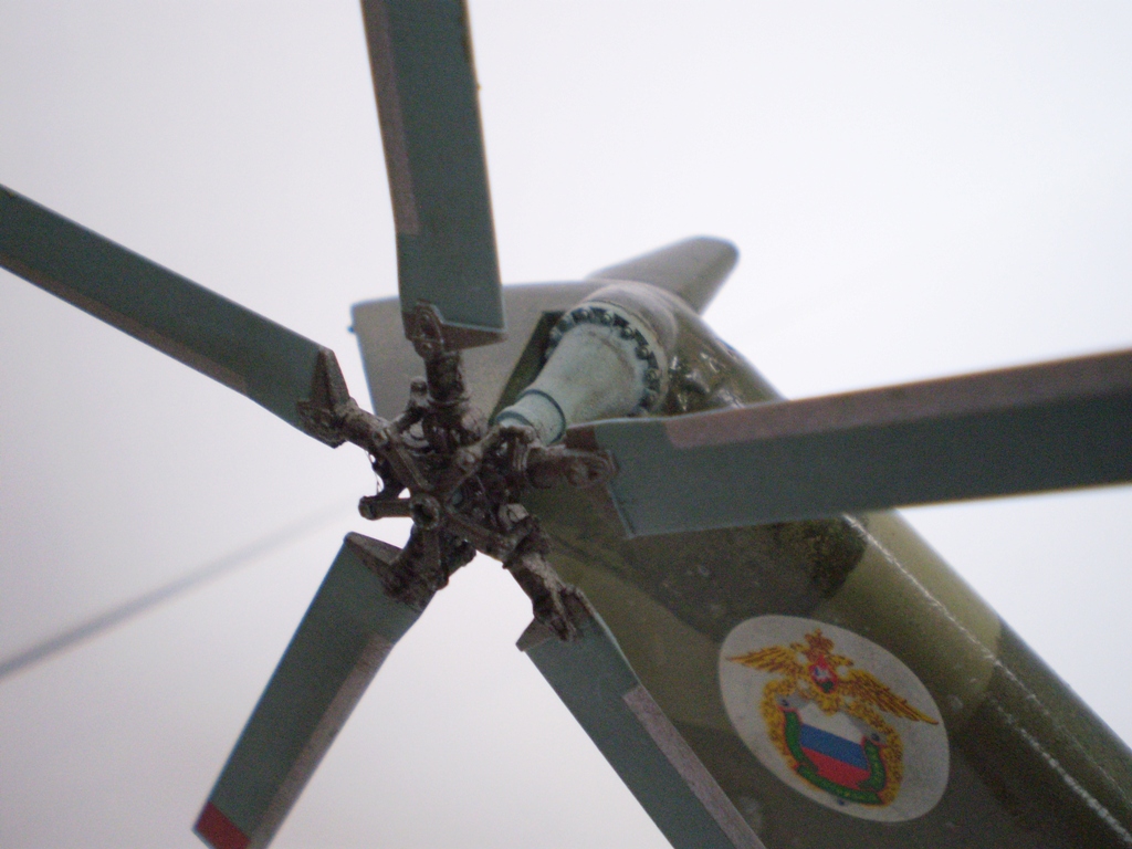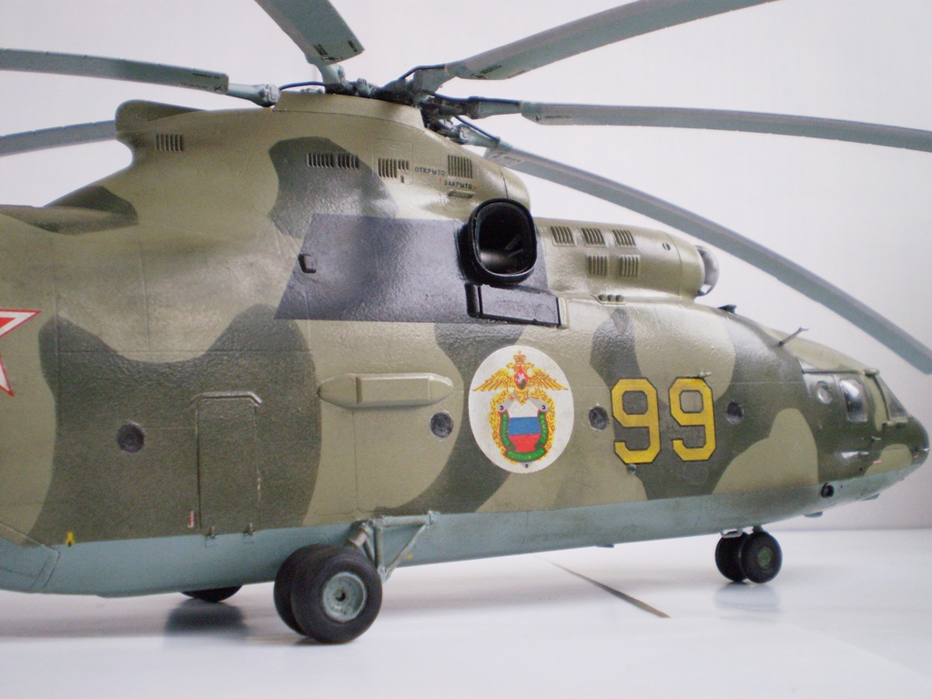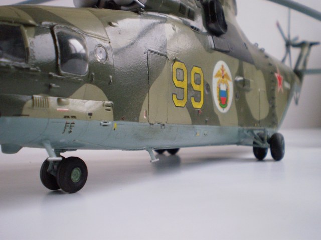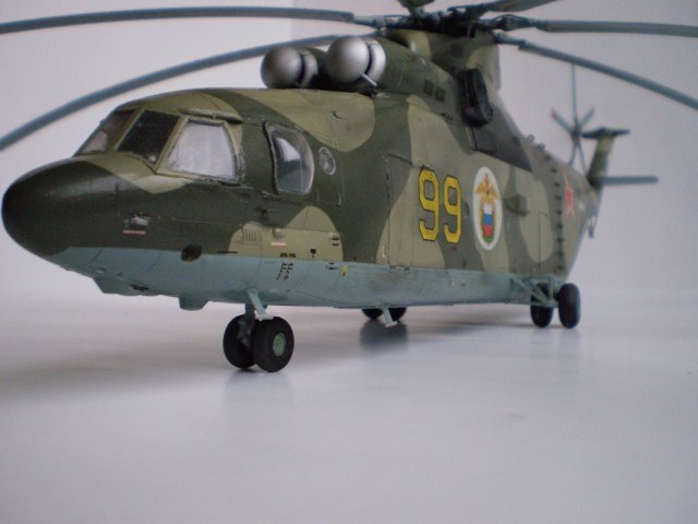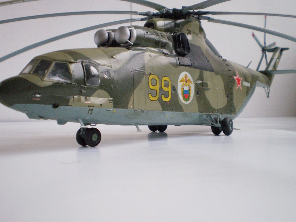 Извините за назойливость! Ми -26 "Звезда" - в студию!!! Модель собиралась в июне-июле 2011 года. Выбрал её, по причине размера, для того что бы было удобнее собирать. При сборке возникли проблемы со стыкуемостью в районе капотов редукторного отсека. Пришлось собирать шов частями, с перерывами на высыхание. Красился вертолёт акрилами "Тамия". Цвета готовые, марок не помню. Краска наносилась при помощи примитивного аэрографа питаемого от компрессор типа "Слоник". Поверху была задута лаком из баллона, который почему - то дал эффект лёгкой потёртости краски (под пятнами камо проступил основной цвет). Декаль - штатная "Звезда". Камо - по мотивам. Сделал смывку на втулках НВ и РВ. На втулке НВ добавлены электрожгуты. Остатки кроя пытался выделить простым карандашом. Готов слушать критику.
