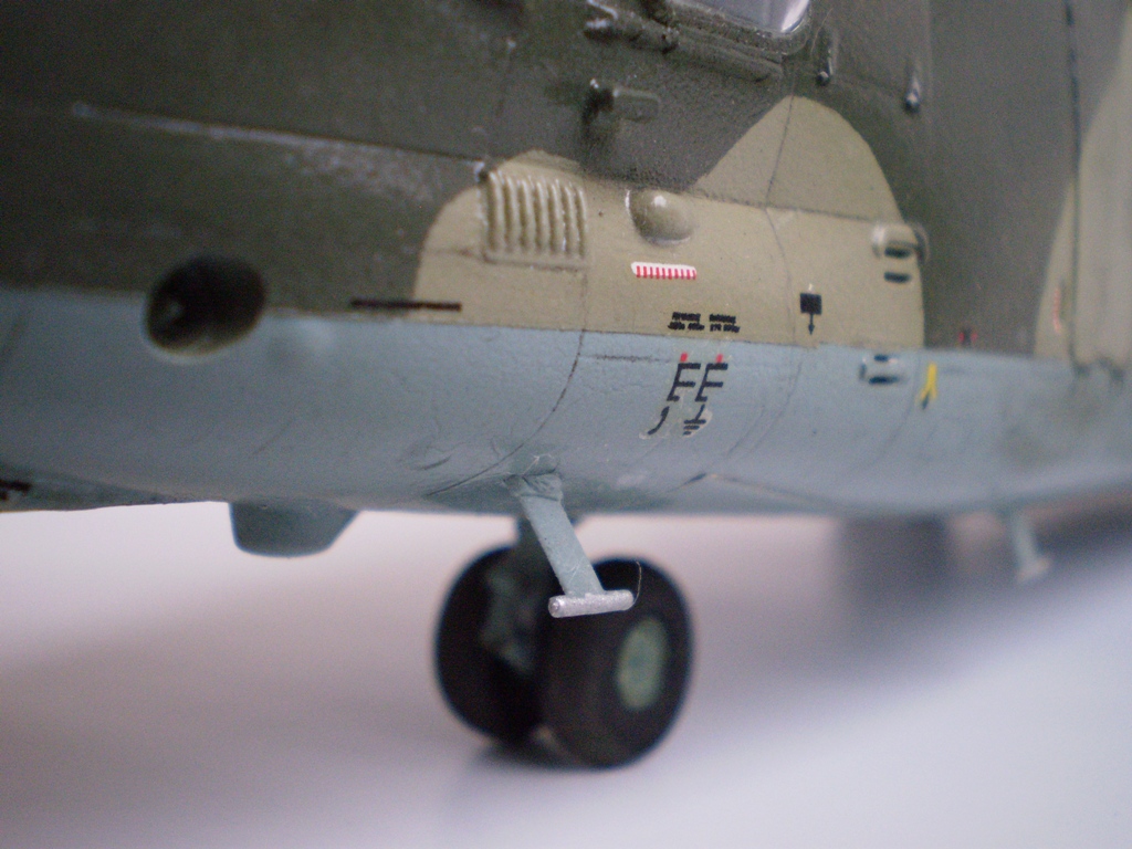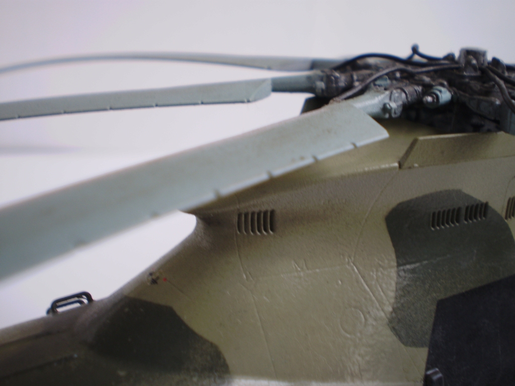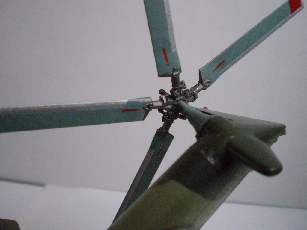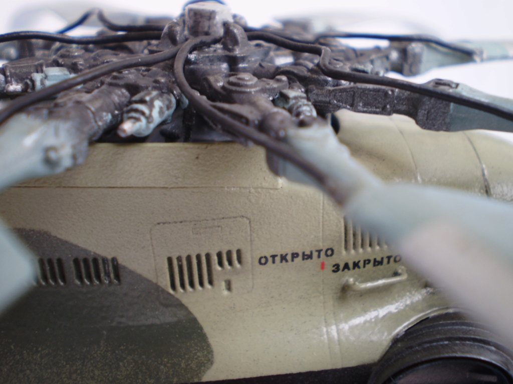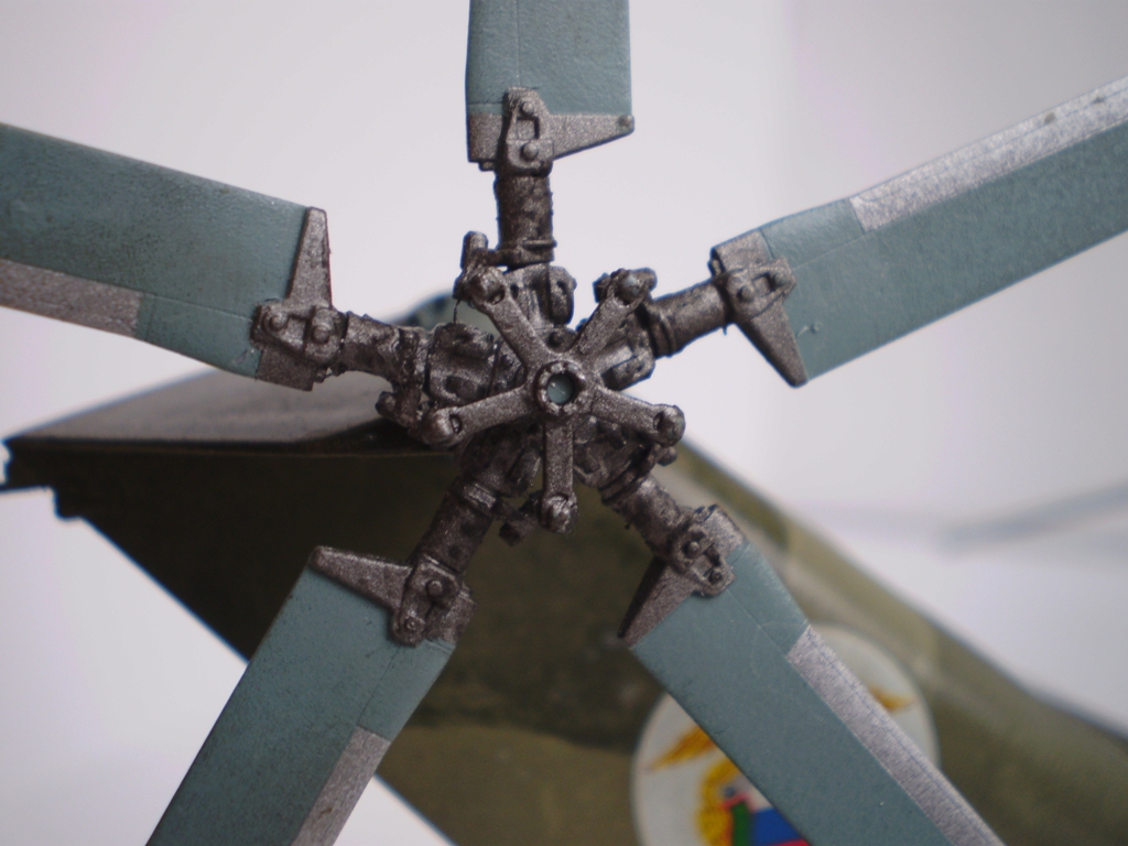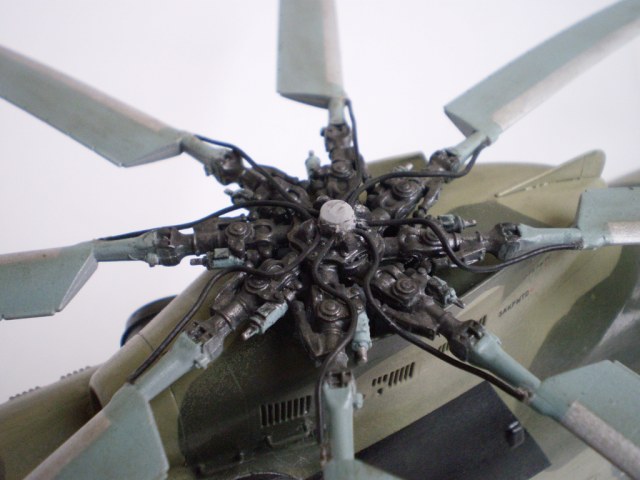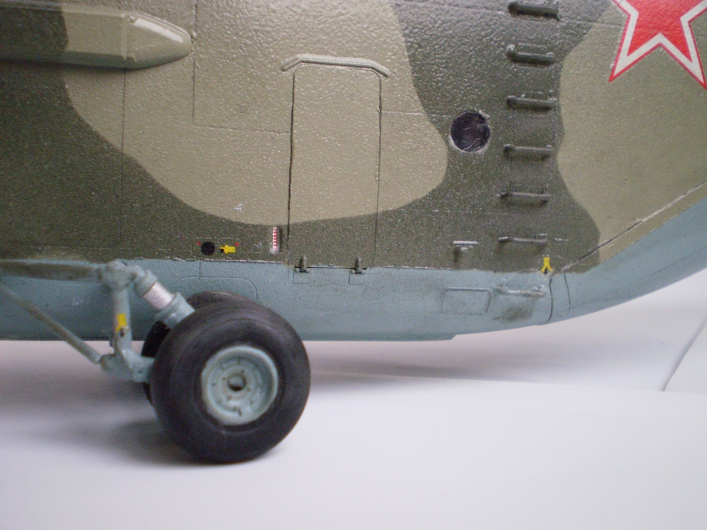 Извините за назойливость! Ми -26 "Звезда" - в студию!!! Модель собиралась в июне-июле 2011 года. Выбрал её, по причине размера, для того что бы было удобнее собирать. При сборке возникли проблемы со стыкуемостью в районе капотов редукторного отсека. Пришлось собирать шов частями, с перерывами на высыхание. Красился вертолёт акрилами "Тамия". Цвета готовые, марок не помню. Краска наносилась при помощи примитивного аэрографа питаемого от компрессор типа "Слоник". Поверху была задута лаком из баллона, который почему - то дал эффект лёгкой потёртости краски (под пятнами камо проступил основной цвет). Декаль - штатная "Звезда". Камо - по мотивам. Сделал смывку на втулках НВ и РВ. На втулке НВ добавлены электрожгуты. Остатки кроя пытался выделить простым карандашом. Готов слушать критику.