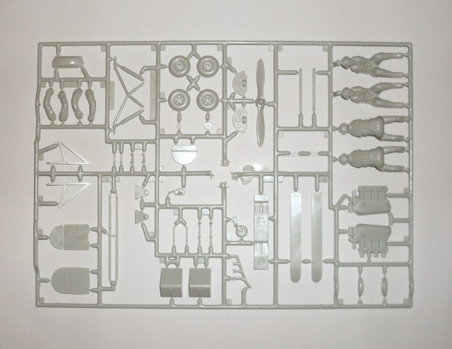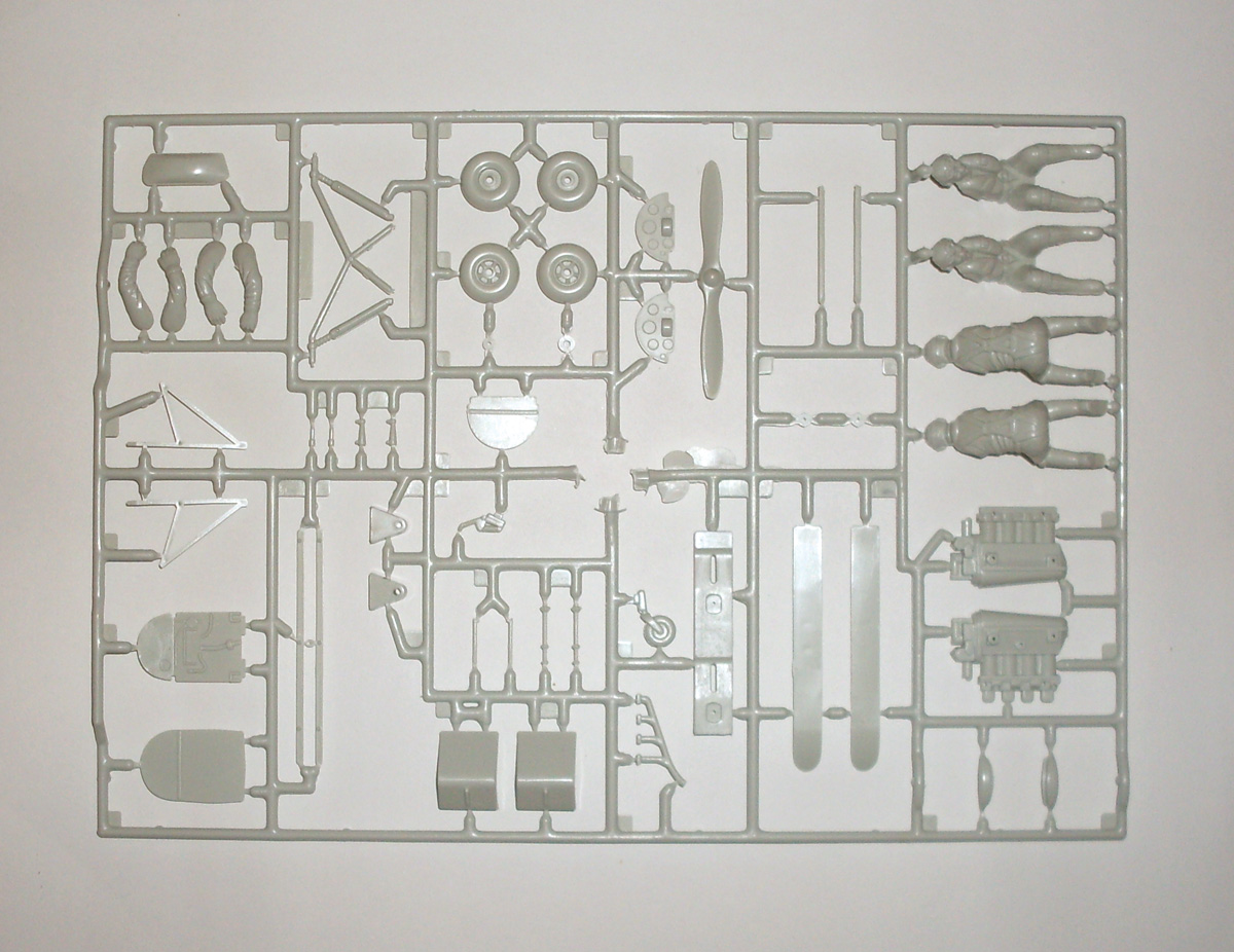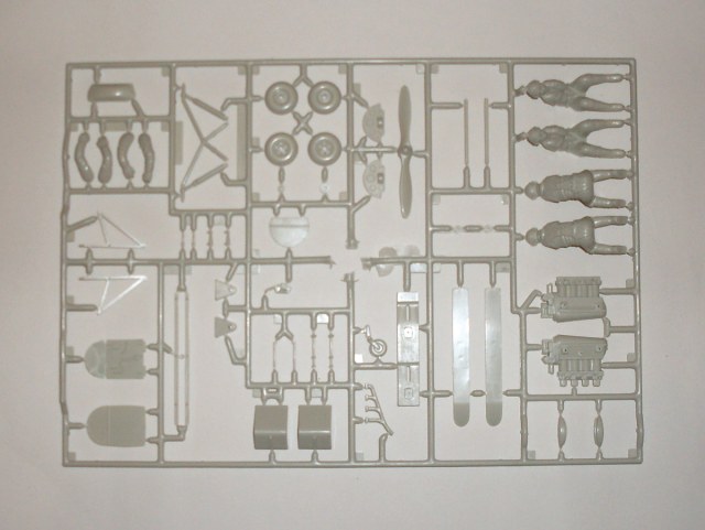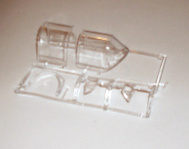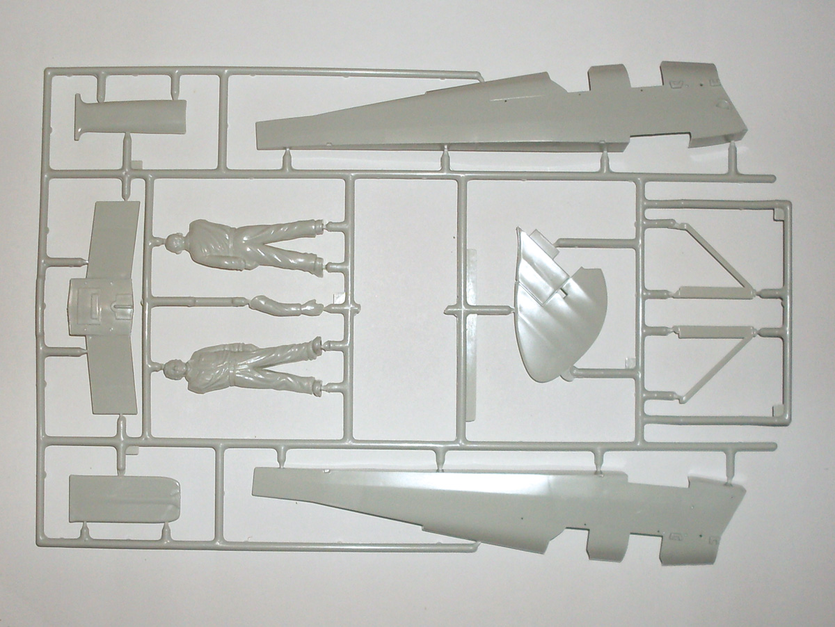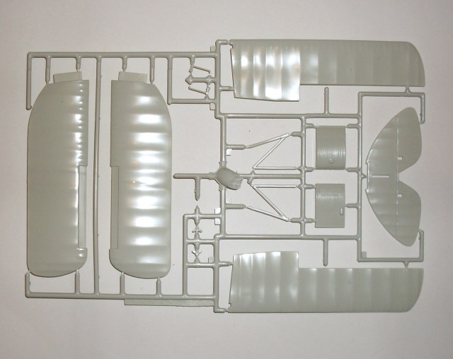 Внутри 5 литников из серого пластика, один из прозрачного, катушка с нитками, инструкция и лист декалей. Пластик "звенит", можно подозревать, что хрупкий. Стеклышки прозрачные. Остекление 2 варианта: обычные козырьки и "веранда".