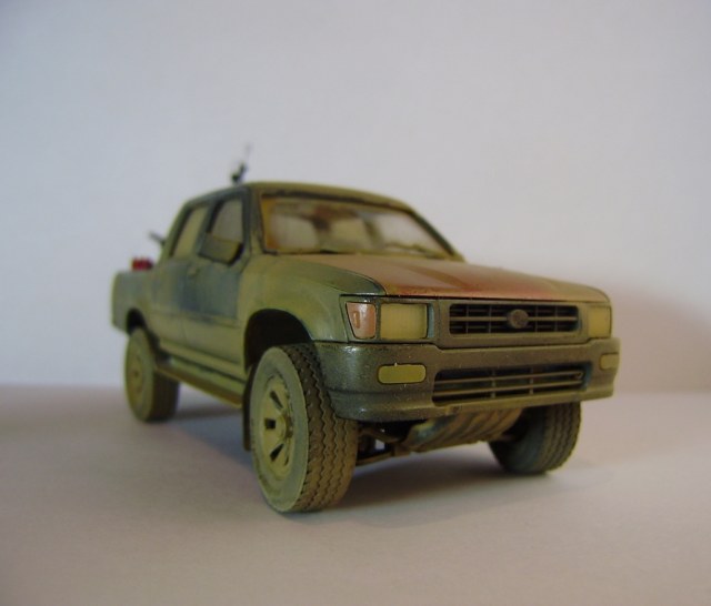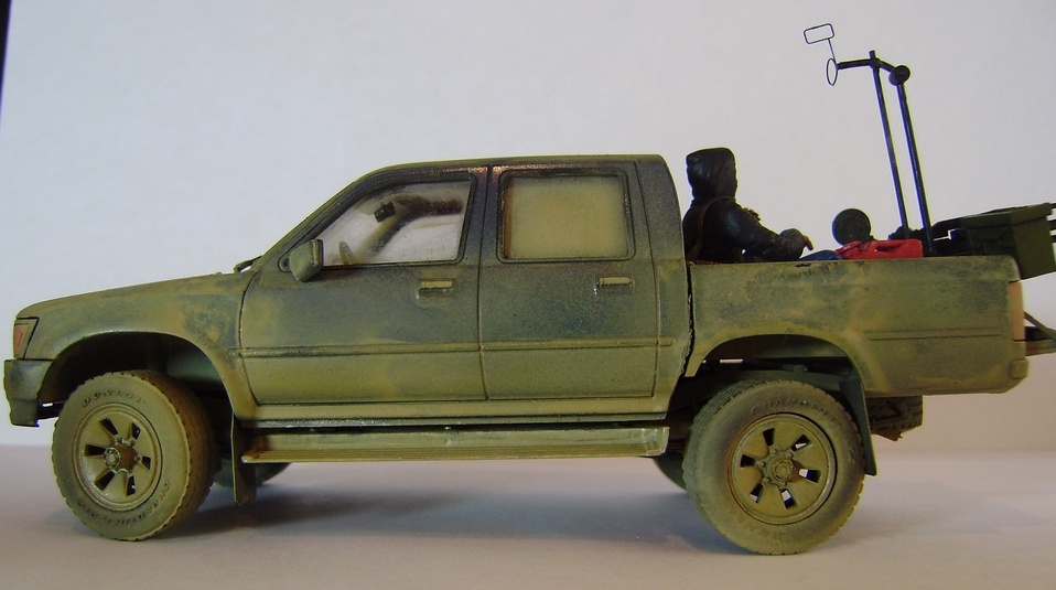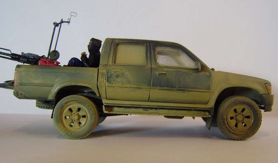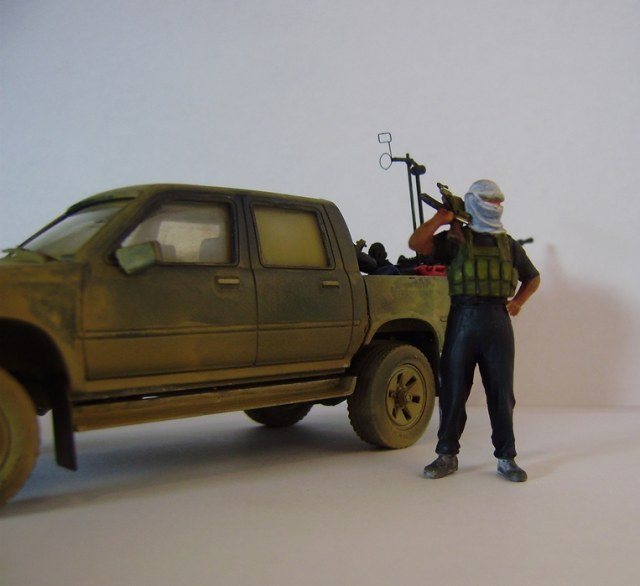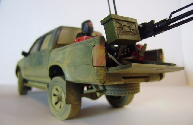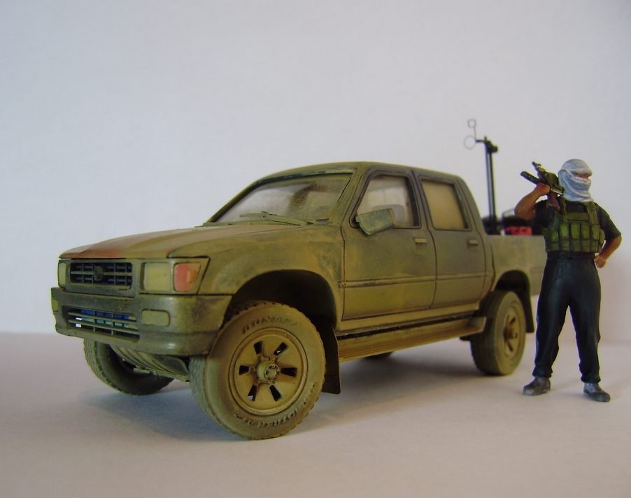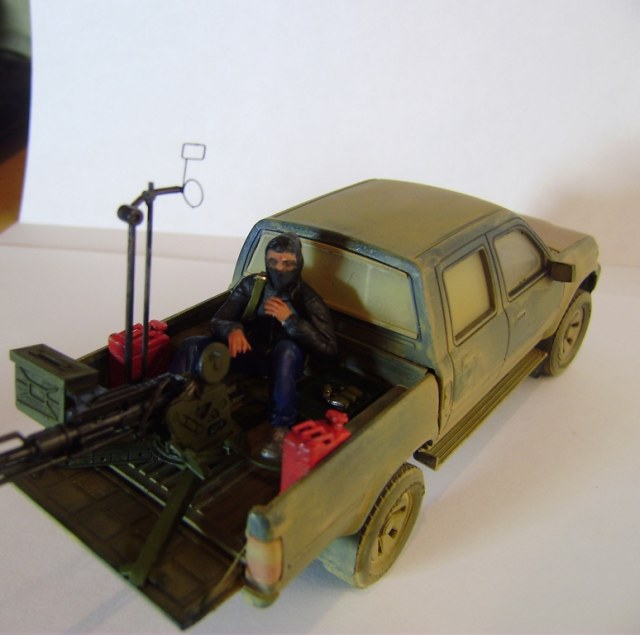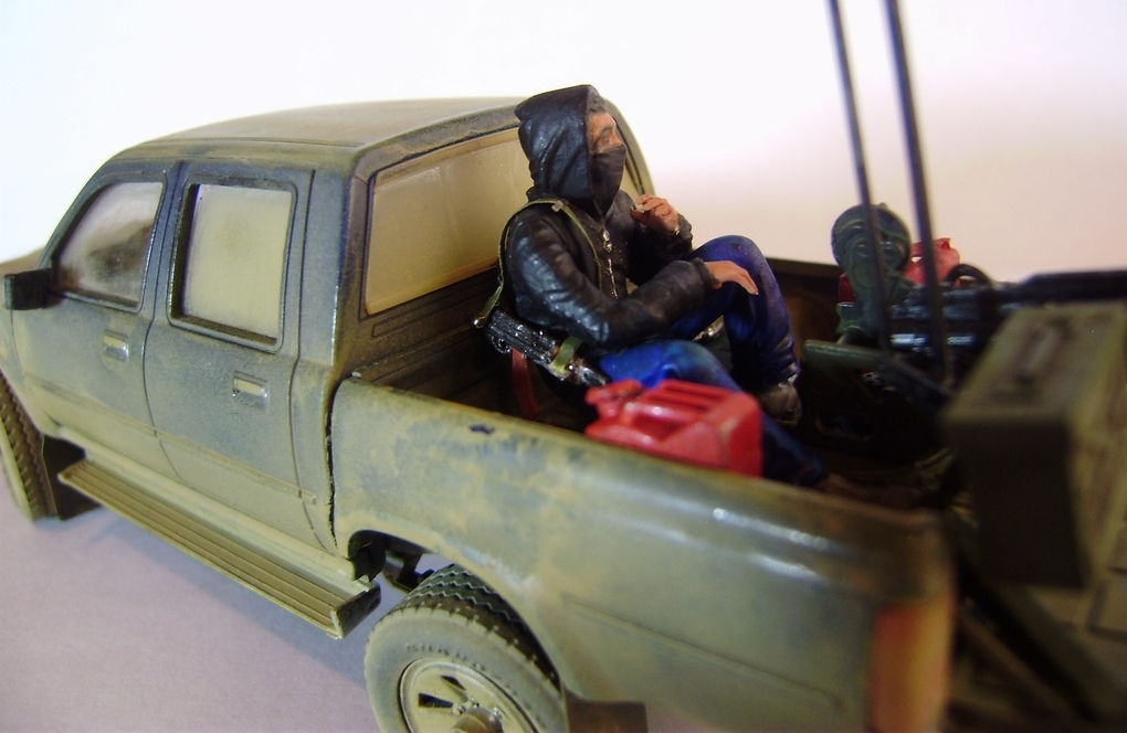Представляю вашему вниманию свою работу – партизанский пикап китайского производителя Meng-Model, очень похожий на японский пикап Toyota Hilux. В этом нет ничего удивительного, пикап Toyota очень популярен среди партизан, повстанцев, террористов, да и армий многих государств уже на протяжении нескольких десятков лет. Пикап участвовал в вооруженных конфликтах и партизанских войнах в Сомали, Судане, Пакистане, Руанде, Эфиопии, Никарагуа, Либерии, Демократической республике Конго, Ливане, Йемене, Ираке, Афганистане, Чаде, и конечно же во время недавней войны в Ливии. В чем же преимущество данного автомобиля? Это высокая мобильность и проходимость как у внедорожника, отсутствие брони компенсируется скоростью, а жесткая рама позволяет разместить в кузове крупноколиберный пулемет или около двух десятков вооруженных бойцов. Все это позволяет использовать пикап в качестве современной легкой кавалерии, наряду например с кроссовыми мотоциклами, для быстрых нападений и разведки.