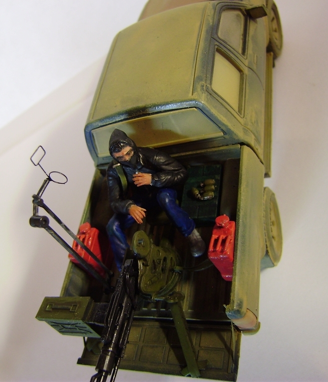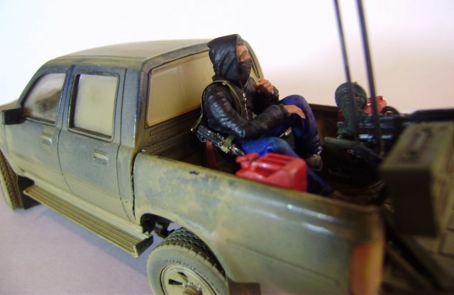 Теперь о самой модели: сборка изкоробочная без доработок, окрас эмалями и акрилом Тамии, кое-где эмалями от Звезды. Пытался изобразить запыление после поездок по пустыне и перестарался, вид такой, как будто пикап пережил песчаную бурю. Meng-Modelпредлагает вооружить пикап зенитной установкой ЗПУ-1, довольно редкой, но никто не мешает вам заменит ее ДШК, НСВТ, Браунингом М2, ЗУ-23-2 или даже блоком УБ-32 для запуска неуправляемых авиационных ракет (в смоле такой блок с самодельной турелью уже выпускают). Фигурка зенитчика-партизана качества довольно среднего, но других альтернатив этой фигурке пока не видно. Также добавил фигурку иракского партизана от Мастер Бокс из набора «Ирак 2», такой пикап вполне может быть и в Ираке.