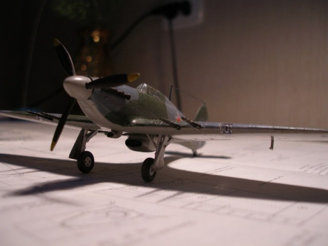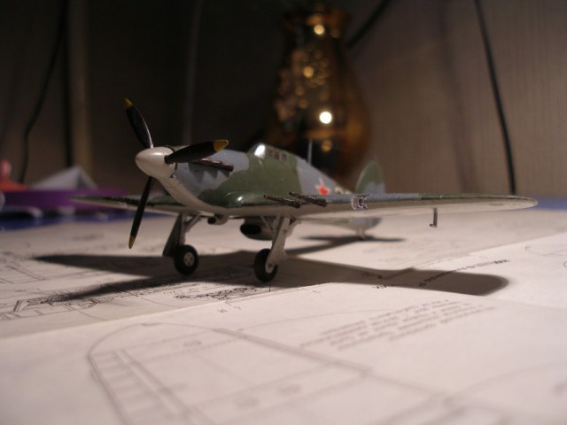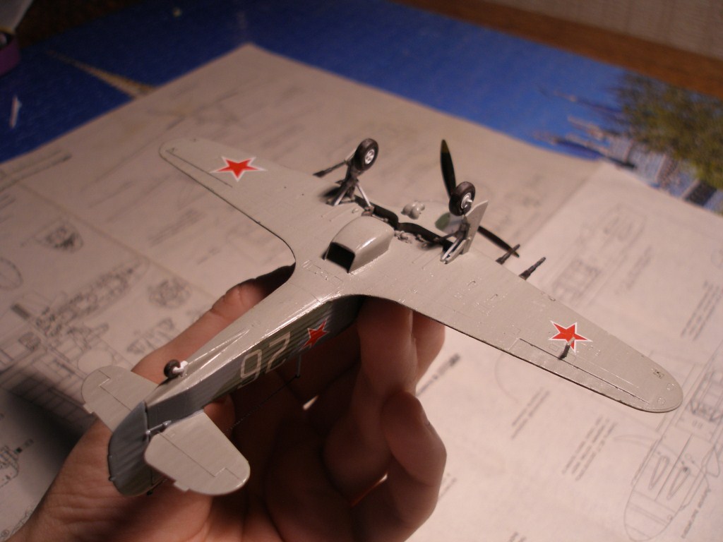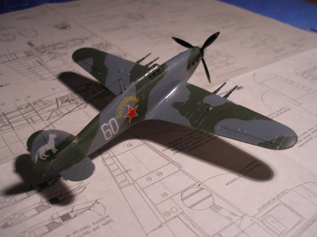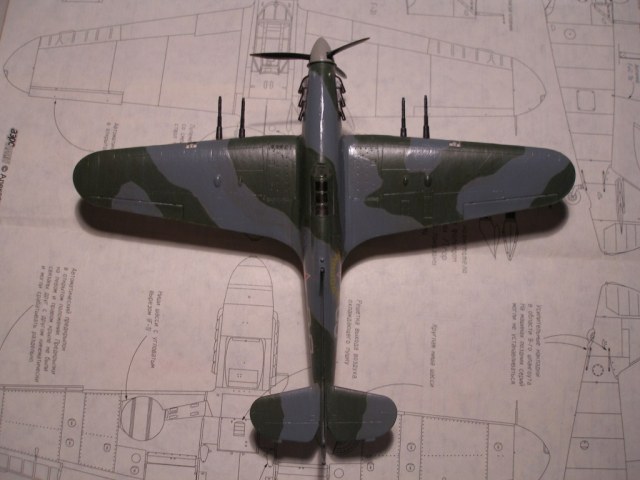 Качество деталей прекрасное, шпаклевка минимальна. Красил кистью, звездовским акрилом. Цвета назвать не могу, т.к. смешивал несколько (о чем жалею - на крыле проявляются бордовые оттенки). Лак Humbrol полуматовый (возможно, следует его сильнее разводить: блеск практически глянцевый). Смывку решил не проводить (ибо техника моя весьма примитивна и далека от идеала). Антенна - нить: толстая, зато гладкая и ровная.