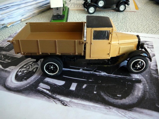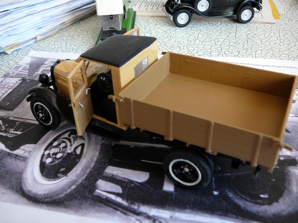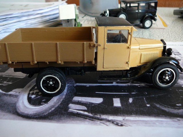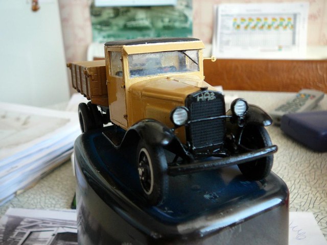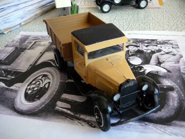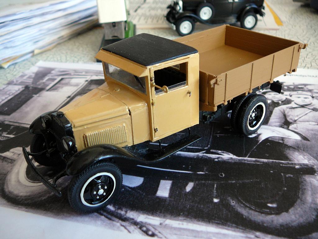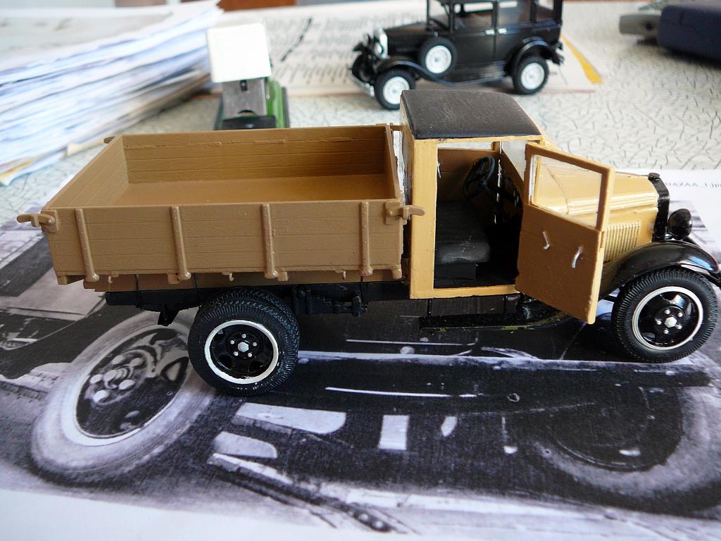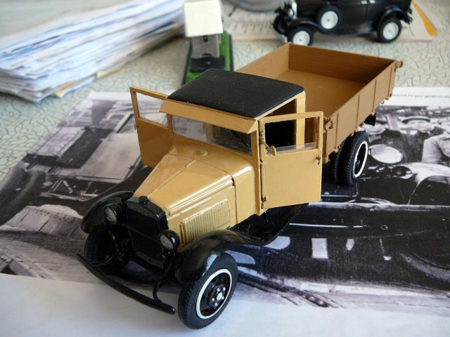 Приветствую каропчан! Представляю не очень распространённую модель полуторки с деревянной кабиной из первых выпусков. Как было сказано в статье о ней, из-за временного отсутствия стального листа, с конвейера некоторое время выпускали машины с фанерной кабиной. Фоток оригинала я нашёл всего три. Одна- прямо на конвейре. Другие очень мелкие , потому нет смысла их выкладывать.