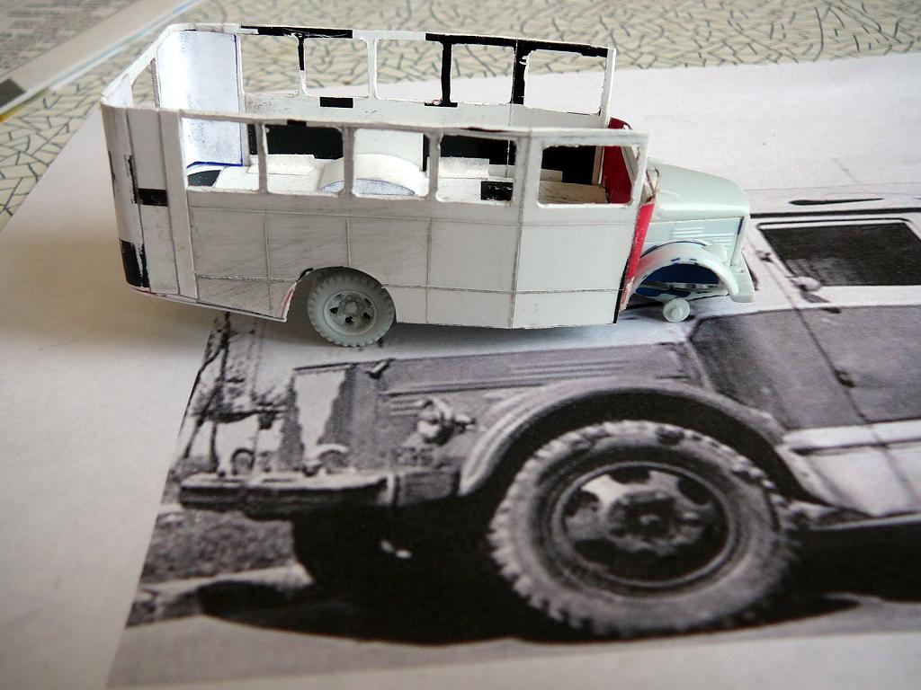 Кузов по ширине соответствует оригиналу.Размеры выдержаны.Другое дело, что были модели с более узким кузовом.. Есть у меня и такая фотка. Окна- да, не аккуратные.Сверло ушло при вырезании. Фотка такого же автобуса с небольшими внешними отличиями.