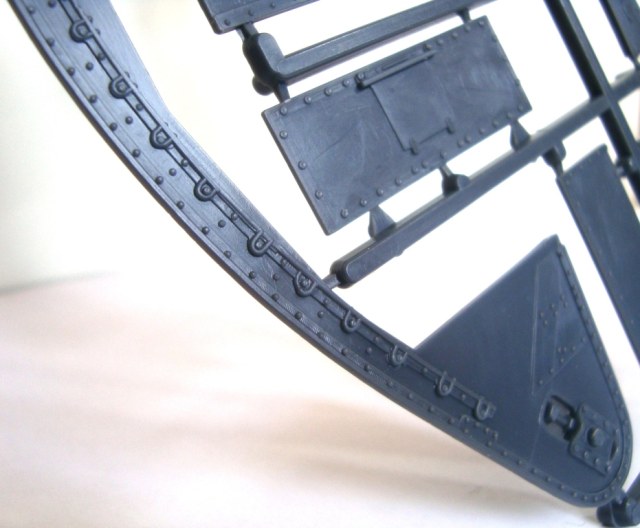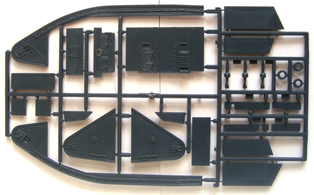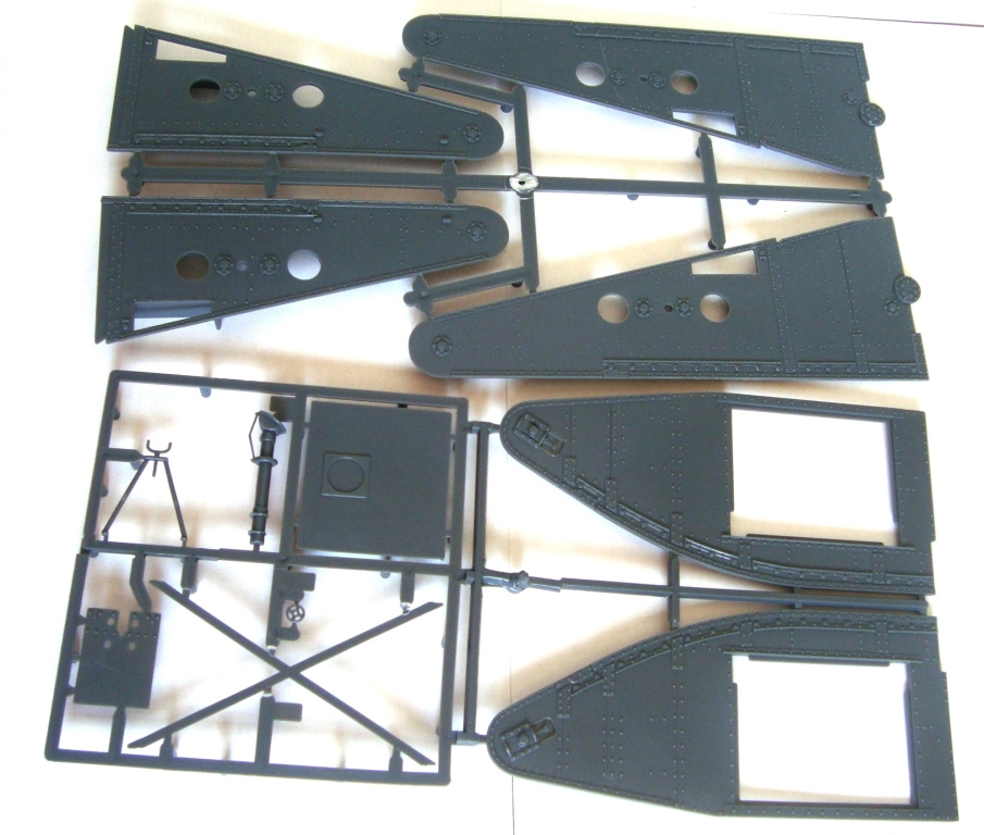Содержимое коробки представляе собой 5 литников с деталями из очень твердого пластика чемто напоминает смолу, количество деталей минмально. Качество отливок вполне нормально все детали достаточно четкие, облоя необнаружено следы толкателей если и есть то на внутренних частях.