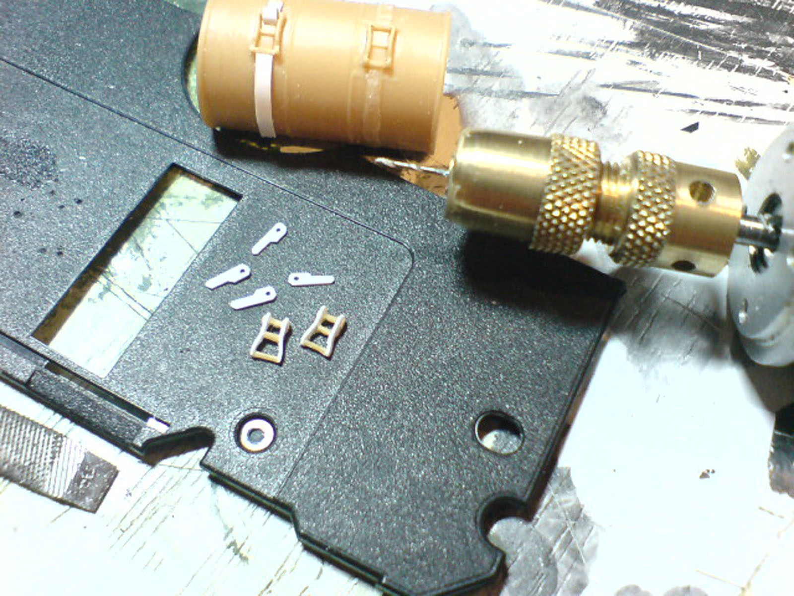 Кормовые бочки лил из эпоксидки, мастер-модель изготавливал из бочки, входящей в набор, с предварительной подгонкой под оригинал, для оттиска формы использовал автомобильный термостойкий герметик. Маячек на башне так же из эпоксидки, покрашен оранжевым лаком, внутрь, в качестве вращающегося рефлектора, решил вставить начинку от светодиода.))