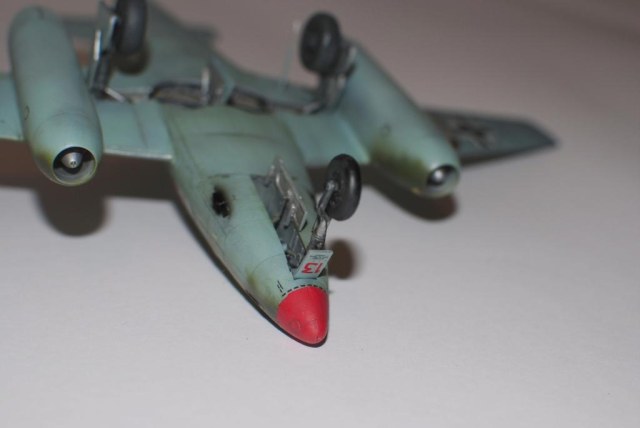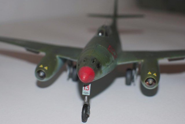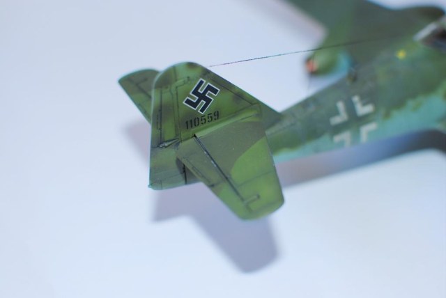 О покраске. Вот тут все неоднозначно… Удалось найти лишь одну фотографию этого борта, но и на ней толком ничего не видно. Пересмотрел кучу моделей и прочитал кучу форумов по этому самолету, и никто однозначно не мог сказать какие цвета использовались для этого борта. Одни источники утверждают, что должны быть RLM 76/82/83, другие говорят, что 76/81/82. Я выбрал схему 76/81/82. По краскам… не уверен, что попал в цвет(((( в качестве 76ого использовал ревелл 49, 81 – ревел 361, и mr. Color RLM 82, но он почему-то у них зеленый, а не коричневатый. В общем, так до конца и не понял те цвета или не те. Все краски – эмали.