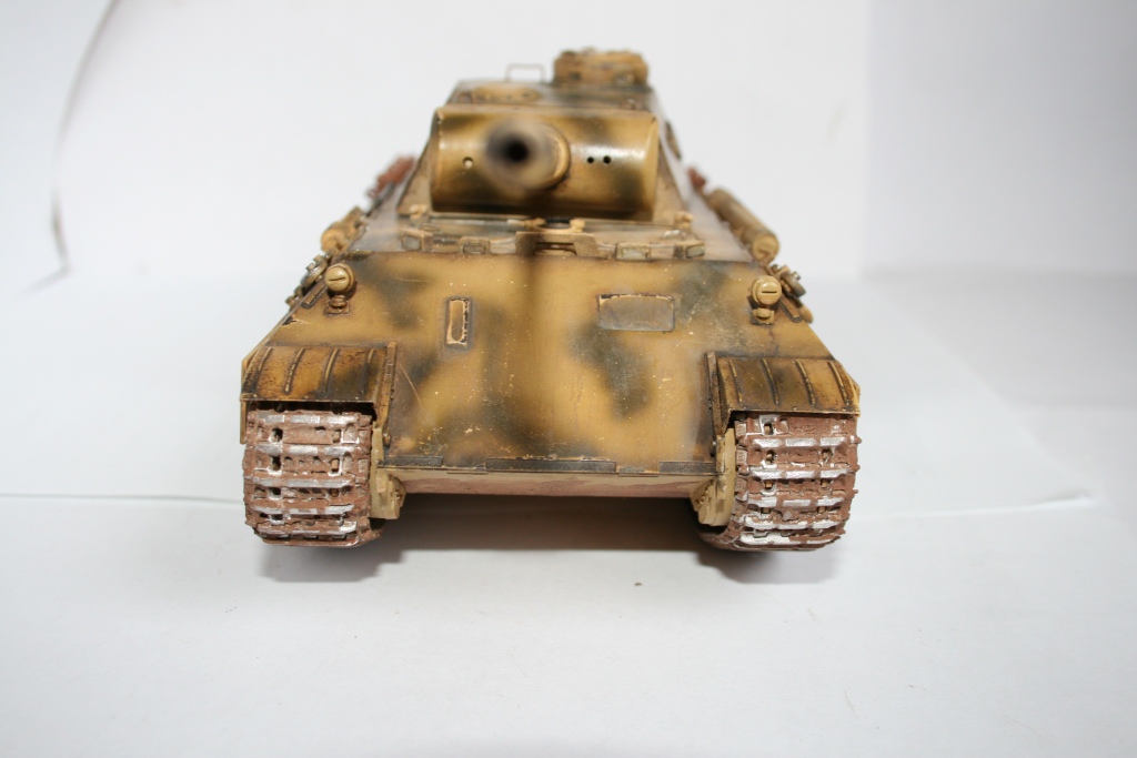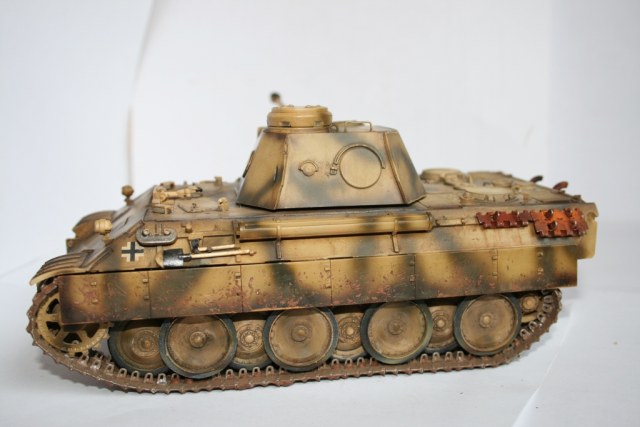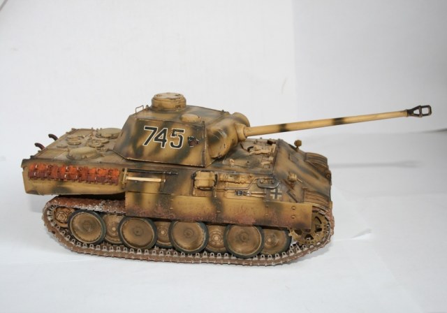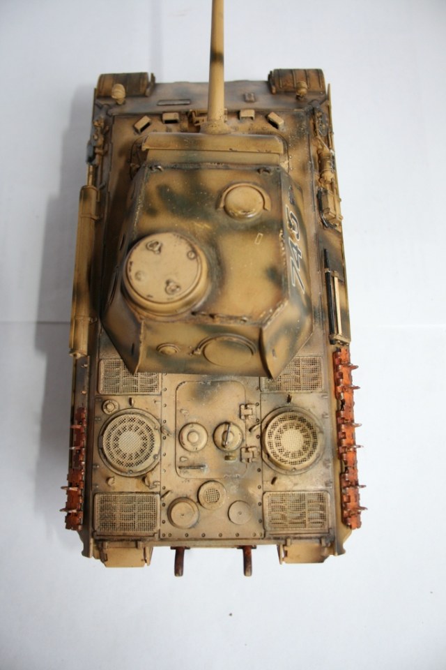 При покраске ориентировался на фото и цветные боковички из книги М. Коломийца "Пантеры на Курской дуге". Первый вариант камо мне не понравился, пришлось перекрашивать, затем мне подложил свинью полуматовый лак АКАН, собравшись на поверхности мелкой паутинкой. При сошлифовке лака был достигнут интересный эффект выцветания.