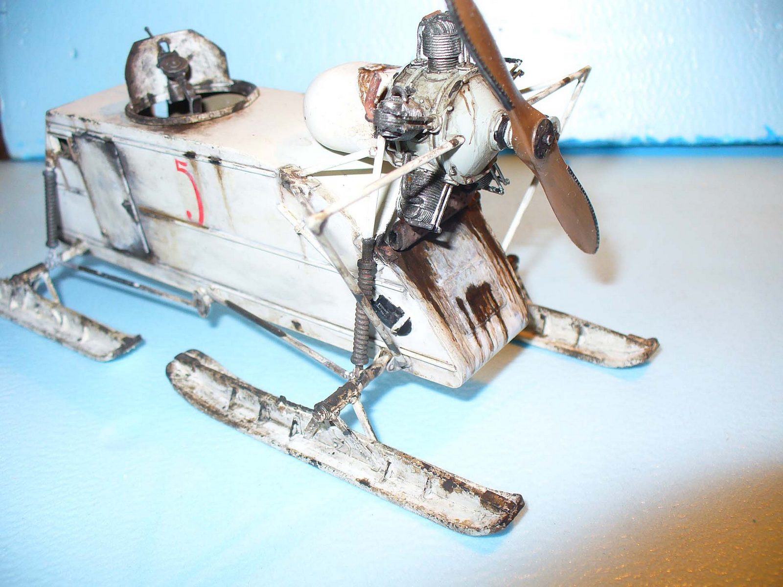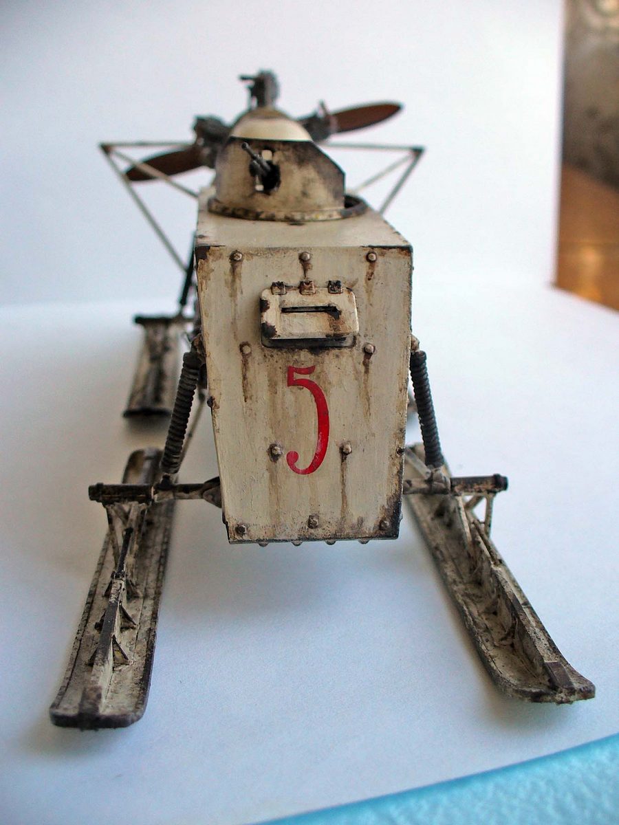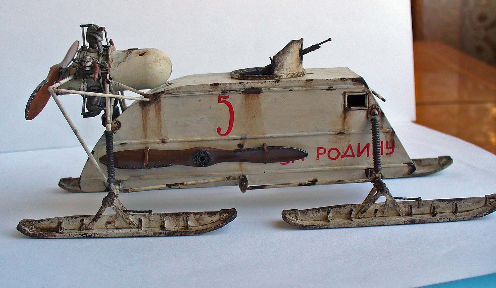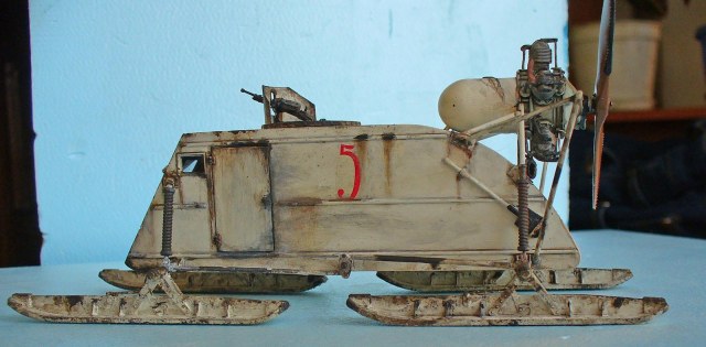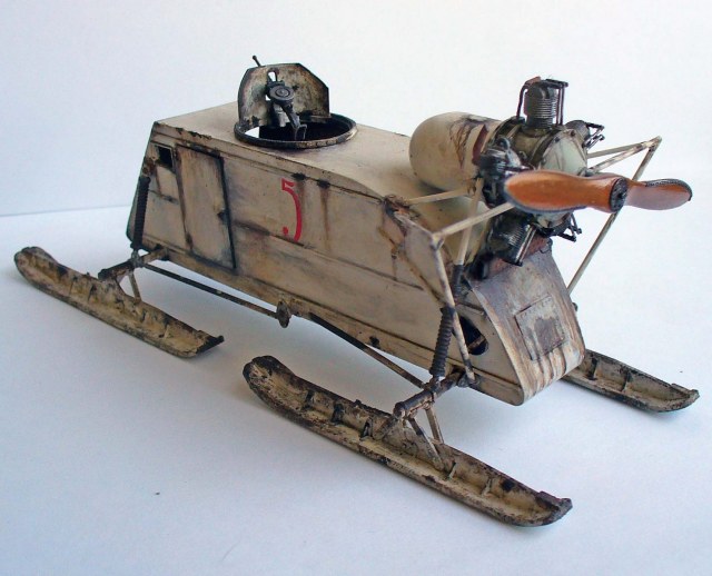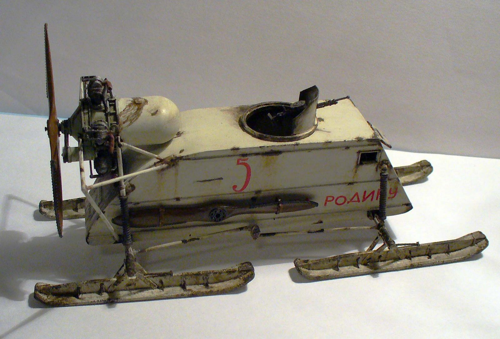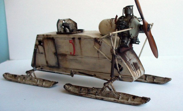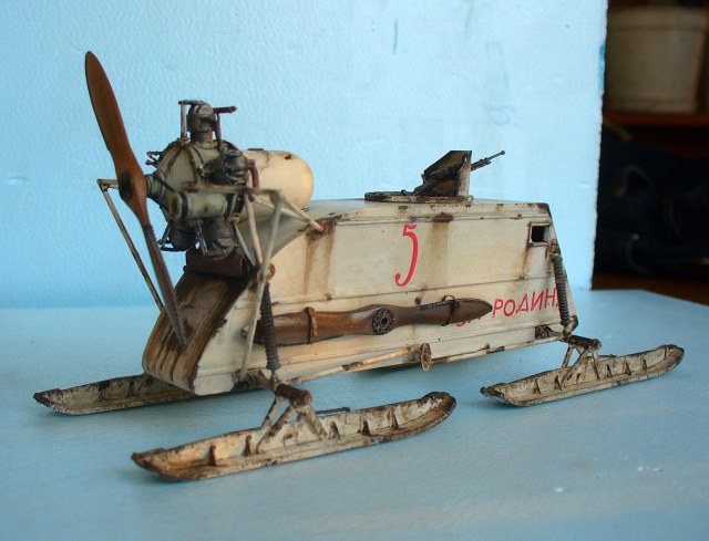 Здорово сделано, хорошо получилась грязь на зимнем камо. Цвет пропеллера под лакированное дерево очень похож. Чуть смутили подтеки по листу корпуса под двигателем, слишком густые, что ли... (хотя, наверное, на аэросани шли двигатели, прошедшие капремонт, или уже практически выработавшие ресурс в авиации, так что, наверное, такие подтеки, скорее всего масла, могли быть...)