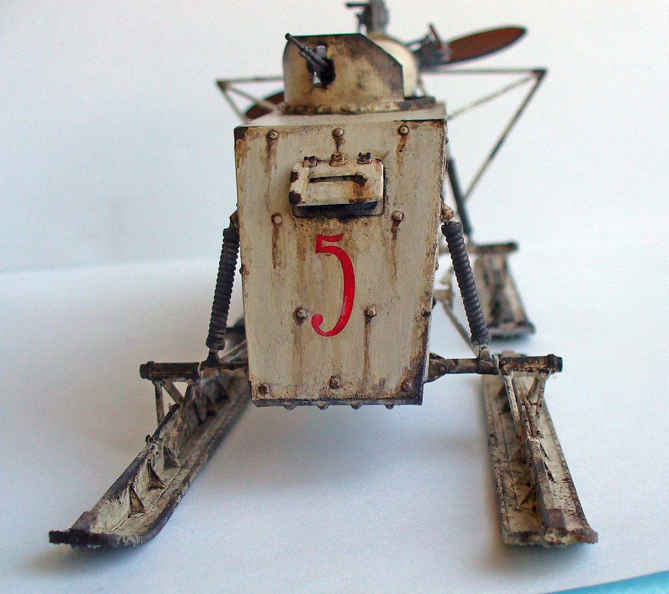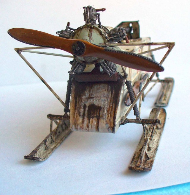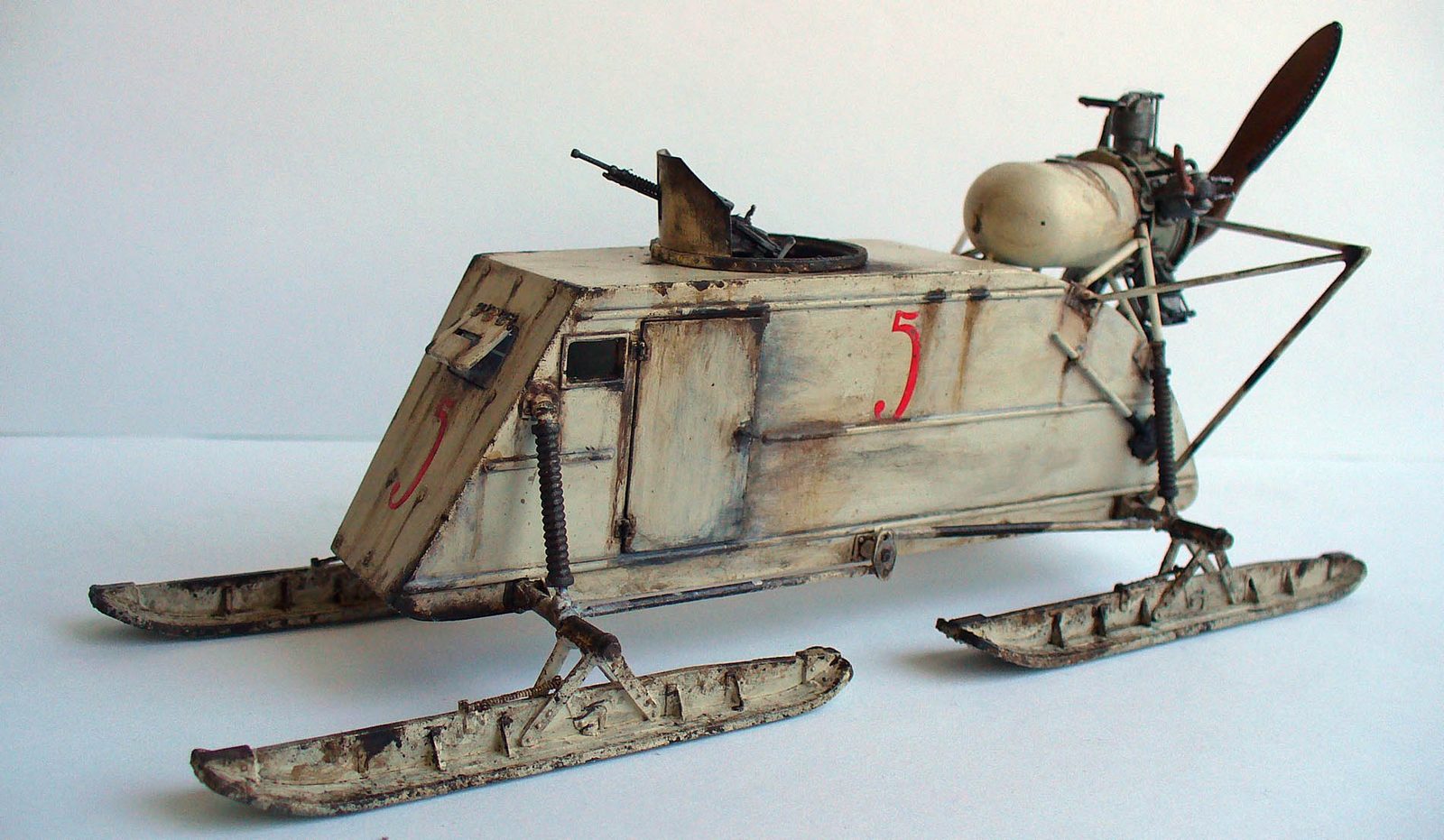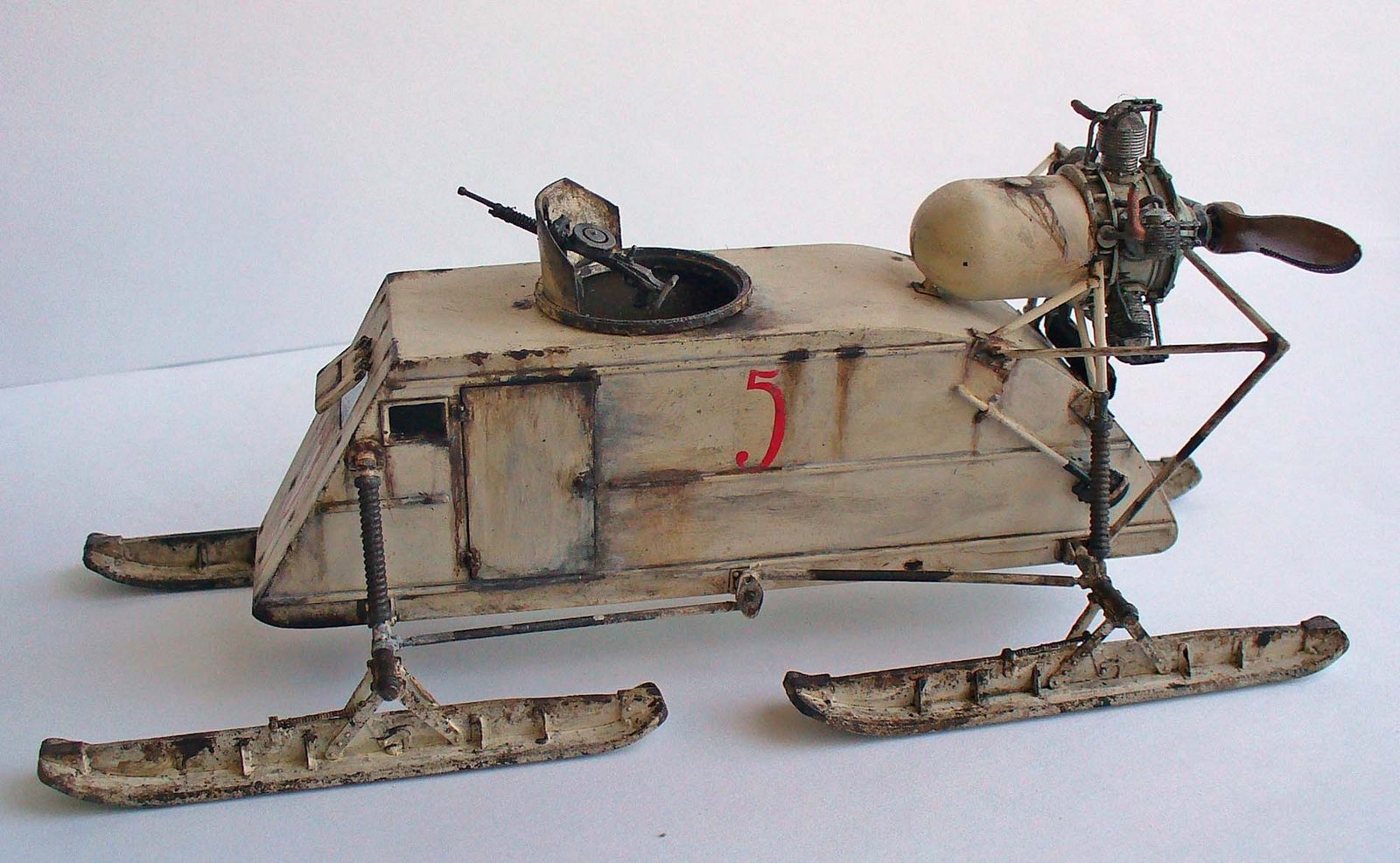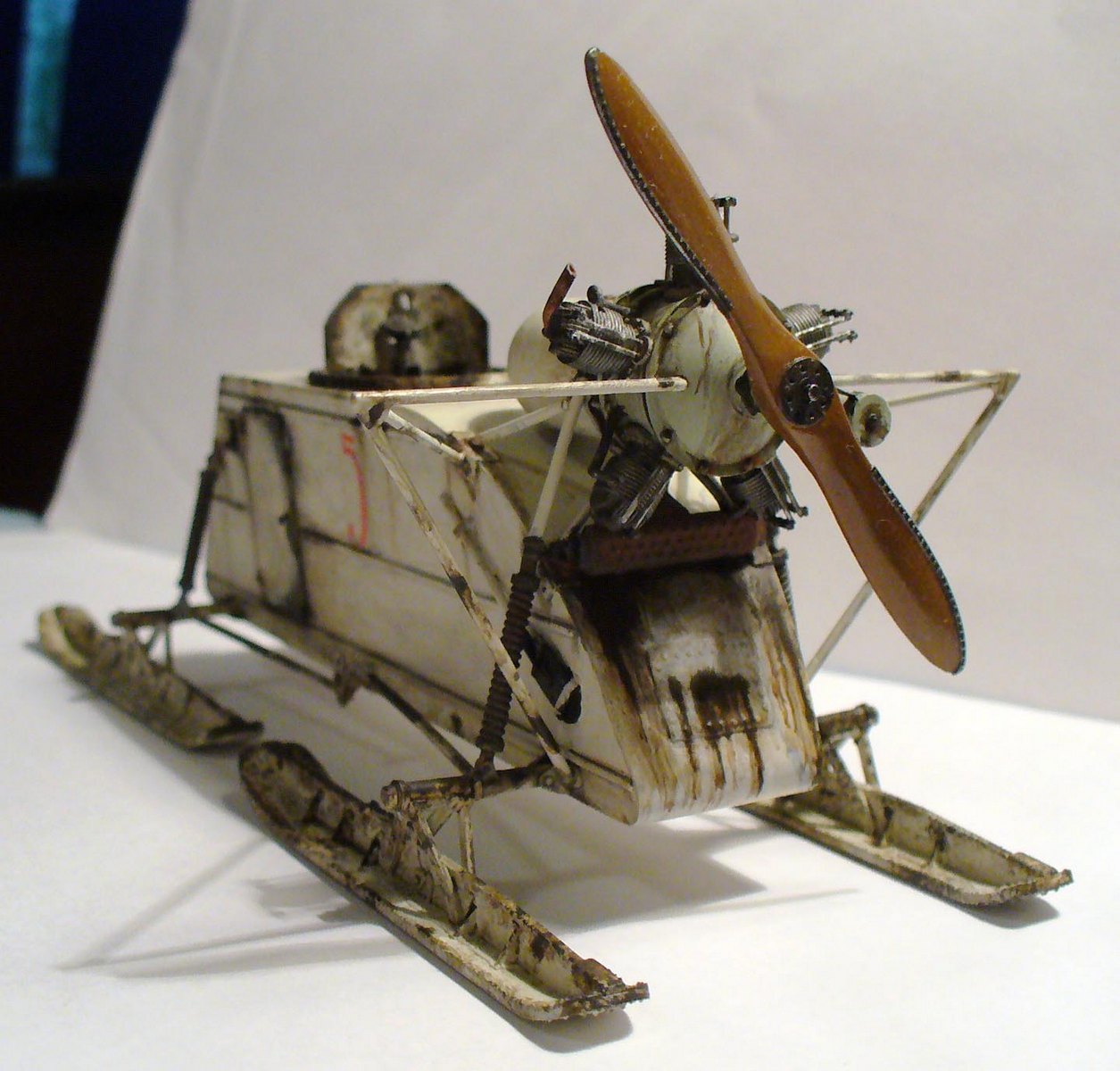 Здорово сделано, хорошо получилась грязь на зимнем камо. Цвет пропеллера под лакированное дерево очень похож. Чуть смутили подтеки по листу корпуса под двигателем, слишком густые, что ли... (хотя, наверное, на аэросани шли двигатели, прошедшие капремонт, или уже практически выработавшие ресурс в авиации, так что, наверное, такие подтеки, скорее всего масла, могли быть...)