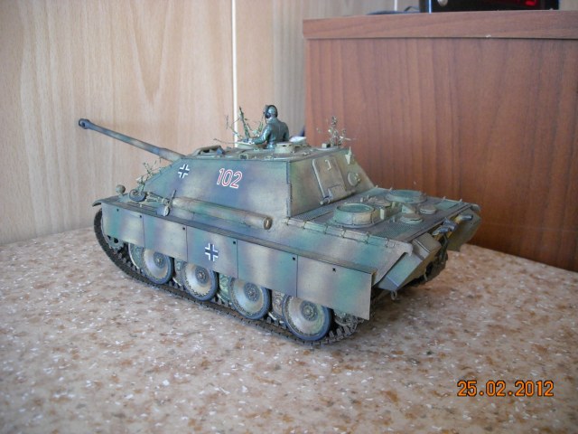 Собрал модель полностью из коробки. Красил Тамиеей и Звездовским акриломи Тамийскими тенями. От себя добавил только несколько веточек, сделал провода к наушникам командиру и решетки на фоздушные фильтры кормовой части.
