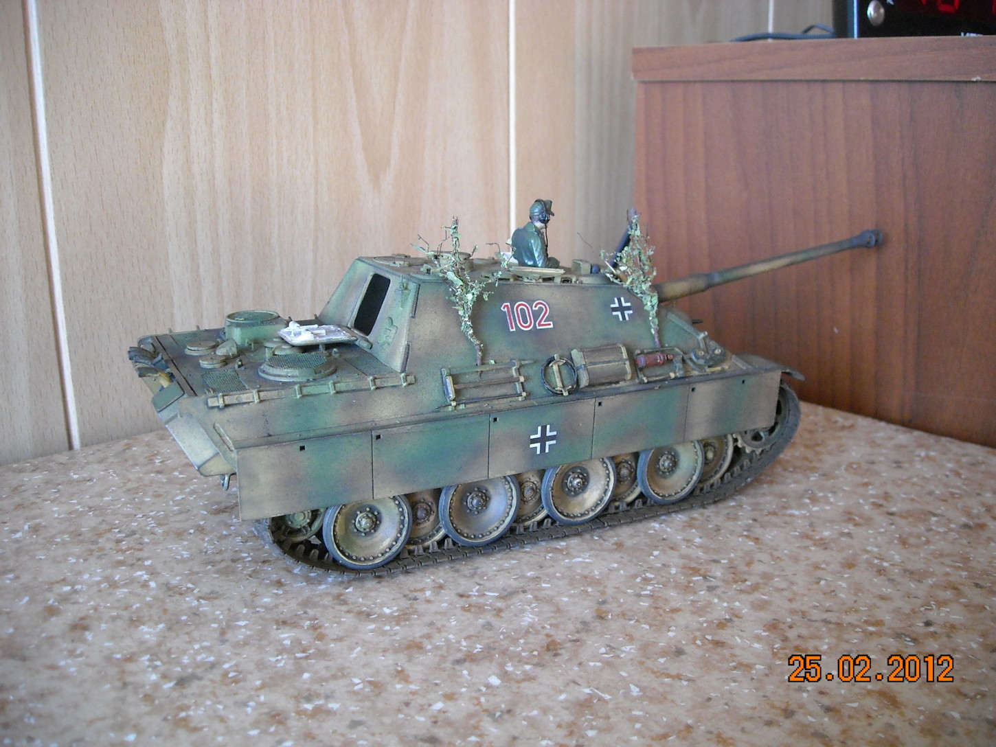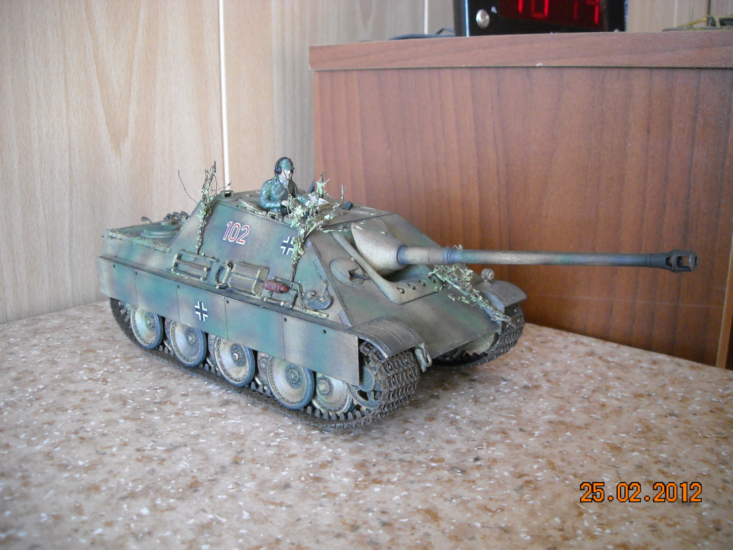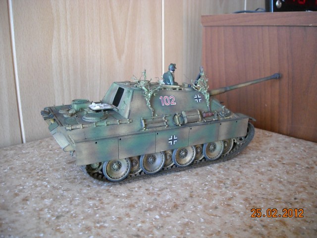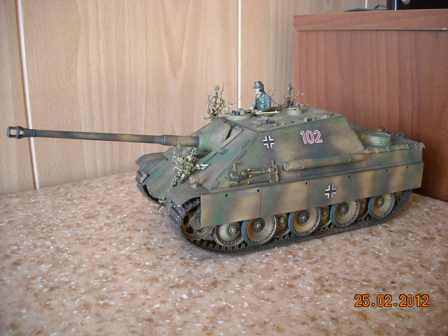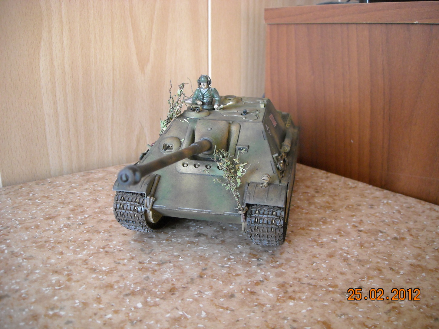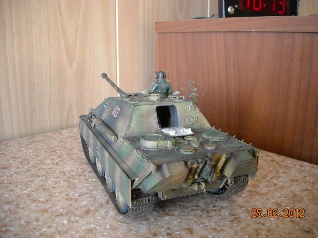 Вторая фотография - самая лучшая. Мне понравилась сборка и окраска, маскирующая растительность тоже уместна. А вот танкист блестит и портит весь вид, его бы матовым лаком задуть.