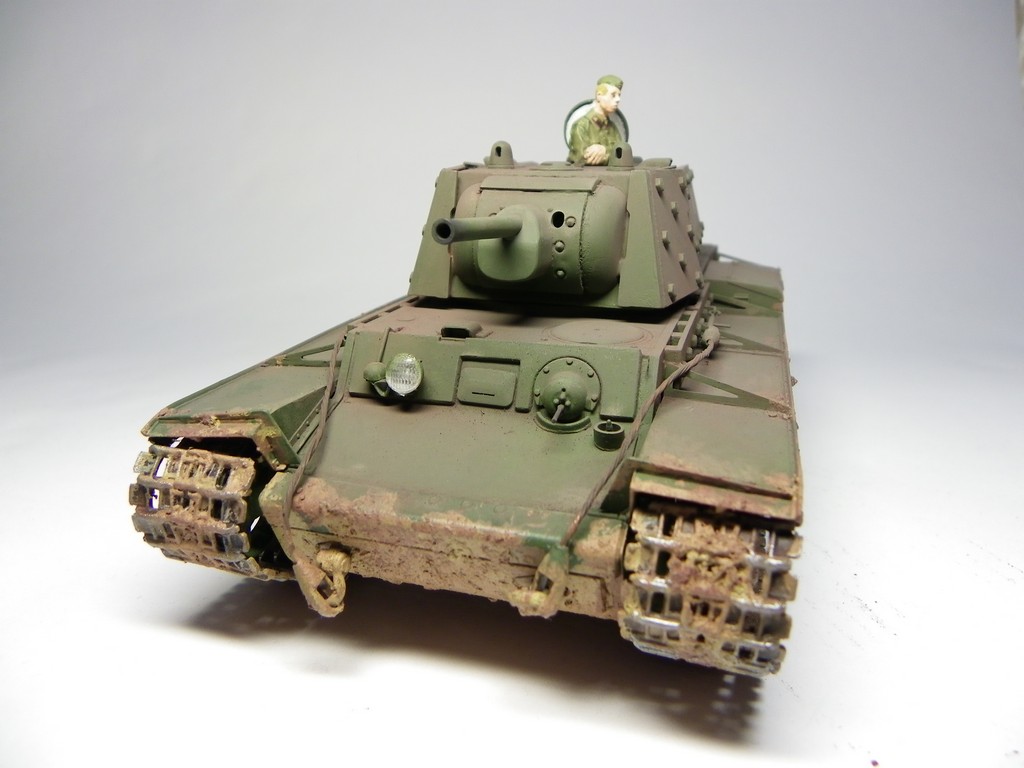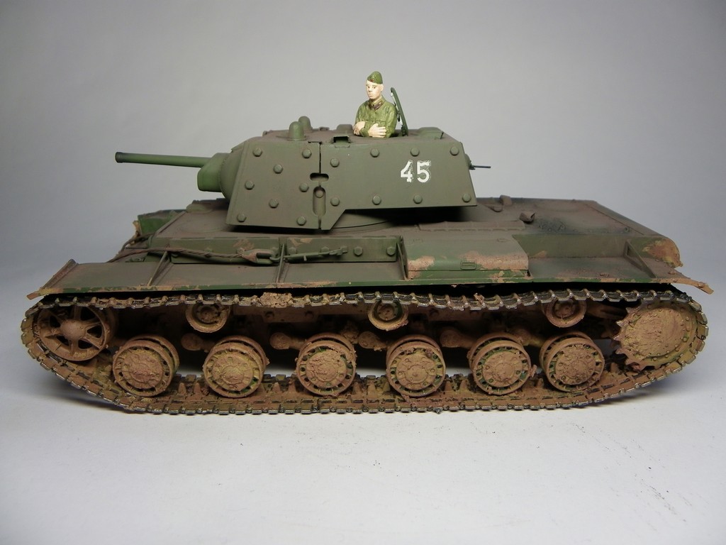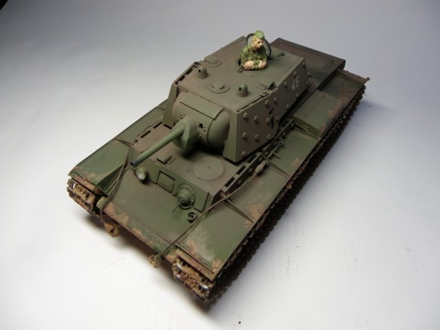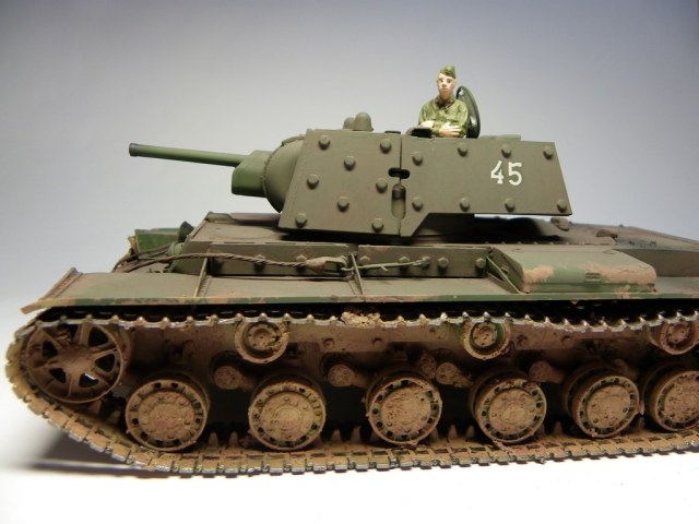 Был куплен альпиновский танкист, опять-таки, из двух вариантов головы (в танкошлеме и пилотке) сын выбрал пилотку - так КВ обзавелся молоденьким командиром в гимнастерке, грустно сложившим ручки (ну это задумка альпиновского скульптора, хе-хе).