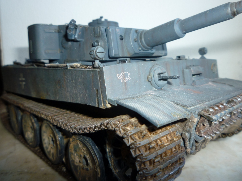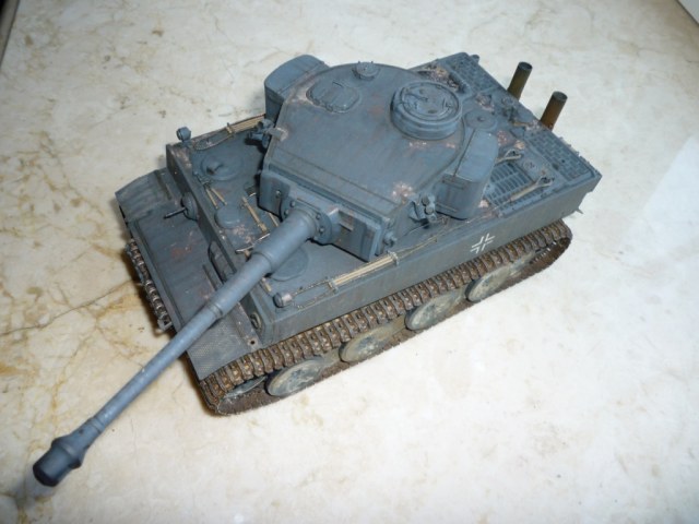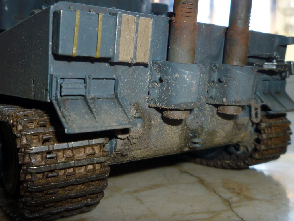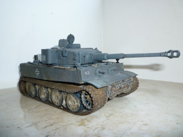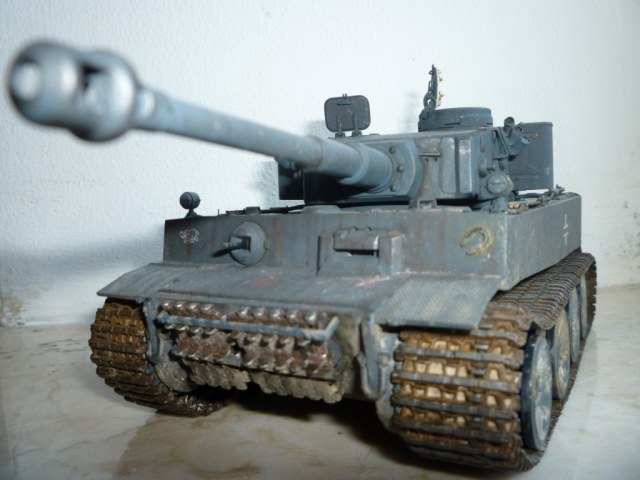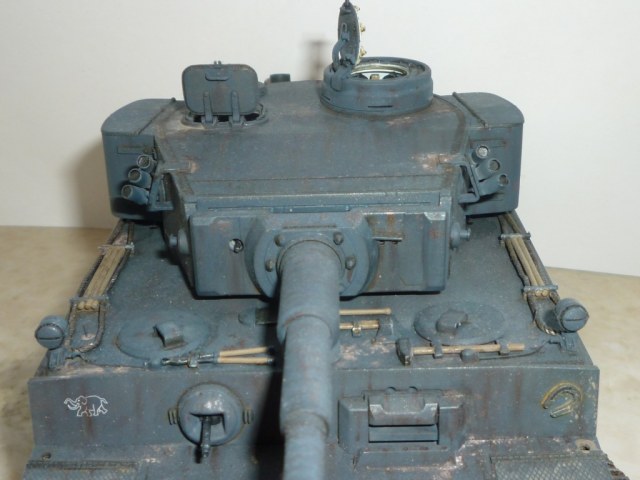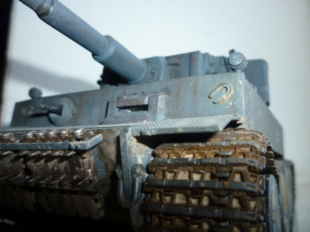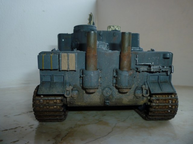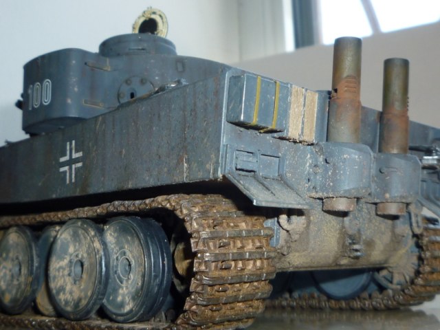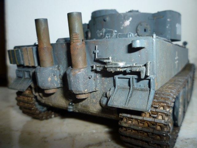 такое ощущение, что местами "смывки" не хватает... так же не хватает грязи, точнее она отсутствует на обратной стороне катков и на днище так понимаю тоже))). выхлопные трубы "прорезами" внутрь стоять должны. а так хороший тигр! успехов!