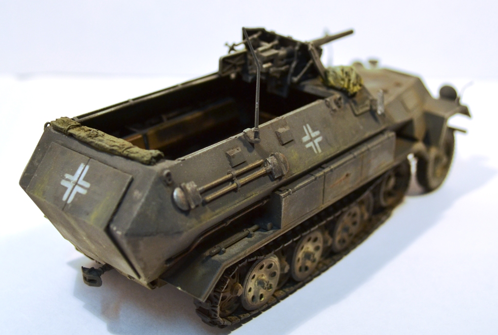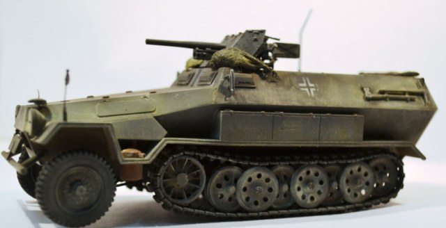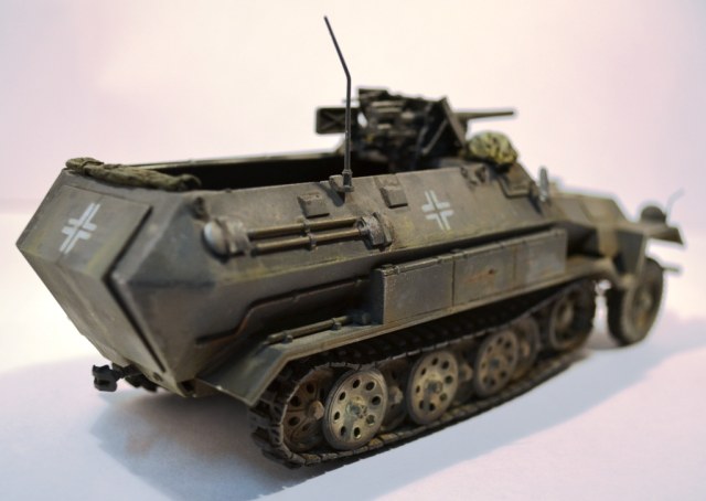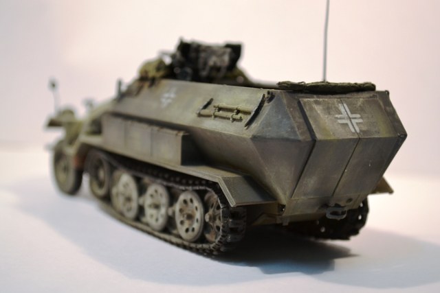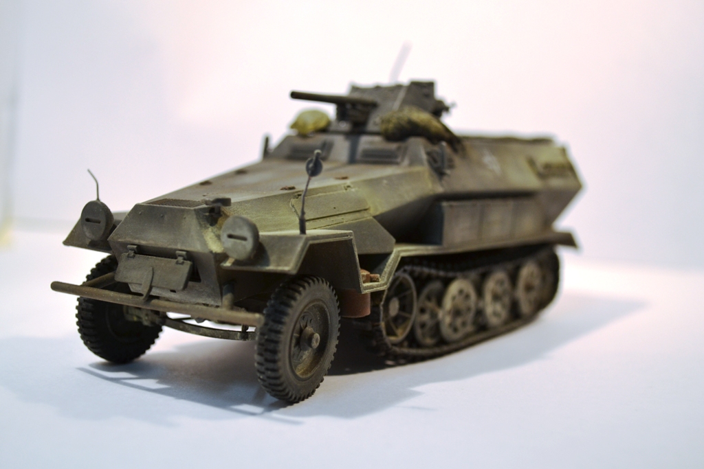 Доброго времени суток, уважаемые каропчане, представляю на ваш строгий, но справедливый суд свою последнюю модель, Sd251/10 Ausf.B, от Звезды. Модель пытался собрать по приведенной выше фотографии. Прототип если не ошибаюсь на фото сфотографирован осенью 41-го. Из доработок были добавлены элементы дополнительного бронирования на правом борту, некоторое количество заклепок по бортам, разделены бортовые ящики, переделаны скобы на верхней части корпуса, если так они называются, добавлены вмятины и пробоины на ящиках, добавлены зеркала заднего вида, скатка и мешки из салфетки промокнутой в ПВА, опущена пушка. Задувал грунтом, затем суперзвездой, высветление так же супер звезда, сухая кисть, смывка маслом и тонировка акрилом, кресты нанесены через трафареты. За фото заранее извиняюсь, минусы искусственного освещения. А, совсем забыл, не взял фотик внутрянку, там добавлена педаль газа.