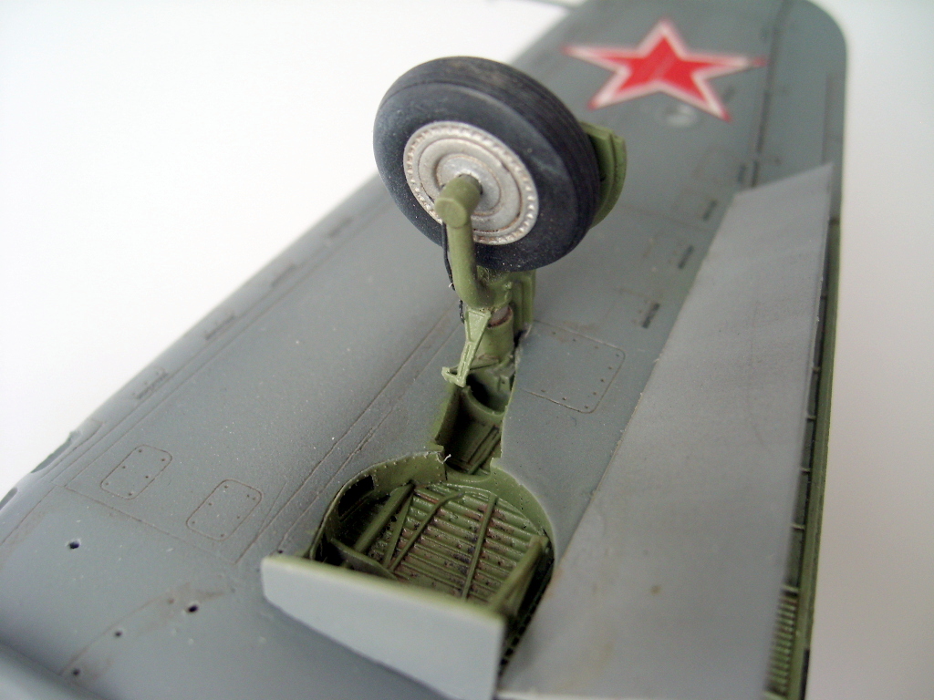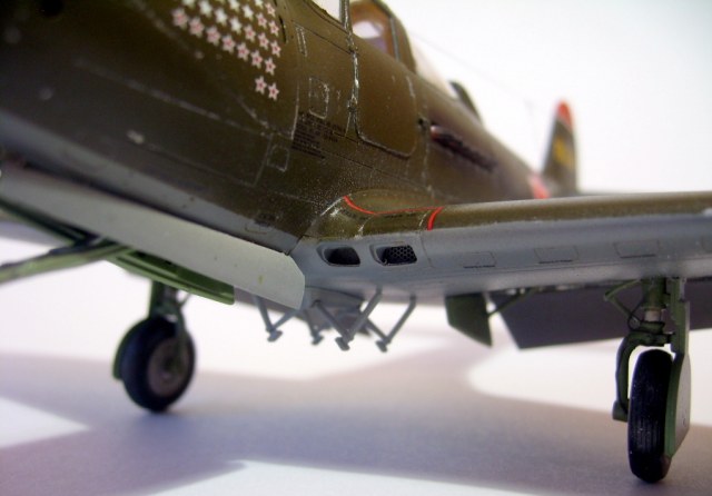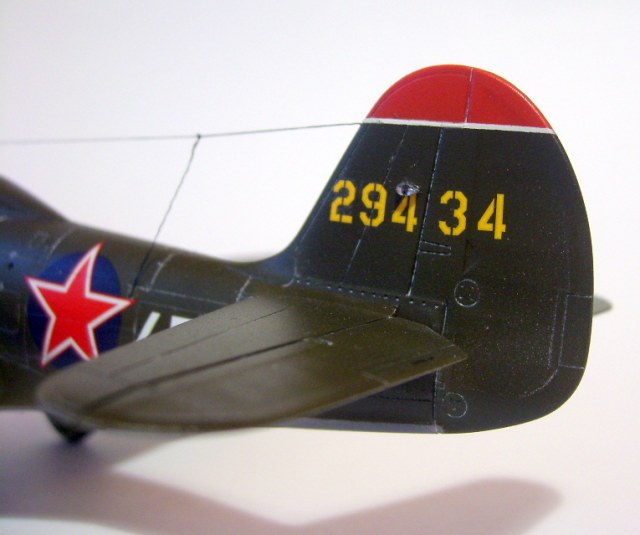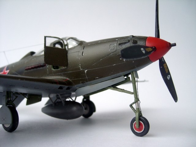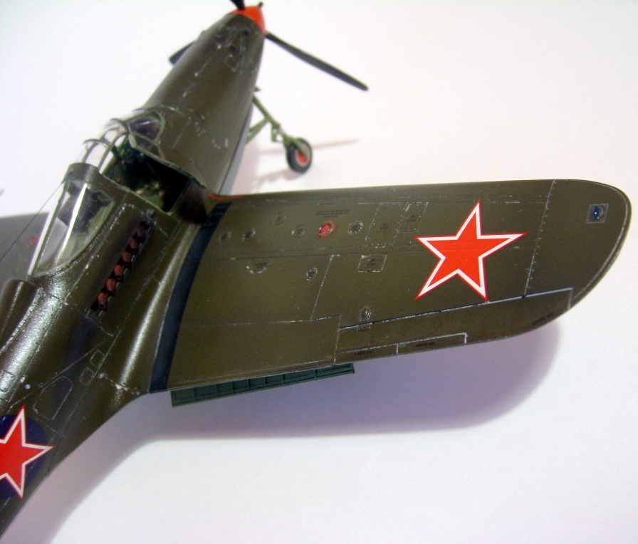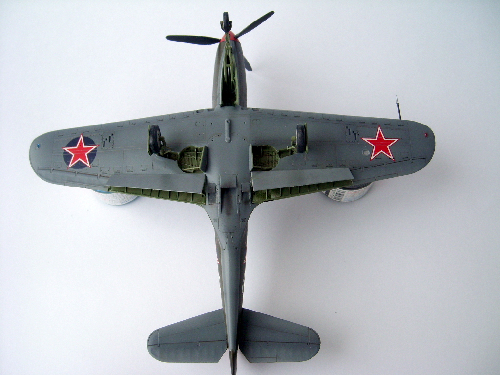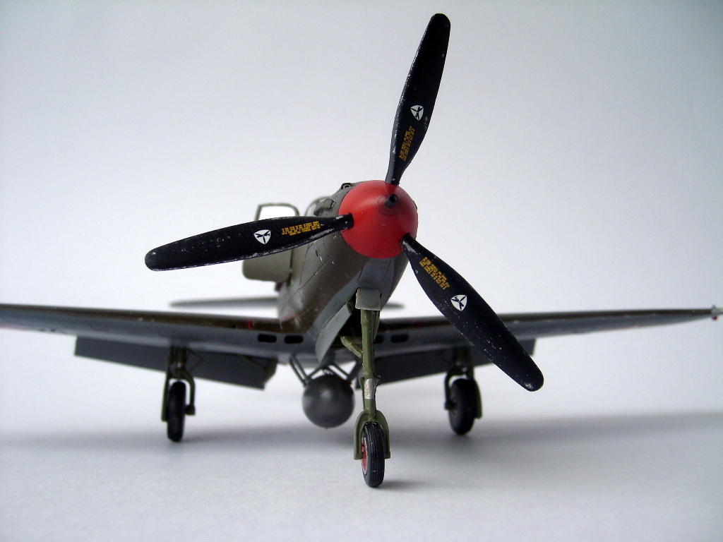Всё красилось акрилом Tamiya:кабина-Cockpit Green,ниши и закрылки-тоже,но с дабавлением Dark Green,прешейдинг-Dark Grey,низ-Netral Grey,верх-Olive Drab,сколы-Flat Alluminium.Верх частично высветлял добавляя по капле белого."Пилотку" и кок винта красил Аканом АII красный аэролак.Далее-слой футуры.После просушки-декали.Очень понравились декали Aeromaster,чего не могу сказать про Хасегавские-толстенная подложка приваривается с пятого раза,треть банки Solа извёл(для инфомации-тех.надписей от Хаси наклеено и приварено 82 штуки(!),занятие,прямо сказать,медитативное)...После-еще слой футуры.После просушки смывка(миговские),и еще глянца.Поставил закрылки,вклеил патрубки,натянул антенну.Финишный лак мешал на "глаз" из Х-22 и Х-21.Тонировка-сухие пигменты Tamiya.