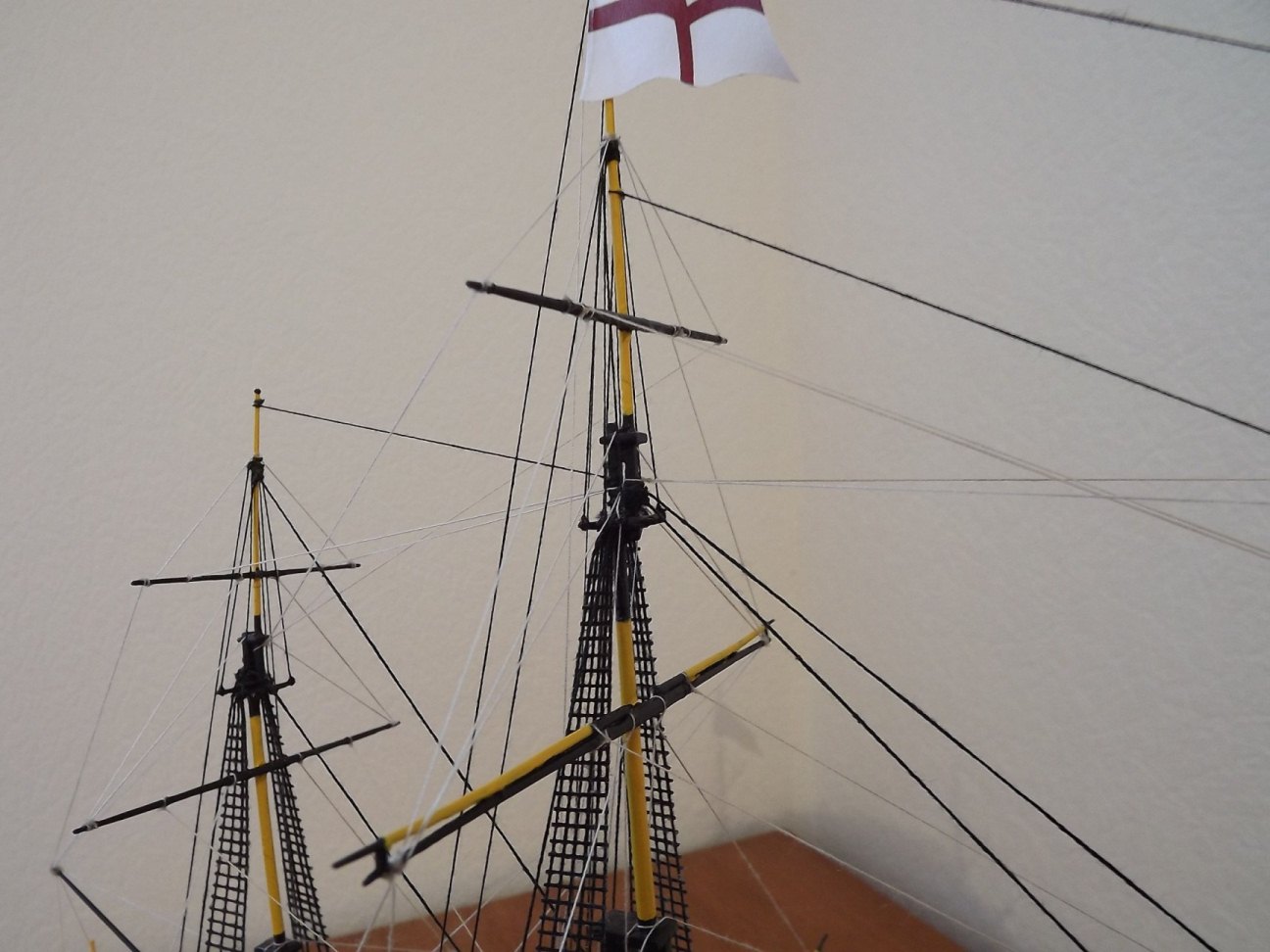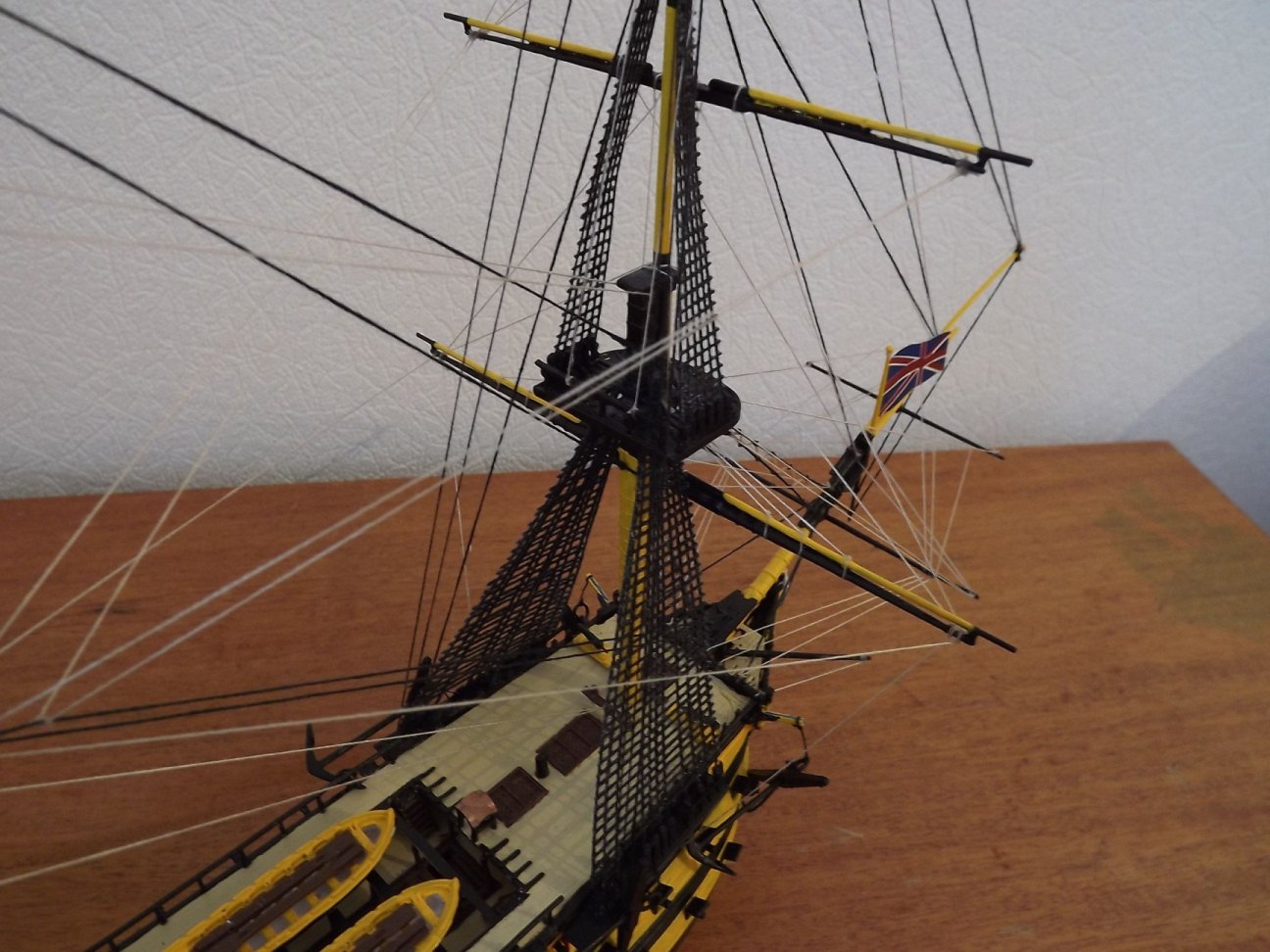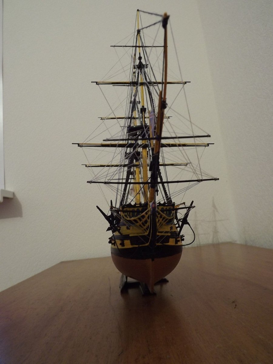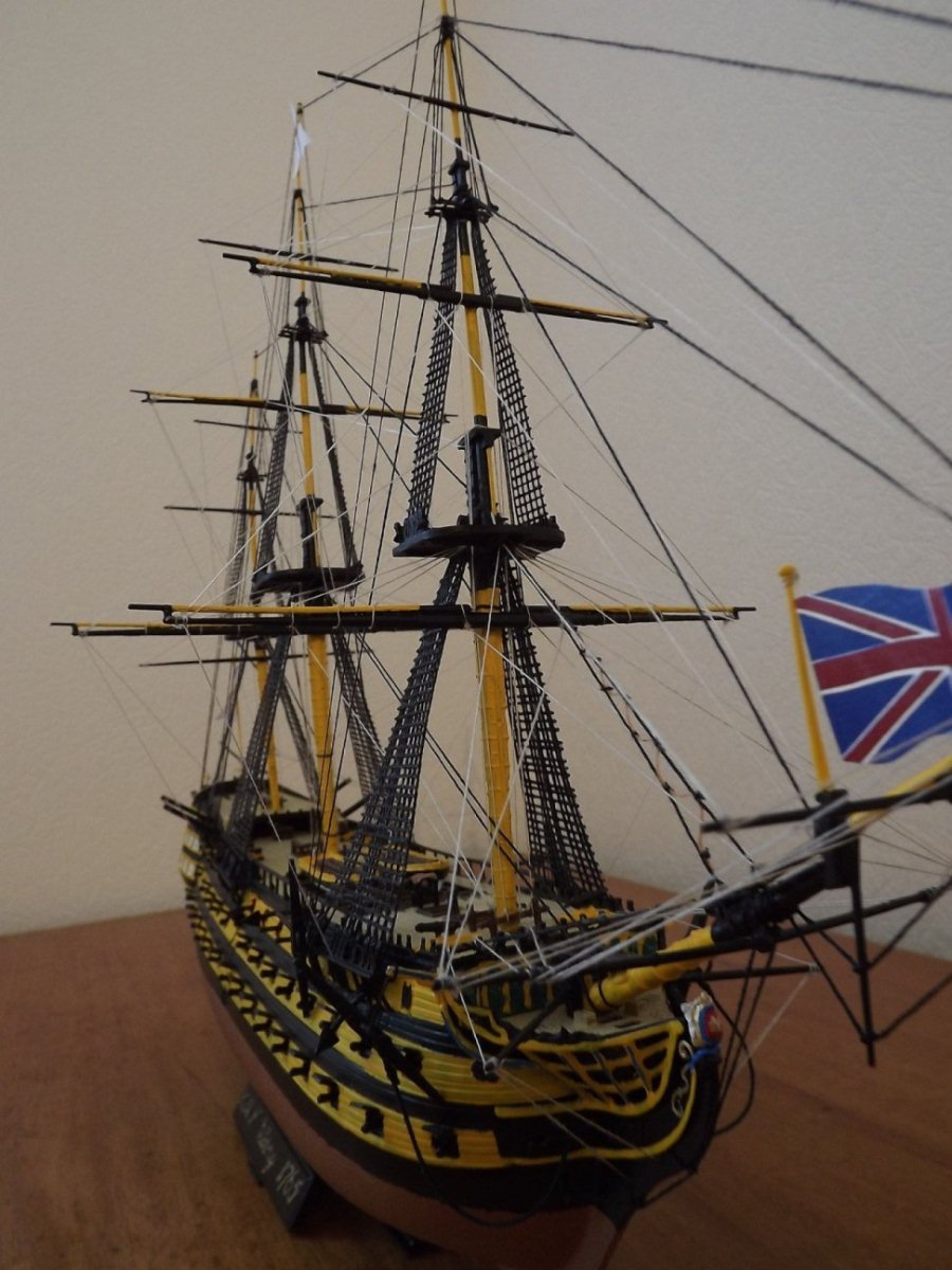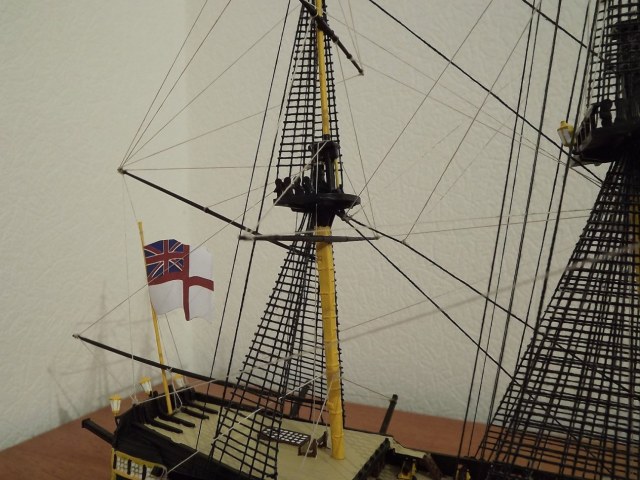 Дааа, соглашусь со всеми недостатками, указанными выше. Отсутствие блоков как бы совсем растворили такелаж.Даже с бисером модель бы смотрелась живее. На основных фото такелажа не видно, на тех фото, что добавили позже, поменялся фон и освещение. Такелаж стал виден подробнее, но и косяки сразу вылезли, тот же ворс на канатах. По окраске уже сказали, меня "зацепила" девственно-белая палуба, надо было хоть смывку сделать, обозначить щели обшивки.