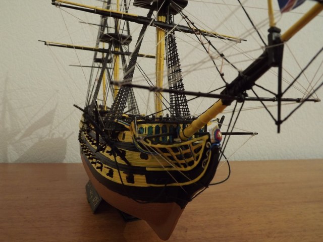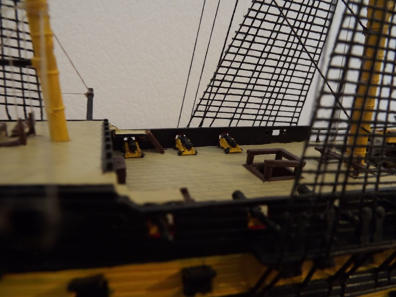 Уважаемые коллеги!Обратите внимание,что опыт у автора...оставляет желать лучшего.К этому присовокупилось качество Мамолиевской "информации".Масштаб 1/144 и бисер на блоки мягко говоря не катит,но можно было использовать крашеные капли клея или другие ухищрения,но для этого опять таки нужен опыт.Мачты пластиковые я бы рекомендовал сразу в мусор,особенно стеньги,брам стеньги и прочие утлегари.Только дерево.Бугели на мачтах красились в черное.Пушек на открытой палубе не так много и доработка их обязательно нужна.Саму палубу..ну уже говорилось.Кстати не советую сильно обращать внимание на то,что стоит в Англии.Такой новодел...В общем...новых успехов автору.И пожелание почитать-посмотреть.Даже в и-нете есть более достойная информация,чем Мамоли.