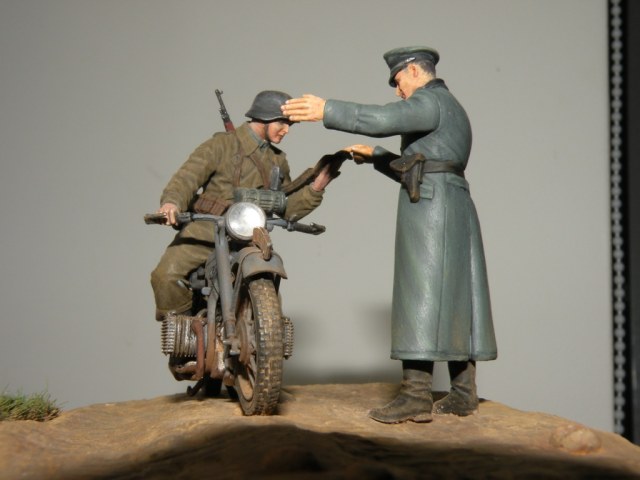По фигуркам - довольно аккуратно, но цвет воротника на шинели - темно зеленый, такой же околышек на фуражке, если фельджанжармы, то темно-коричневый (коллега Сварог прекрасно раскрыл эту тему здесь :http://karopka.ru/forum/forum194/topic11176/?PAGEN_1=9 ) , погоны рядового состава на офицере неуместны, цвет прорезиненного плаща мотоциклиста тоже не верен - см. фото. Выпушки на погонах - то же косяк, соответственно