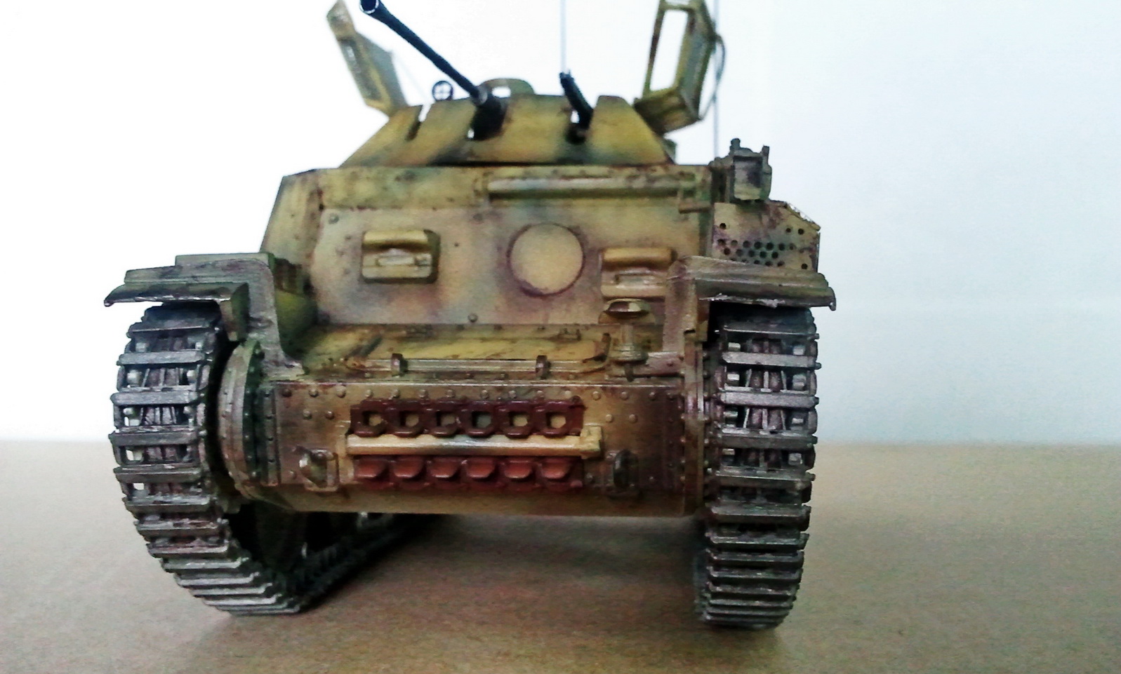 Лежит такая же модель, ждет своего часа. Сделано неплохо, но вот сколы и, наверное, брызги грязи как-то сливаются и вид корпуса, особенно с кормы, кажется каким-то рябоватым. А вот каски не должны быть блестящими и не должны иметь рисунок-эмблему. Фрицы перестали красить каски в блестящий цвет с 1940 г., тогда же отменили эмблемы на них. Правда, в тыловых частях некоторые ухари наносили эмблемы и натирали каски маслом, но это каралось...А здесь машина разведподразделения и блестящие каски с эмблемами в таких подразделениях - нонсенс.