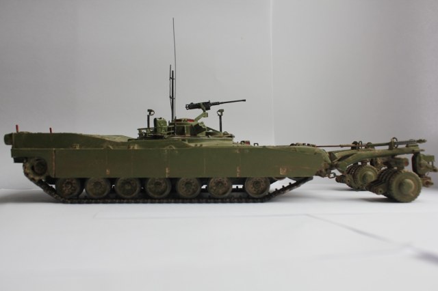 Доброго времени суток . Решил показать давно сделанную инженерную машину на базе абрамса . По качеству набор не очень , но радует разнообразие возможных модификаций ( 5 в 1 ). Покупал из расчёта сделать абрамс , но оказалось что в наборе ОТСУТСТВУЕТ половинка ствола , из-за чего пришлось сделать этот тральщик . Собирал давно , опыта в использовании пигментов и смывок не было , так что впервые на тот момент были использованы пыль от MIGа и ржвчина от Валеджо . Красил кистью . Краска нитро от Mr.Color . Сейчас уже доводить до ума её не охота , так как интереса к этой модели как не было так и нет .На мой взгляд модель на галерею не особо тянет , так что заранее в "песок" кинул , а дальше уже решать Вам . В общем смотрите что вышло . С уважением .