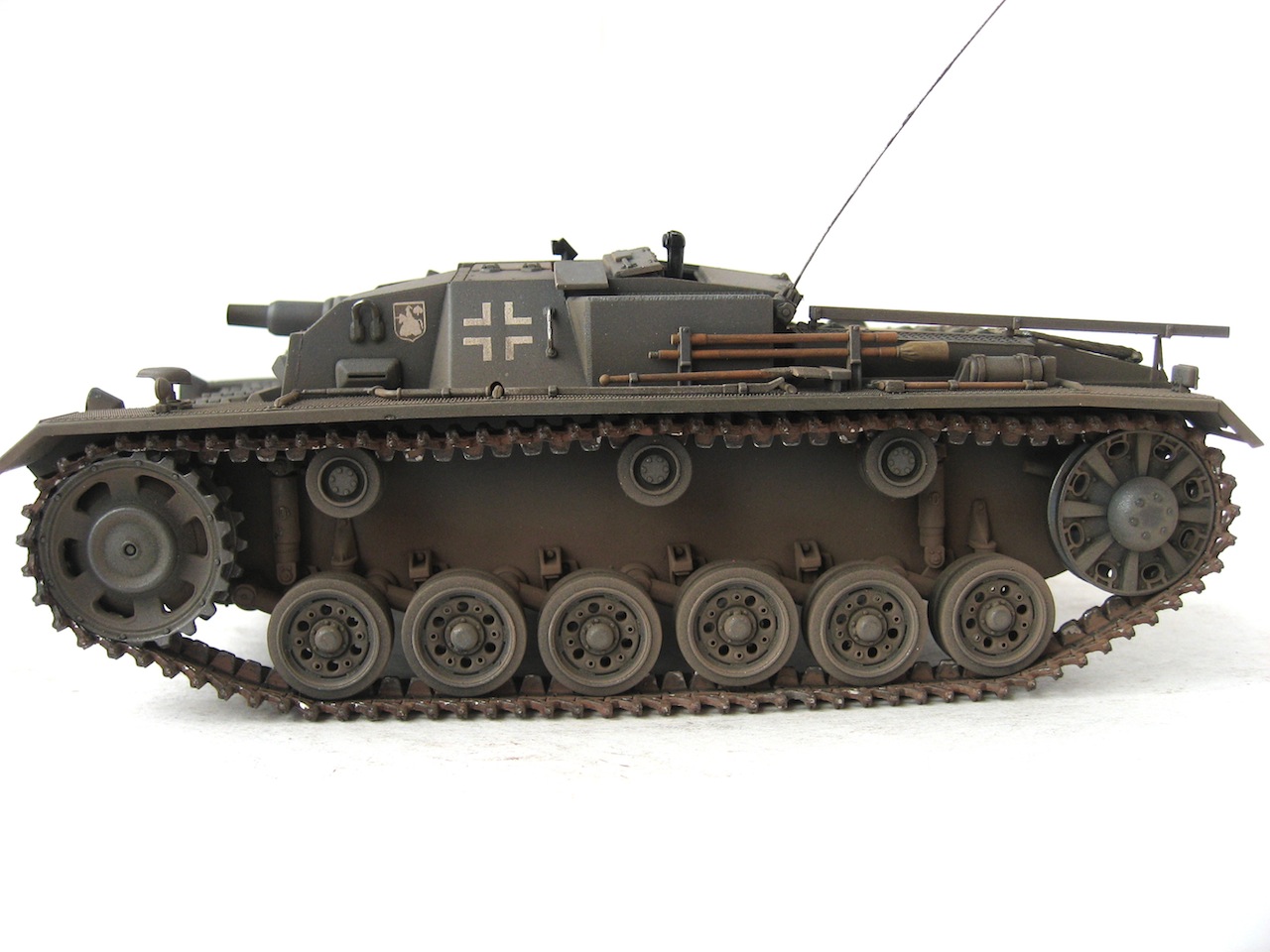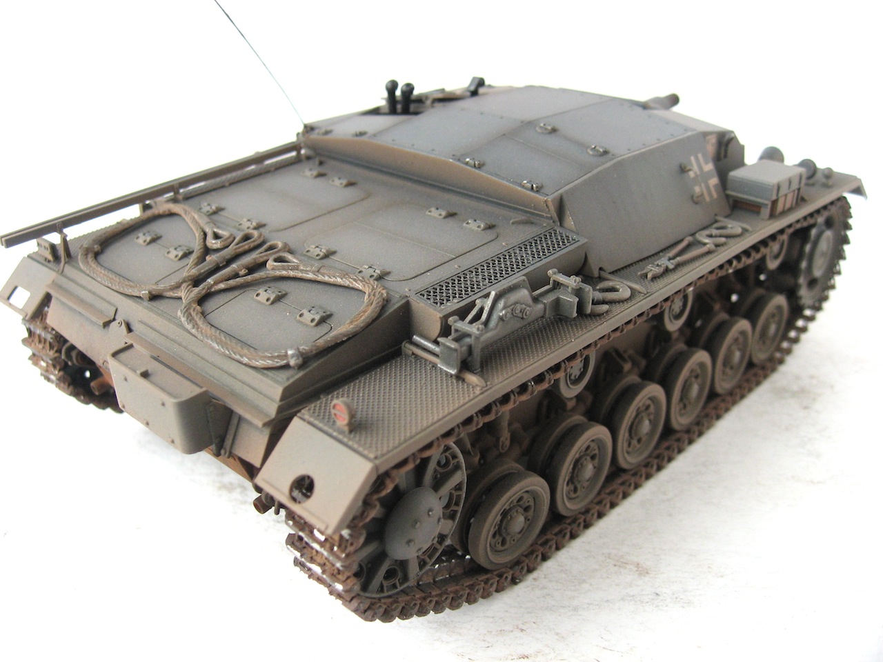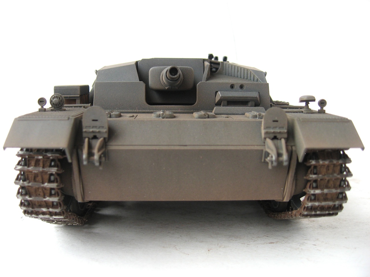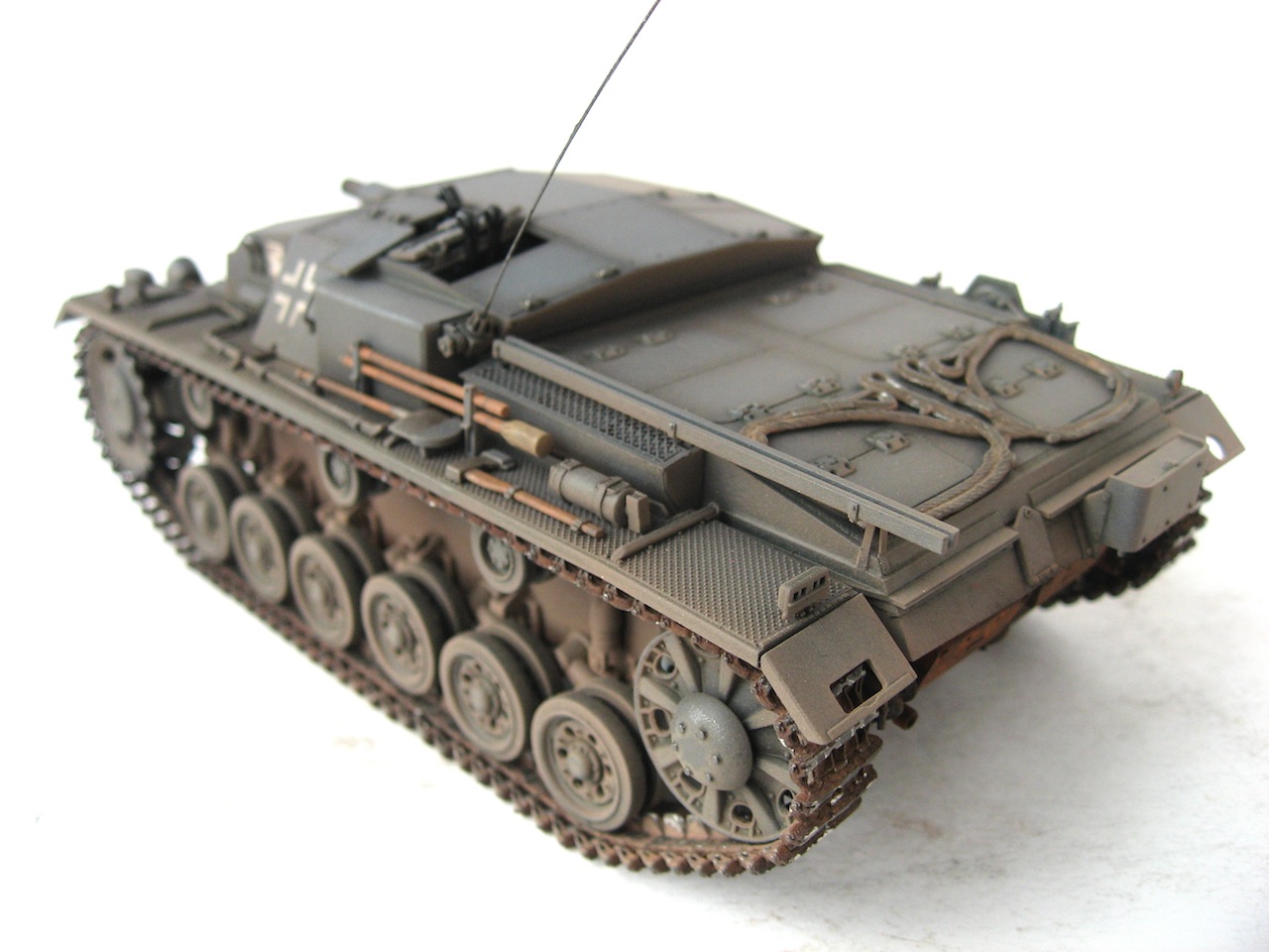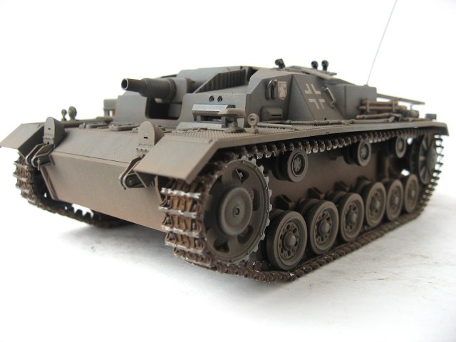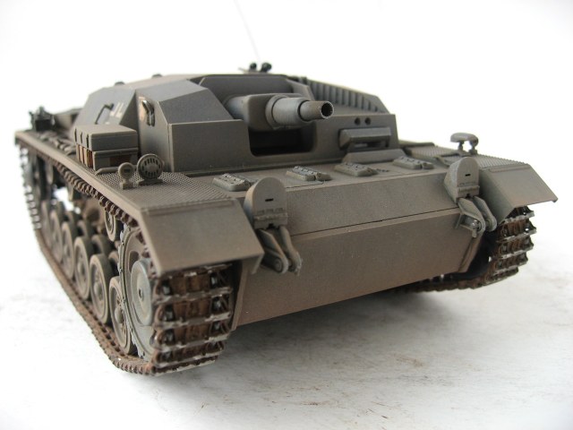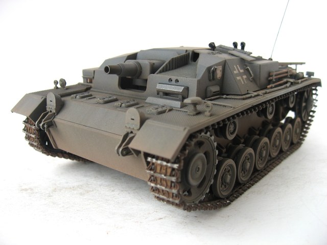 Очень я люблю ранние Stug III. У самого такой лежит, пока не собранный. Работа хорошая. Только тросы лучше заменить, уж очень заметно, что они прессованные. И так и не рассмотрел, лампочки на конвойных огнях (левое заднее крыло), покрашены в зеленый цвет ???