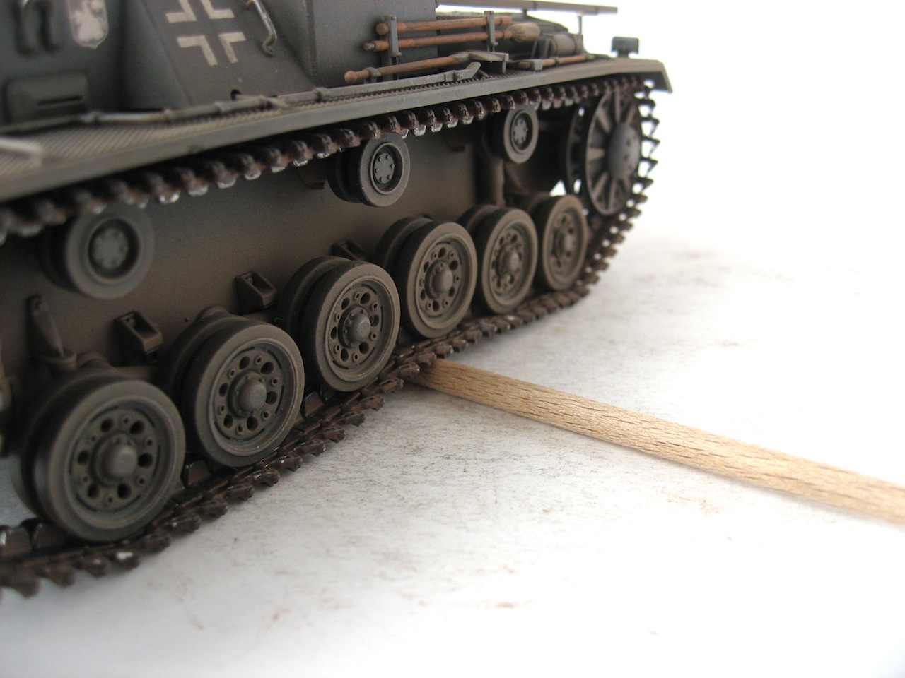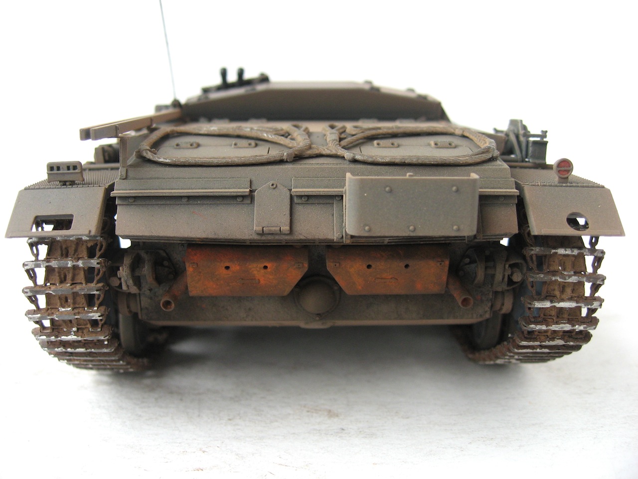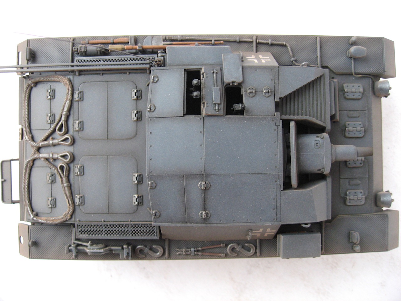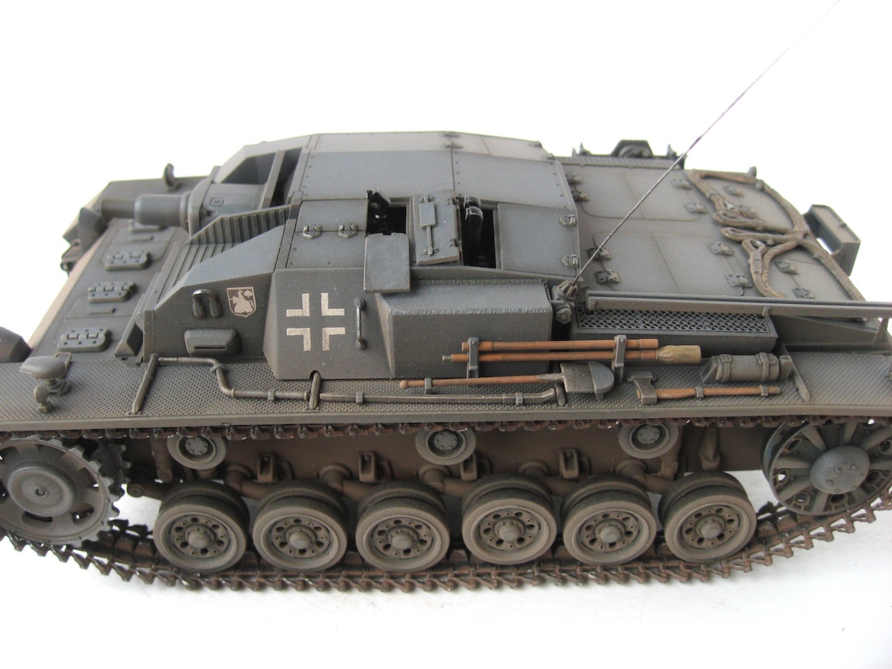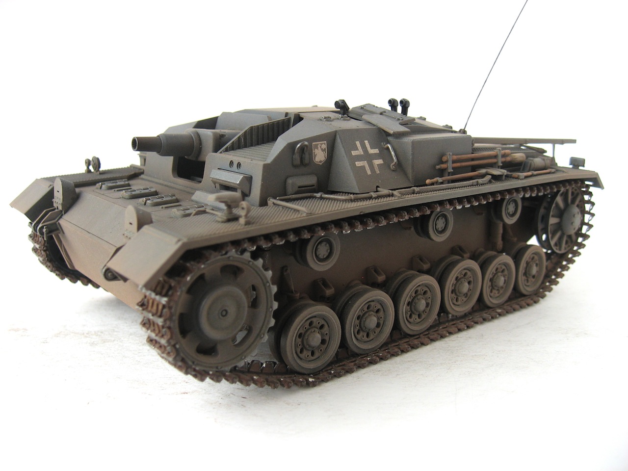 Очень я люблю ранние Stug III. У самого такой лежит, пока не собранный. Работа хорошая. Только тросы лучше заменить, уж очень заметно, что они прессованные. И так и не рассмотрел, лампочки на конвойных огнях (левое заднее крыло), покрашены в зеленый цвет ???