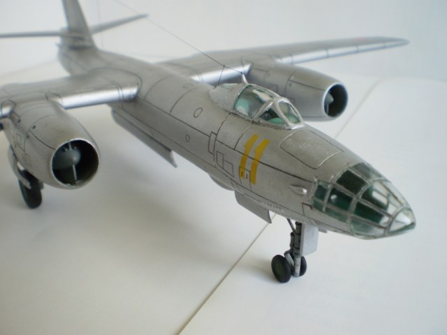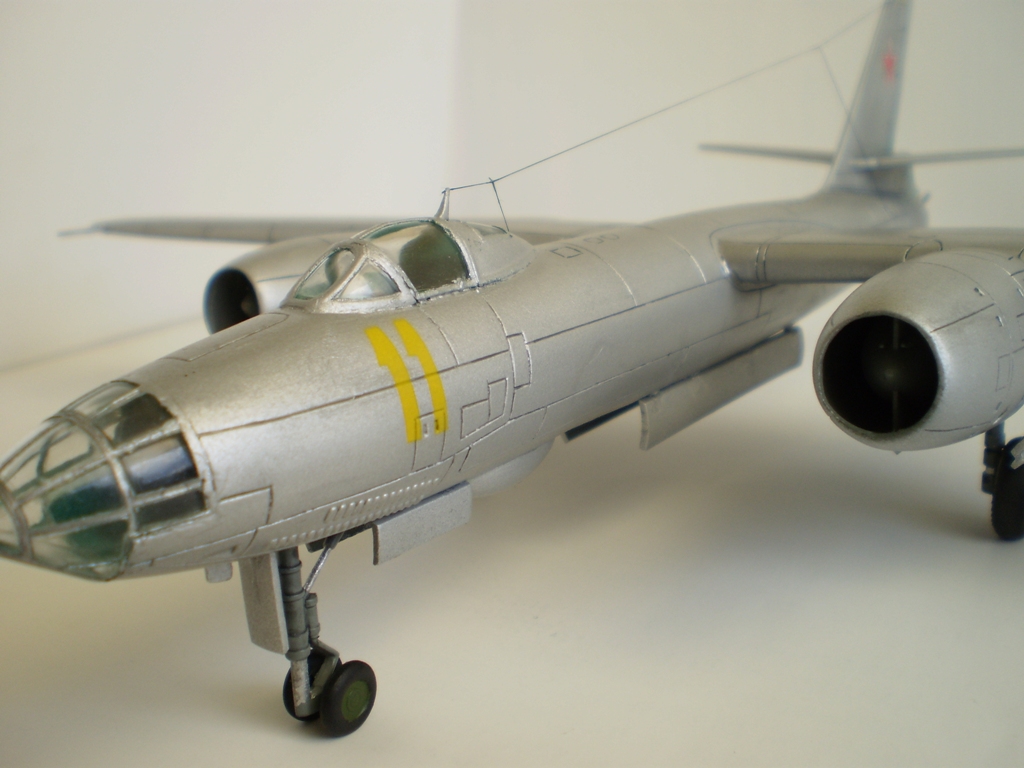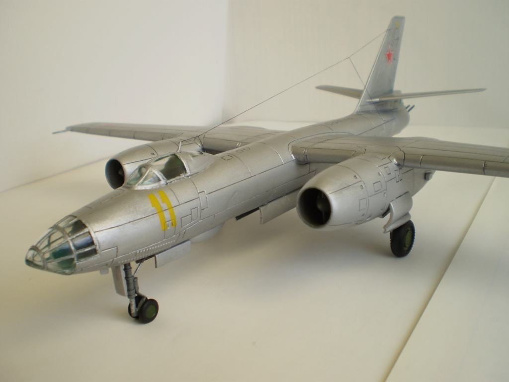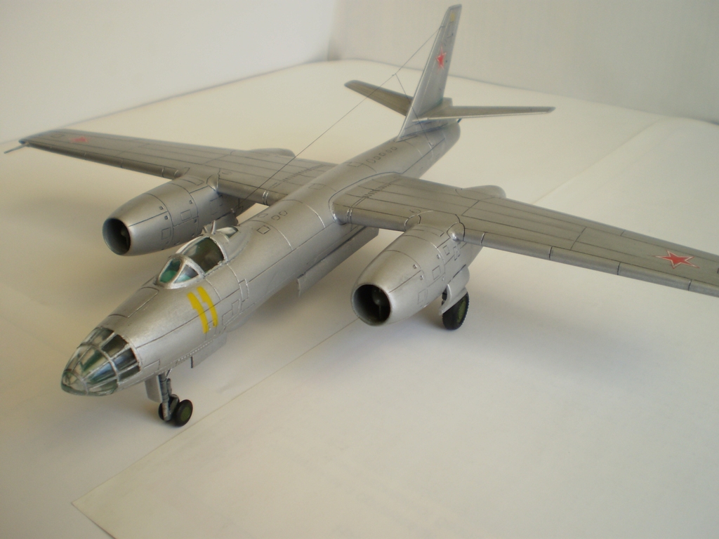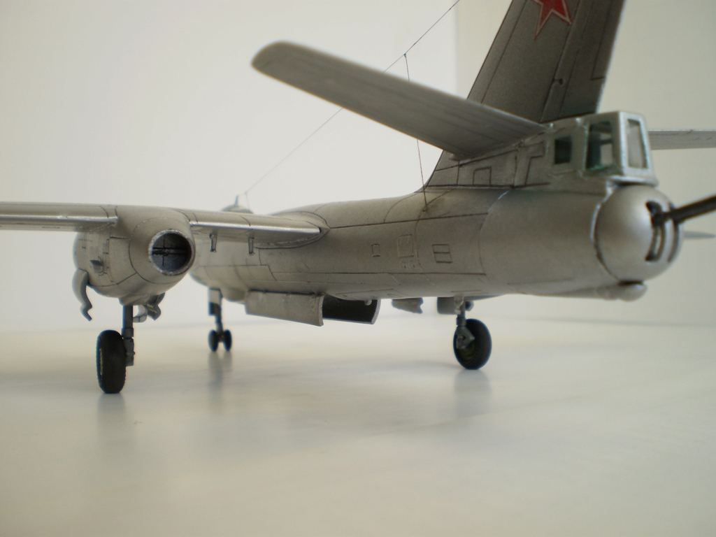 Исходный набор приобретен мною в первых числах ноября 2011 года. Это хорошо всем известный «Трумпетер»…Трубач… Труба одним словом. Не откладывая покупку в долгий ящик, в ближайшие же выходные приступил к работе. Мягко говоря был разочарован стыкуемостью отдельных элементов набора. Ужасно проходил процесс сборки мотогондол с нишами шасси. Огромные щели пришлось заделывать серой шпаклёвкой «Тамия». Места стыковки консолей крыла с фюзеляжем то же заставили изрядно потрудиться. Ступеньку в местах стыковки убирал при помощи надфилей и наждачной бумаги. Местами в процессе сборки был уничтожен крой, пришлось его восстанавливать. Все работы по сборке, с учётом перерывов на поиск вдохновения, растянулись на пять месяцев. Активная фаза – примерно месяц. На особые доработки в процессе не решился. Из таковых: ПВД из иглы от шприца и антенна - нить от разрушенных капроновых колготок. Попытался изобразить листовой эффект при помощи алюминиевого скотча на отдельных панелях. До накладывания финишного слоя лака он (листовой эффект) был довольно хорошо заметен… Красил модель при помощи компрессора и аэрографа, краски – водорастворимый акрил «Тамия» и «Хобби колор». Основной – XF – 16 “Flataluminum”, ниши шасси и бомболюк XF – 25 “Lightseagrey” (мешанный, оставшийся от Ан-12). Интерьер – Н -46 “Emeraldgreen”. ОЗ – штатные звёзды от «Трубача». Сделал смывку по классической схеме «гуашь + Фейри». Финиш – полуматовый лак «Bosny». Б\н «11 желтый», самолёт 91 ОКРАЭ, в/ч 22614, г. Шамхор, Азербайджанская ССР. В 1967-1968 годах в этой части проходил службу мой отец. Модель делалась с его слов. В дальнейшем под этим номером в г. Вазиани, Грузинской ССР был сформирован разведывательный авиационный полк. Номера наносились при помощи трафарета. Впечатления от сборки модели очень неоднозначные. Ну вот и всё. Что получилось – судить вам. С уважением!!!