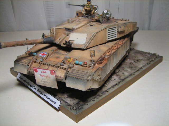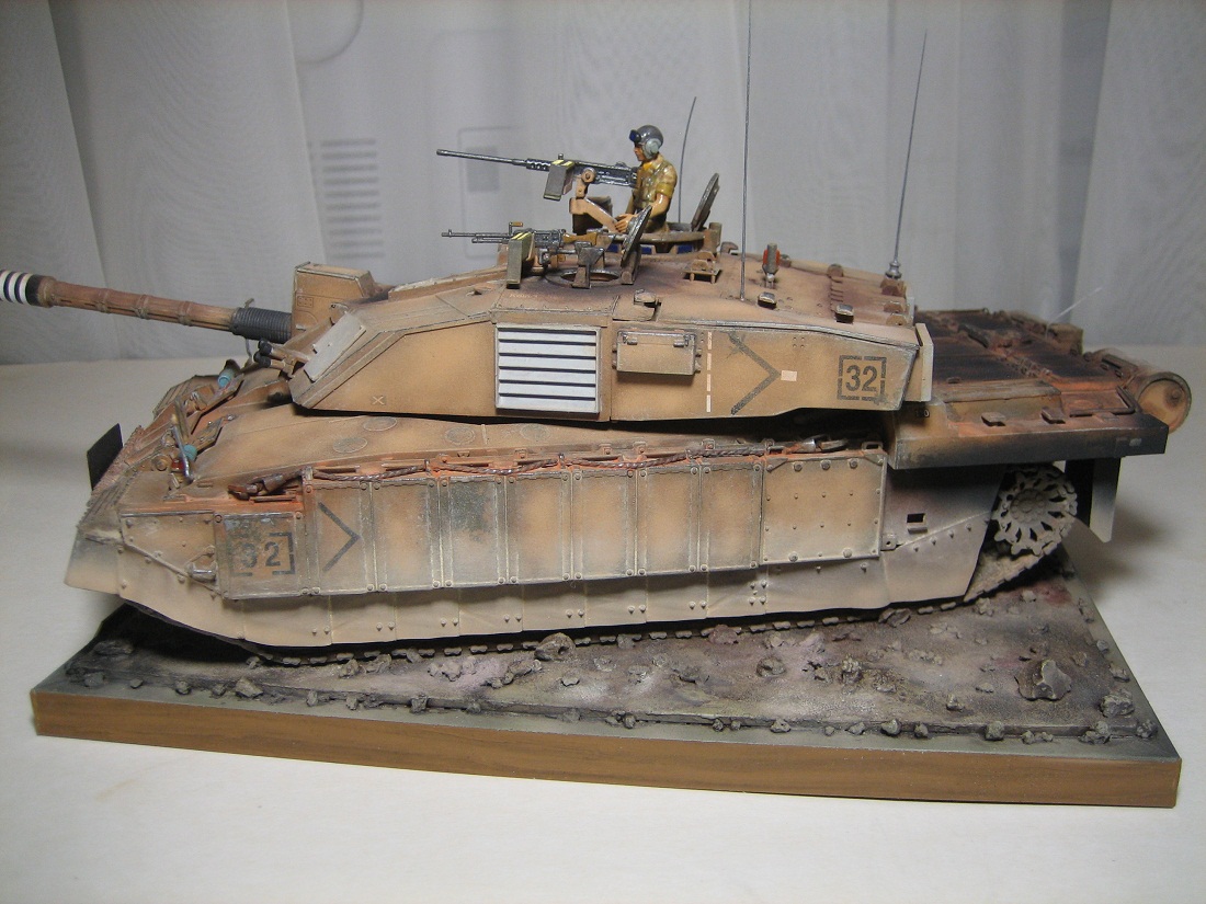 Привет всем :))) Вот доделал своего британца. Модель из коробки с некоторыми доработками: посадил танкиста ( на счет комка может и не очень точно, но ориентировался на фото ) , добавил 2-й пулемет ( ЗНАЮ-ЗНАЮ, что есть только 1, НО чисто теоретически во время войны 2003 г. могли же добавить 2-й :), на Абрамсы , ведь добавляли 3-й, над пушкой ), переделал фары, троса, добавил антены, канистру и трос сзади на катушку. Красил аэром-Тамией, смывка маслом, сухая кисть и запыление пигментами. Сижу в каске, жду отзывов :))).