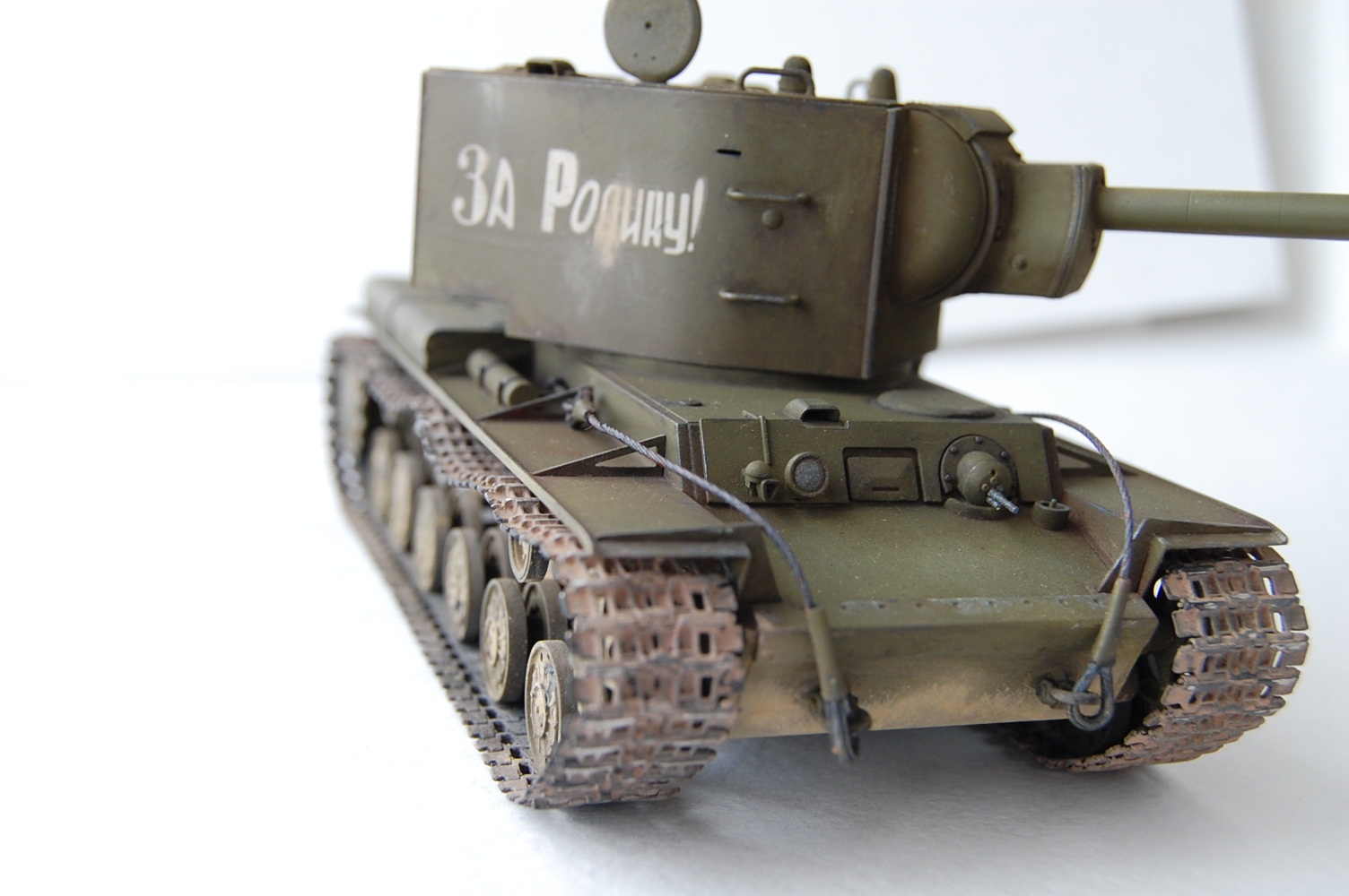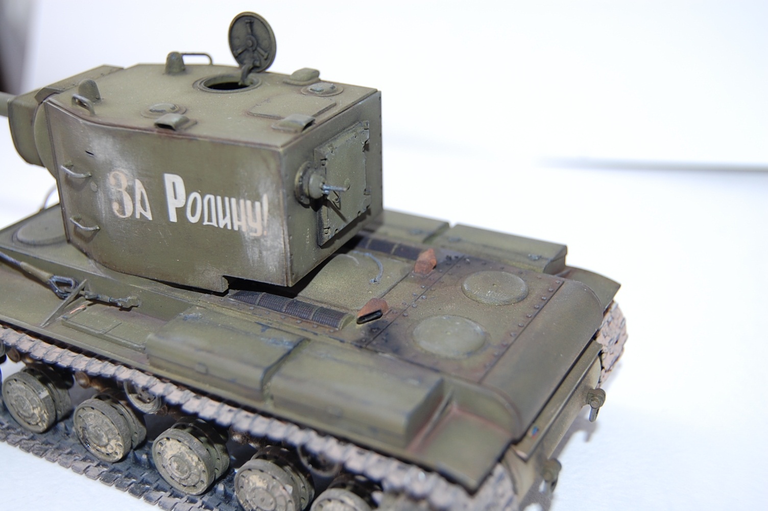 А что так мало фото? И обязательно надо хоть раз сделать снимок "с высоты человеческого роста", т.е. в Вашем случае - примерно ось объектива должна быть в 3,5 см от "земли". И декаль зря клеили - моделистам не известны живые КВ-2 с такой надписью. Стоило бы поработать по верху сухой кистью, какие-то потёки сделать - а то как-то неестественно ровно верх выглядит. А в целом - отлично, пока не прочитал комментарий, думал что это Тамия в 35-ом.