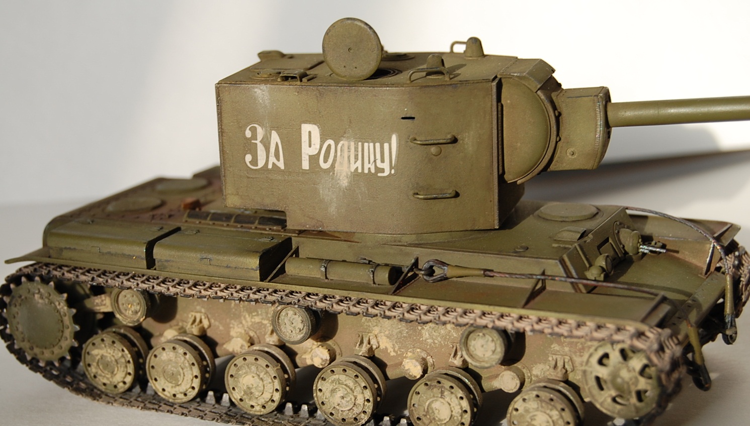 Доброго времени суток!. Кв -2 в 48 масштабе, для меня не привычном . Отдать должное Тамии сборка прошла на ура. покраска Акан. смывка Масло и пастель.Из доработок: заменил нитку на метал. тросы , наборные траки , и поручень на крышке люка. С уважением.