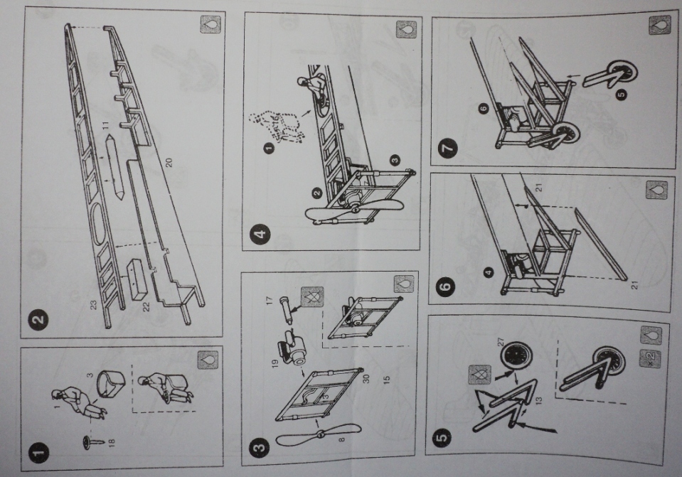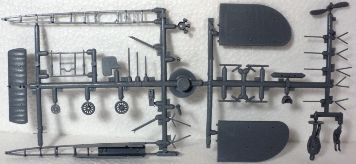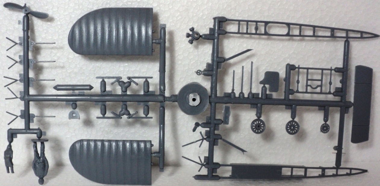 Самолетов Блерио XIбыло 10 модификаций, но даже и они различались формой хвостового оперения, хвостовыми опорами и моторами, и разобраться в этом многообразии довольно сложно. Восточноэкспрессовская модель представляет из себя экземпляр на котором Луи Блерио пересёк Ла-Манш. В коробке есть трёхцилиндровый двигатель Анзани, вышеупомянутые всевозможные реечки и неплохо отлитые спицованные колеса, которые за 50 с лишним лет ещё не потеряли свою форму. Детали фюзеляжа сплошь покрыты пупырышками и ощетинились литьевым браком в виде штырьков. А вот два штырька из фермы фюзеляжа отсутствуют – недолили…