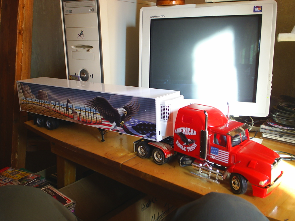 вот .. откопала ))).. фото далекого 2004 года .. модель была собрана примерно на годик раньше .. модель не красилась .. просто собрана и нанесены деки .. до сих пор радуюсь , как аккуратно приляпала их на прицеп .. прицеп весь в пупырышках и ребрах и тем не менее ни одного пузырька .. фото было сделано по поводу испытания загрязнения .. безобразного к слову )))).. фотографировала на чудо инженерной мысли самсунга - мыльница на 3.7 мпикселей с цифровым зумом ..