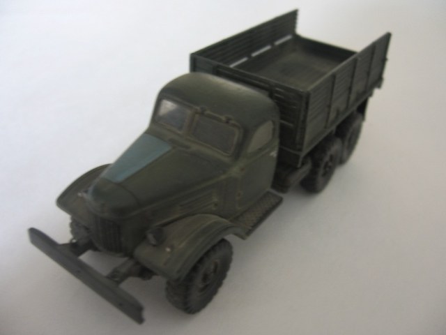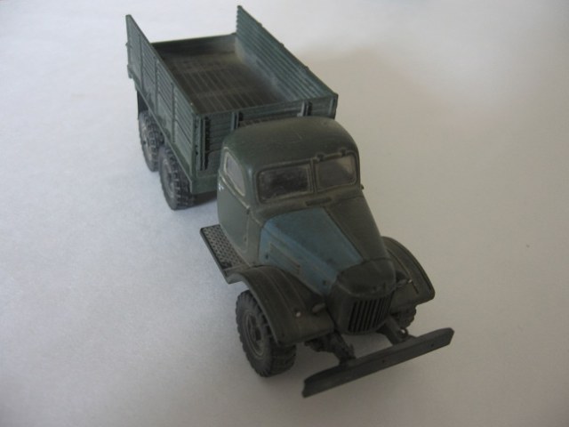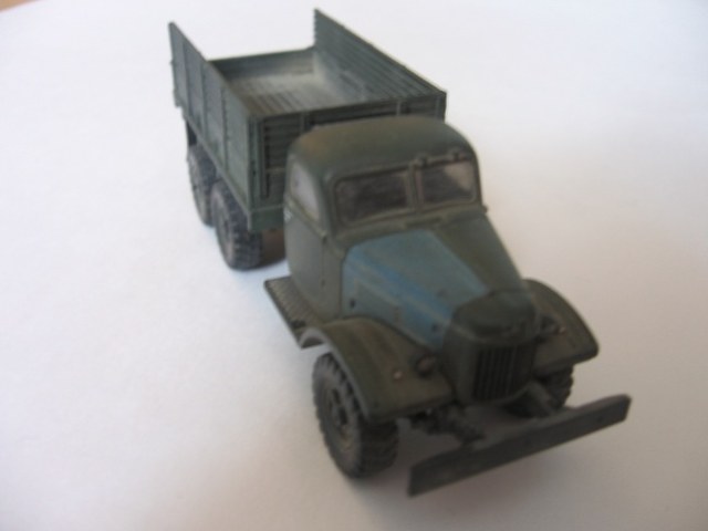 Очень неплохо начато,но-недоделано.А именно-отсутствуют зеркала, дворники,брызговики,задние фонари,замки капотов(при наличии отверстий их поставить-дело 5 минут),совершенно зря окрашены в жолтый передние габ.фонари,ручки дверей можно бы подчеркнуть металлом(даже карандашом-уже лучше будет),запаска-слишком глубоко и смещена назад,нет замков(крючков)заднего борта,ну и-передний мост...