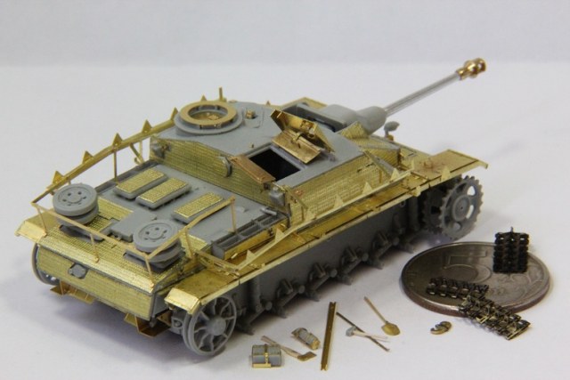 шикарна проработка мелочевки и обвеса,особенно понравились дощечки сзади!классно даже по меркам более крупных масштабов,значит волшебный уменьшительный порошечек все таки помог)))наверное пока что лучшая модель штуг3 из бтт72 из мною виденных!