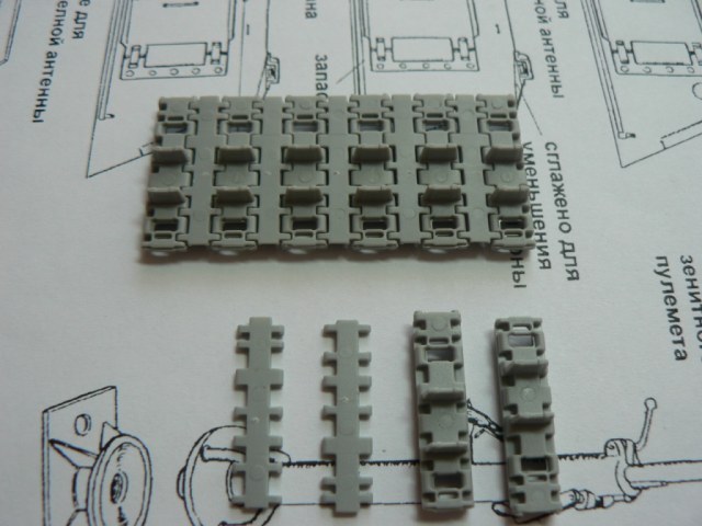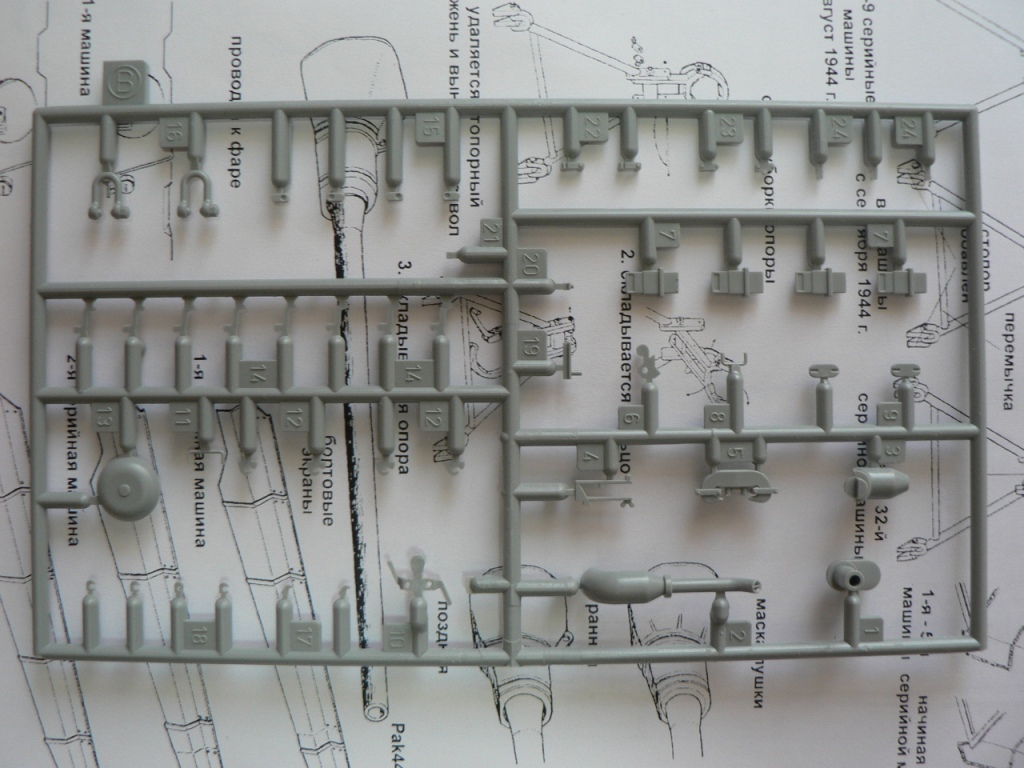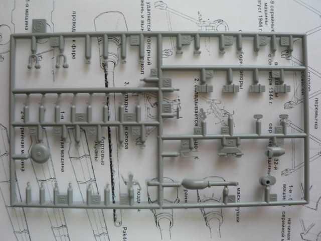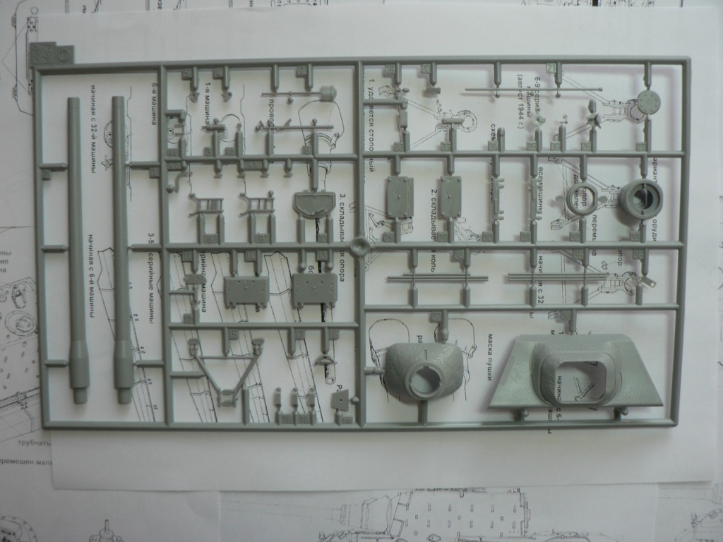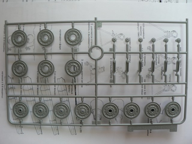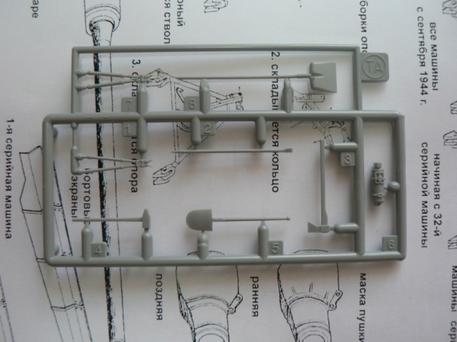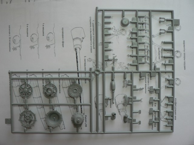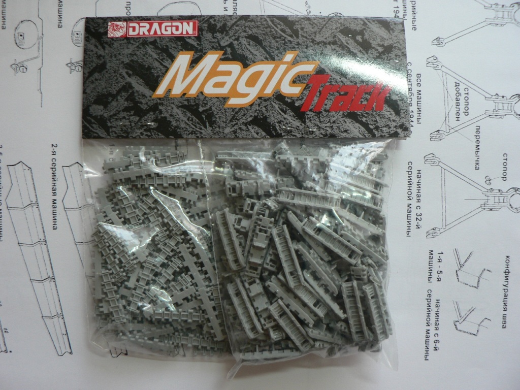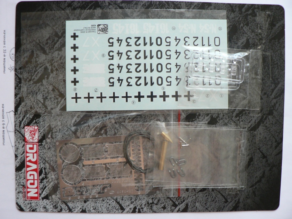 В коробке из плотного картона с обыкновенной для Драгона тоненькой легкомнущейся крышкой находятся 12 литников (без маленьких прозрачных) с наивысочайшим качеством исполнения. Ни облоя, ни утяжин, ни следов толкателей (кроме траков), ни сдвигов пресс-форм в этом наборе нет. Поверх всех литников лежит лист картона с «вкусными бонусами» Такими как травленые решетки, прозрачные перископы, два металлических троса, металлические буксировочные серьги, точеный ствол (к сожалению, без нарезов) и точеный латунный снаряд. Инструкция больше стандартного А4 в длину на 5 см. Состоит она из 4 листов и 21 шага по постройке. Инструкция трехцветная, черно-белая + синий. Декаль хорошего качества, на 6 вариантов. Конечно же, два пакетика «Магических траков» (к которым придется применять магический надфиль, для удаления следов толкателей)