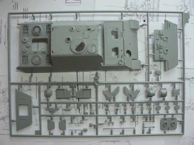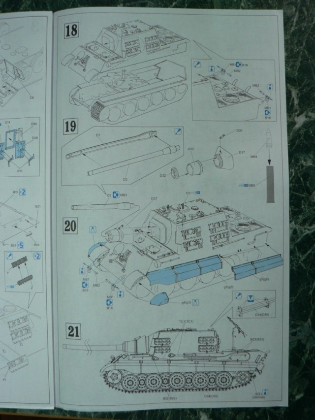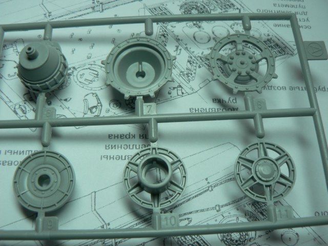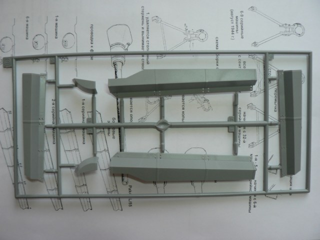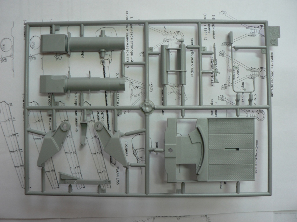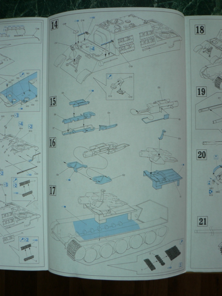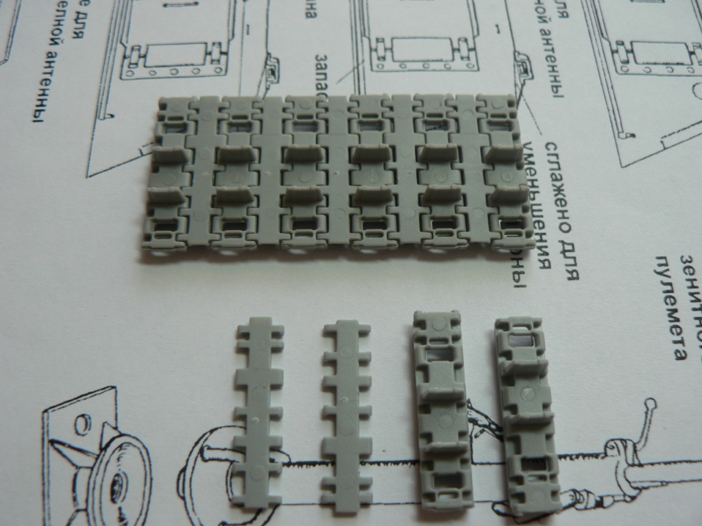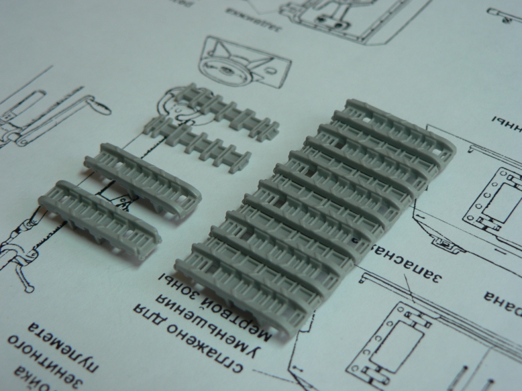 В коробке из плотного картона с обыкновенной для Драгона тоненькой легкомнущейся крышкой находятся 12 литников (без маленьких прозрачных) с наивысочайшим качеством исполнения. Ни облоя, ни утяжин, ни следов толкателей (кроме траков), ни сдвигов пресс-форм в этом наборе нет. Поверх всех литников лежит лист картона с «вкусными бонусами» Такими как травленые решетки, прозрачные перископы, два металлических троса, металлические буксировочные серьги, точеный ствол (к сожалению, без нарезов) и точеный латунный снаряд. Инструкция больше стандартного А4 в длину на 5 см. Состоит она из 4 листов и 21 шага по постройке. Инструкция трехцветная, черно-белая + синий. Декаль хорошего качества, на 6 вариантов. Конечно же, два пакетика «Магических траков» (к которым придется применять магический надфиль, для удаления следов толкателей)