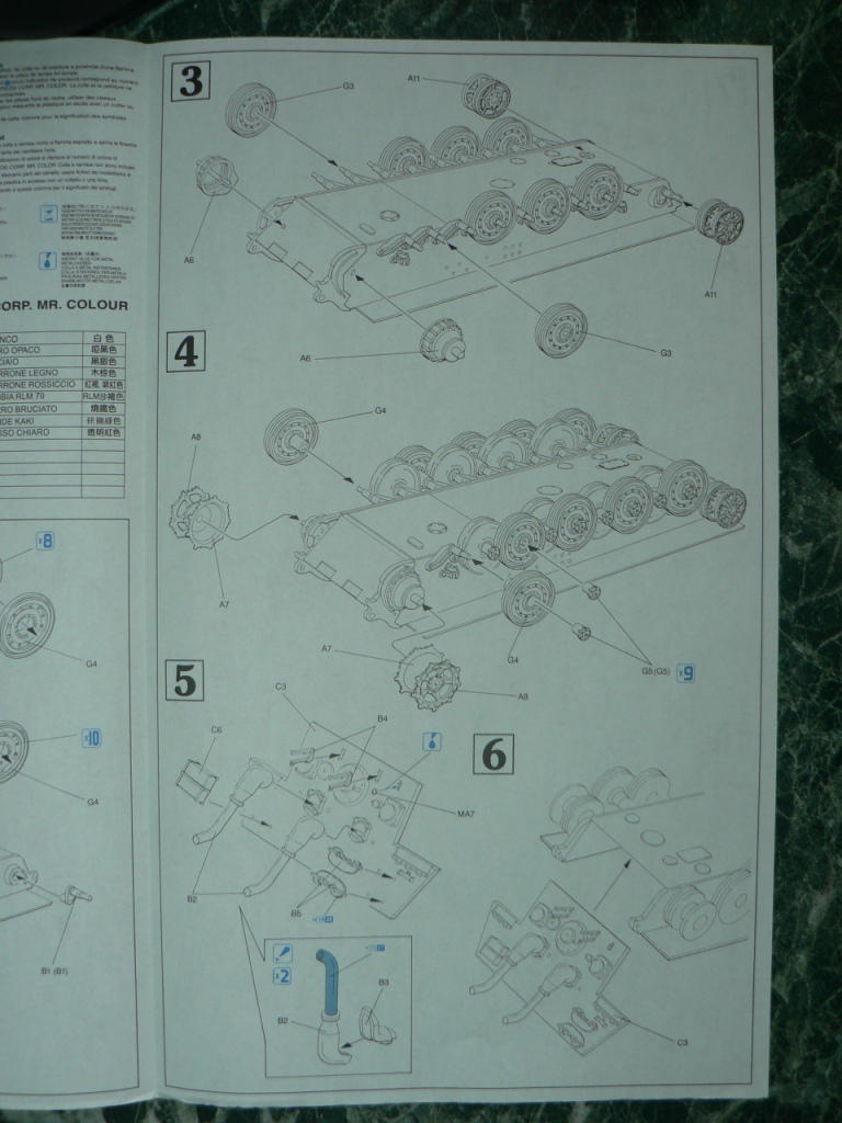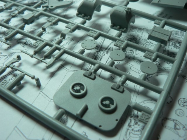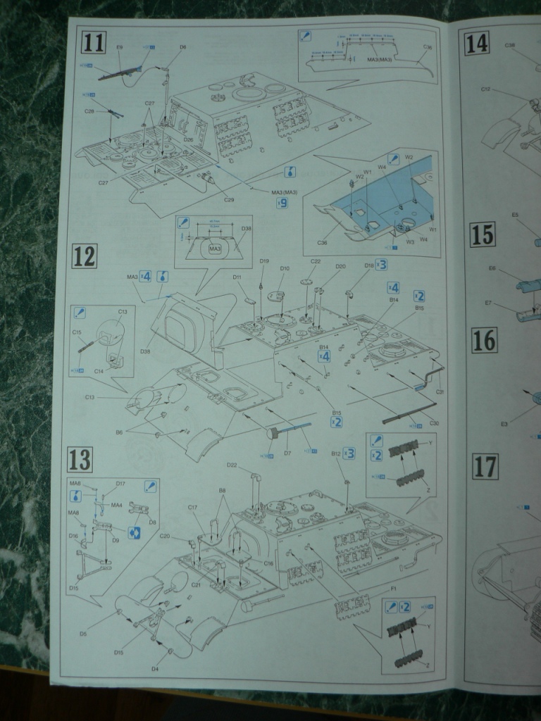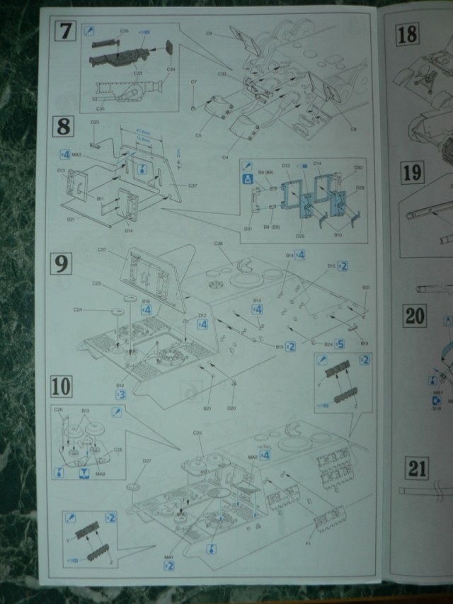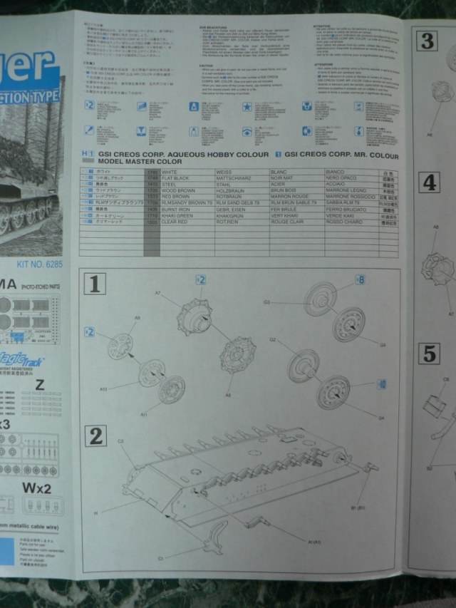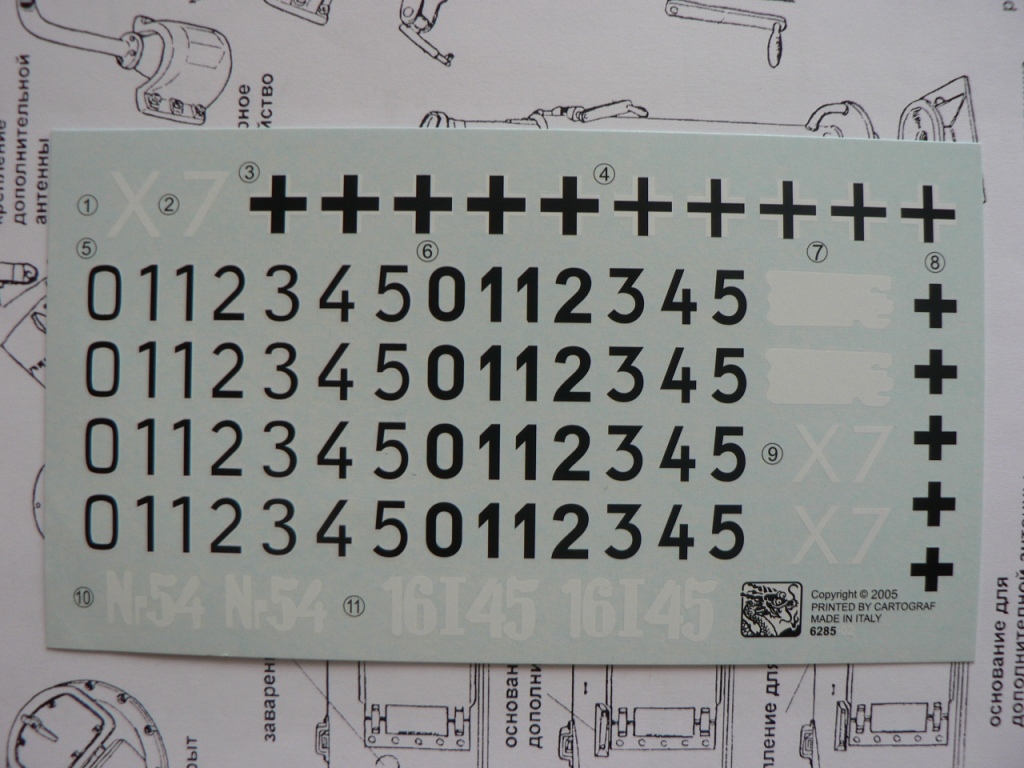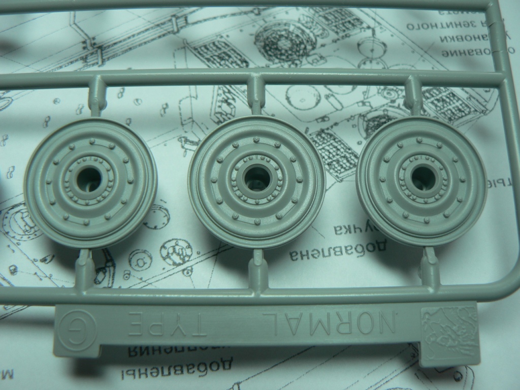 В коробке из плотного картона с обыкновенной для Драгона тоненькой легкомнущейся крышкой находятся 12 литников (без маленьких прозрачных) с наивысочайшим качеством исполнения. Ни облоя, ни утяжин, ни следов толкателей (кроме траков), ни сдвигов пресс-форм в этом наборе нет. Поверх всех литников лежит лист картона с «вкусными бонусами» Такими как травленые решетки, прозрачные перископы, два металлических троса, металлические буксировочные серьги, точеный ствол (к сожалению, без нарезов) и точеный латунный снаряд. Инструкция больше стандартного А4 в длину на 5 см. Состоит она из 4 листов и 21 шага по постройке. Инструкция трехцветная, черно-белая + синий. Декаль хорошего качества, на 6 вариантов. Конечно же, два пакетика «Магических траков» (к которым придется применять магический надфиль, для удаления следов толкателей)