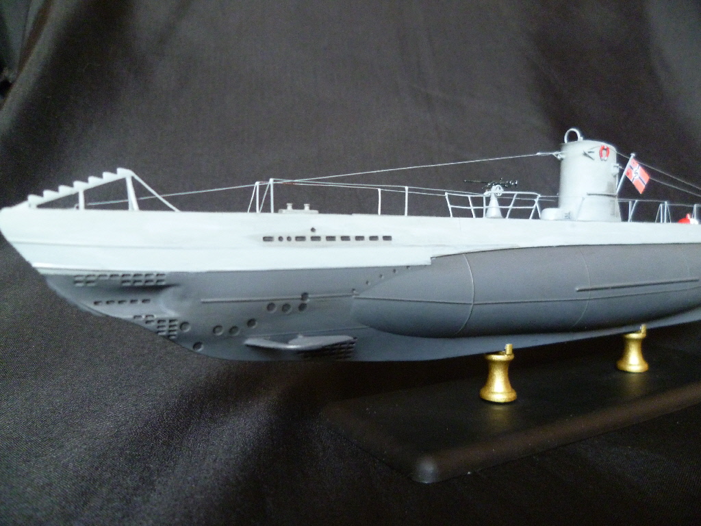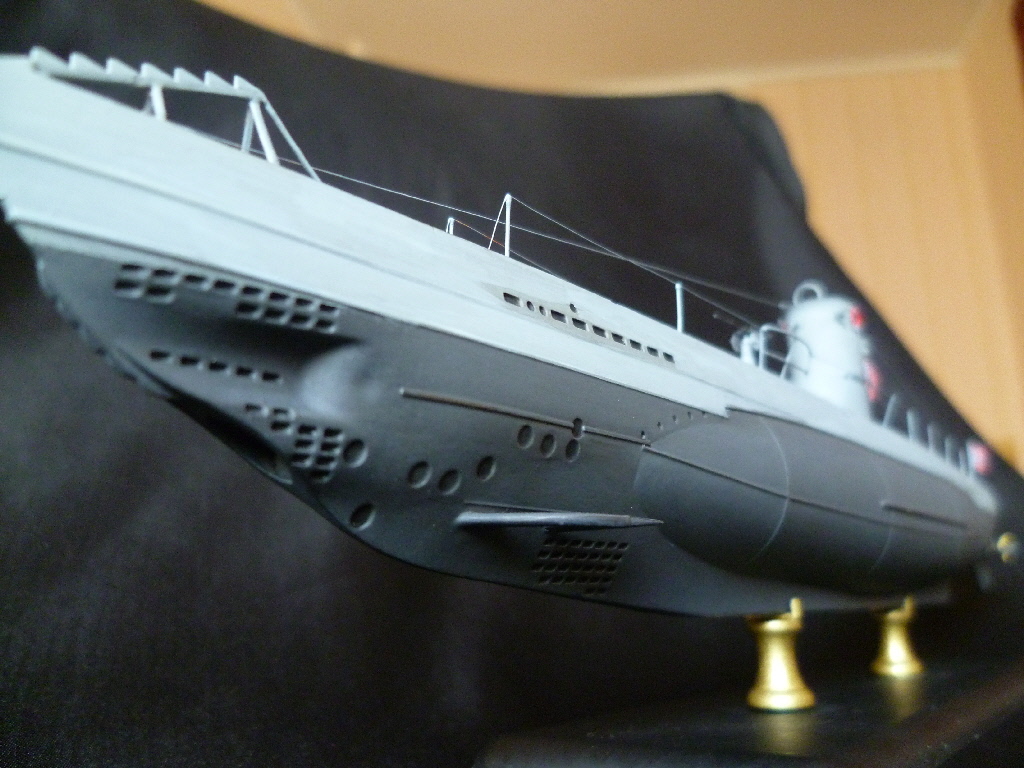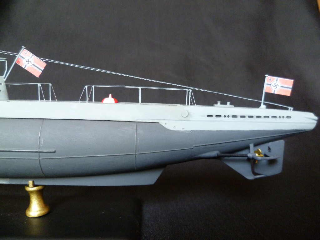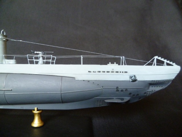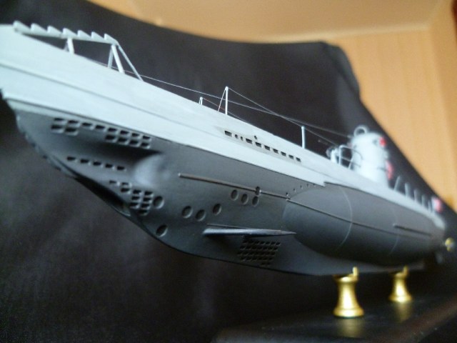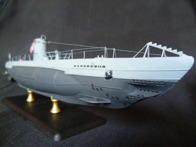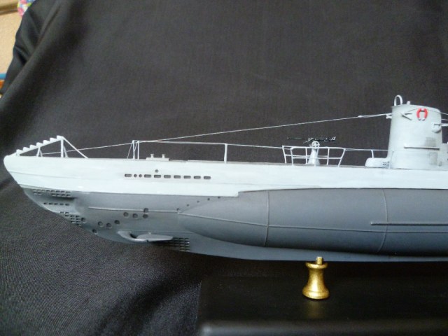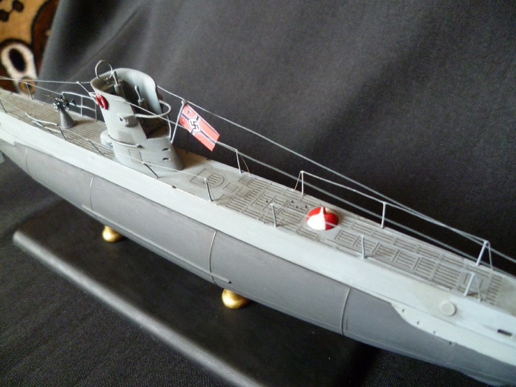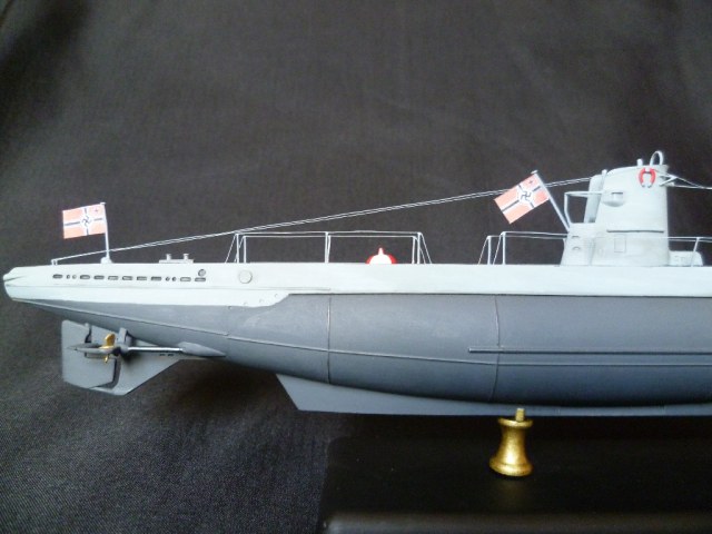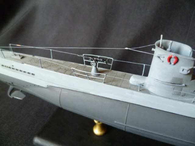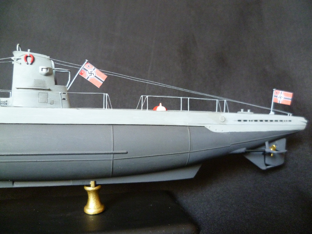 Имеются небольшие неточности: головки перископов-черные, датчики гидрофонов-цвет металла, круг антенны радиопеленгатора-черный. Вертлюг зенитного орудия на тумбе только с одной стороны.