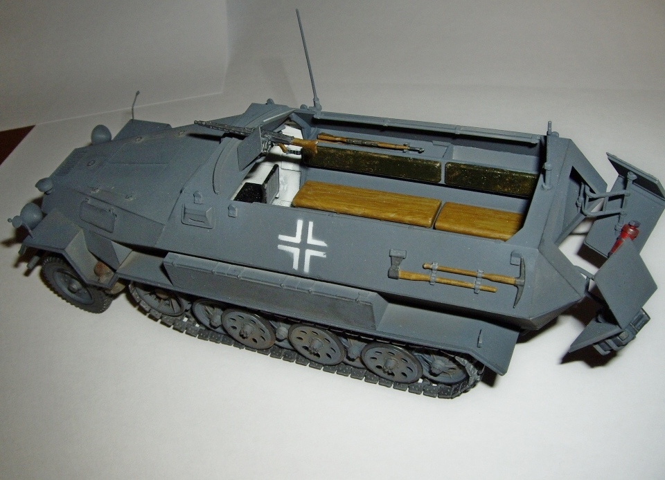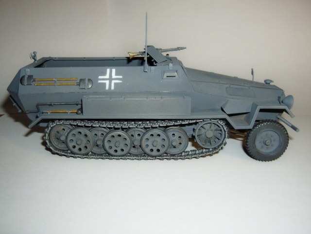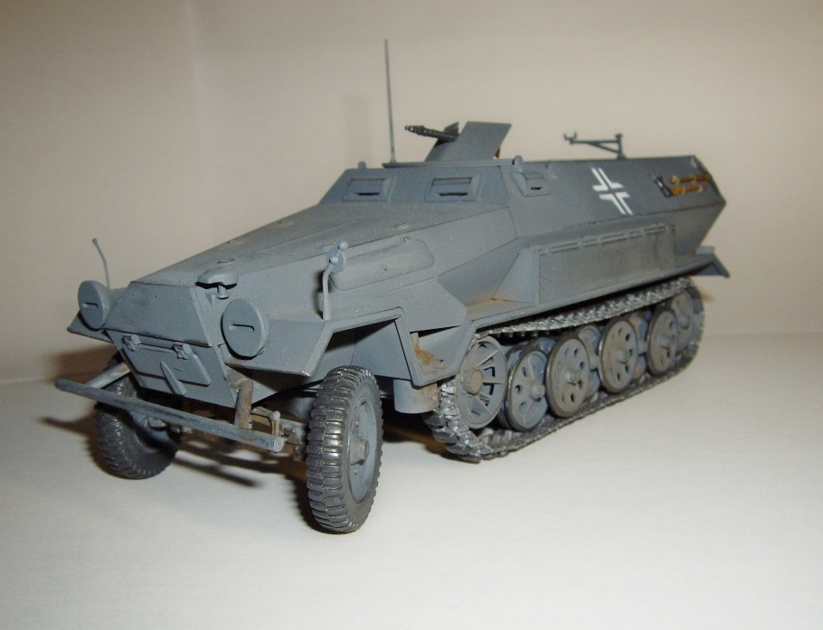 Бронетранспортёр от Звезды. Этот "кошак" собирался чисто из коробки, без исправления ошибок производителя. Наибольший интерес представляла сама гробообразная конструкция и сборка подвижной гусеницы( каждый трак состоит из трёх деталей). Красилась моделька красками Акан( нитро) аэрографом, корпус кресты через трафарет и ( кистью) водным-Старая резина. Ревел- дерево. Звезда- траки. Тонировка- грифель, земляная пыль (натуральная), ржавчина (натуральная). До сих пор не пойму, какого цвета у немцев были огнетушители. Из дополнений, прорезал жалюзи на верхней бронеплите.