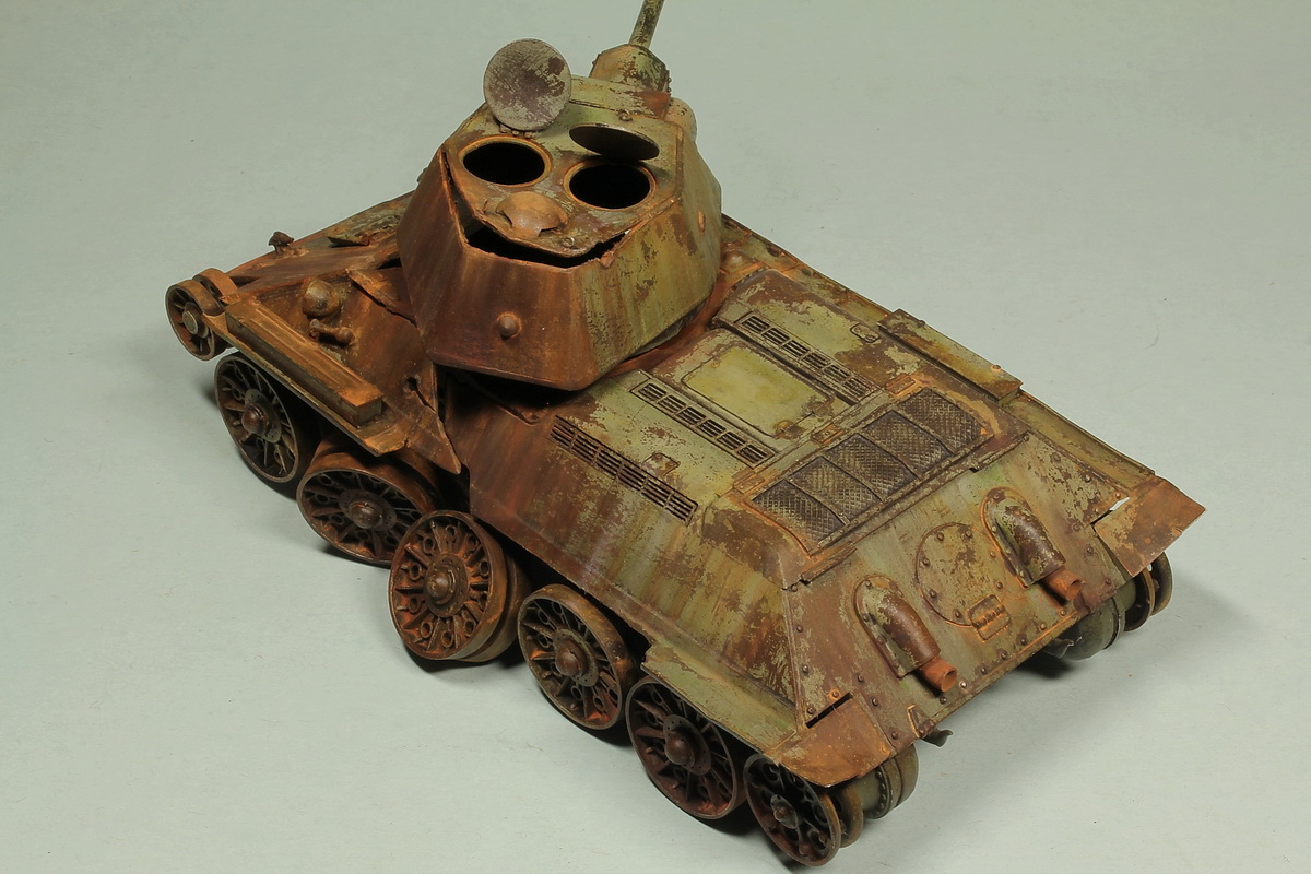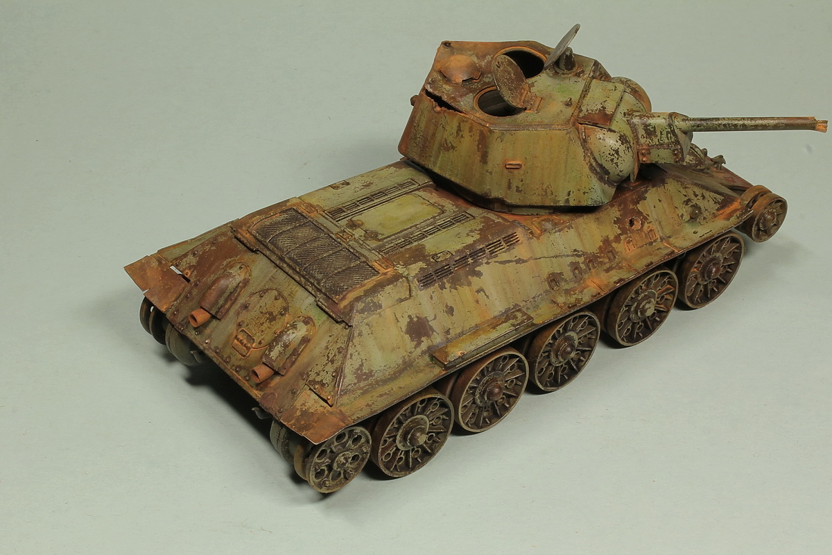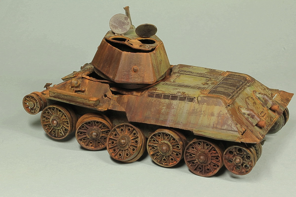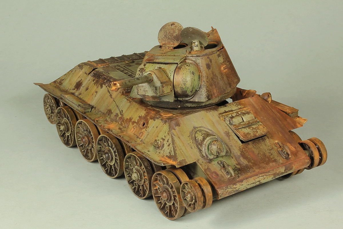 По поводу давно ржавеющей машины. Если вы утверждаете, что машина стояла давно, она вся должна стать рыжей. Как-то избирательно она горит и ржавеет. На вашей модели сохранилась большая площадь чистой, не копченой и не горевшей краски. Очень четкие границы "пожара", проходящие по обитаемому отделению. ВЛД справа от люка мехвода, девственно чиста. Она как минимум не могла не закоптится. Еще один богатый источник дыма, пробоина в правом борту, под сияющей краской башней. Ну и взрыв совершивший такие деформации, непременно вышиб перегородку в моторный отсек, а это такой дымоход. Больше похоже не геббельсовскую пропаганду. Плеснули бензин на уголок и подпалили. Ну и линейность наложения ржи или обгорания краски, не добавляет естественности машине.