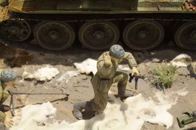 Вопрос скорее к Тамии,зачем бежать за танком с ПТР и ДШК?А диорама скорее напоминает раннюю весну.Немного бы ракурс съемки поудачнее выбрать,чтобы эффект присутствия был.Ну,а в целом неплохо вышло,за исключением нюансов.