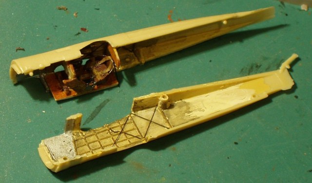 ФЮЗЕЛЯЖ пришлось немного переделывать. Передняя часть до кабины отказалась стыковаться вообще, в ход пошли куски пластика и замазка, после чего фюзеляж приобрёл свою форму. Были сформированы характерные «квадраты» вместо «полосок», нарощена толщина в хвостовой части для места под «окно» под стабилизатором, и собрана соответствующая прототипу конструкция костыля. Надлками поднял высоту гаргрота для придания характерной ступеньки перед стабилизатором. Сымитировал шнуровку и различные лючки. Добавил имитацию окантовок на отверстиях под тяги.